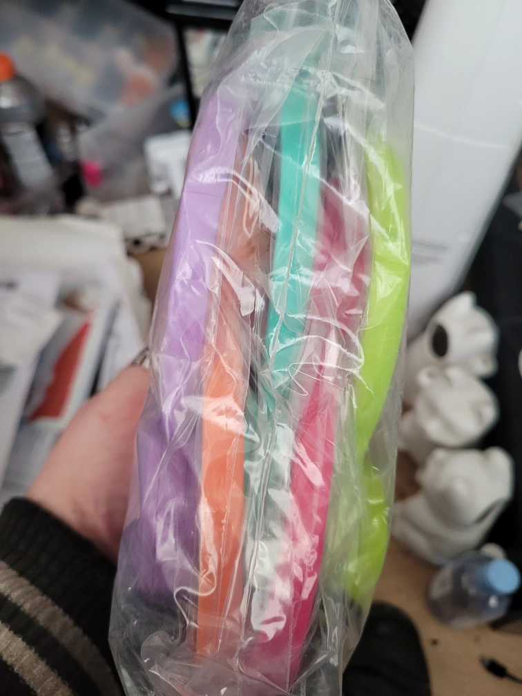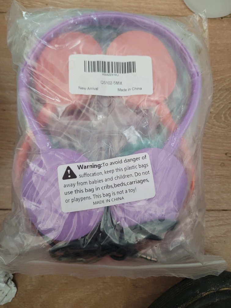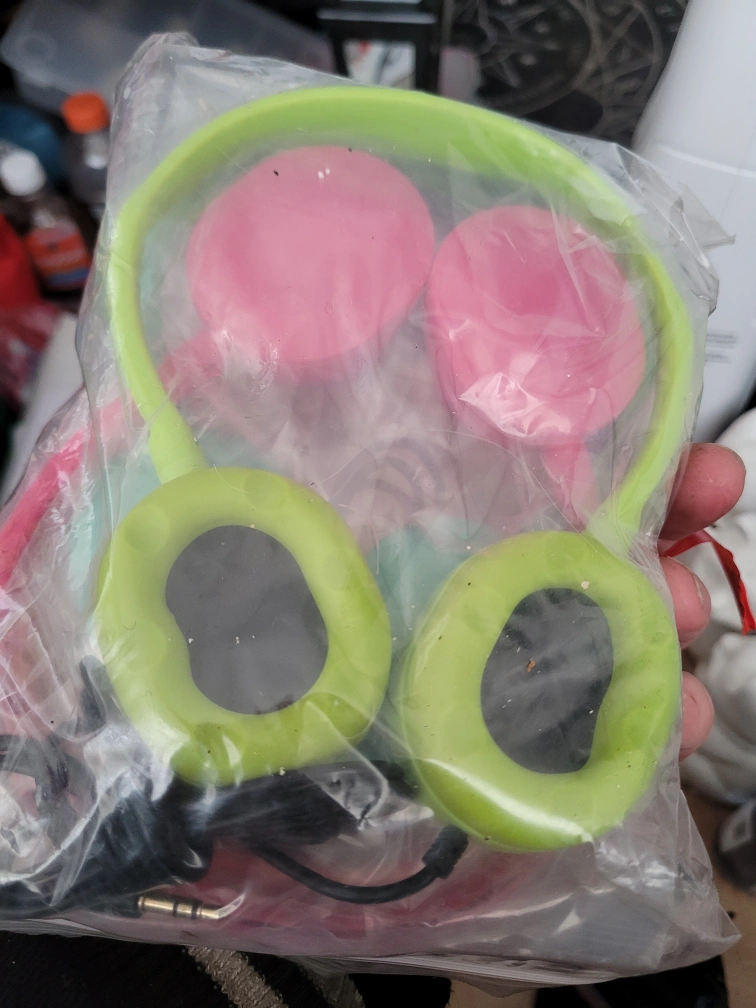 Set of 5 Headphones in a sealed plastic bag. Bright neon green and pink colored ear cups. The package contains a few different colors. These headphones could be great to listen to some music while you unwind. **** Pickup Only **** **** First Come/ First Serve **** **** No Holds or Reserves unless purchasing additional item ****