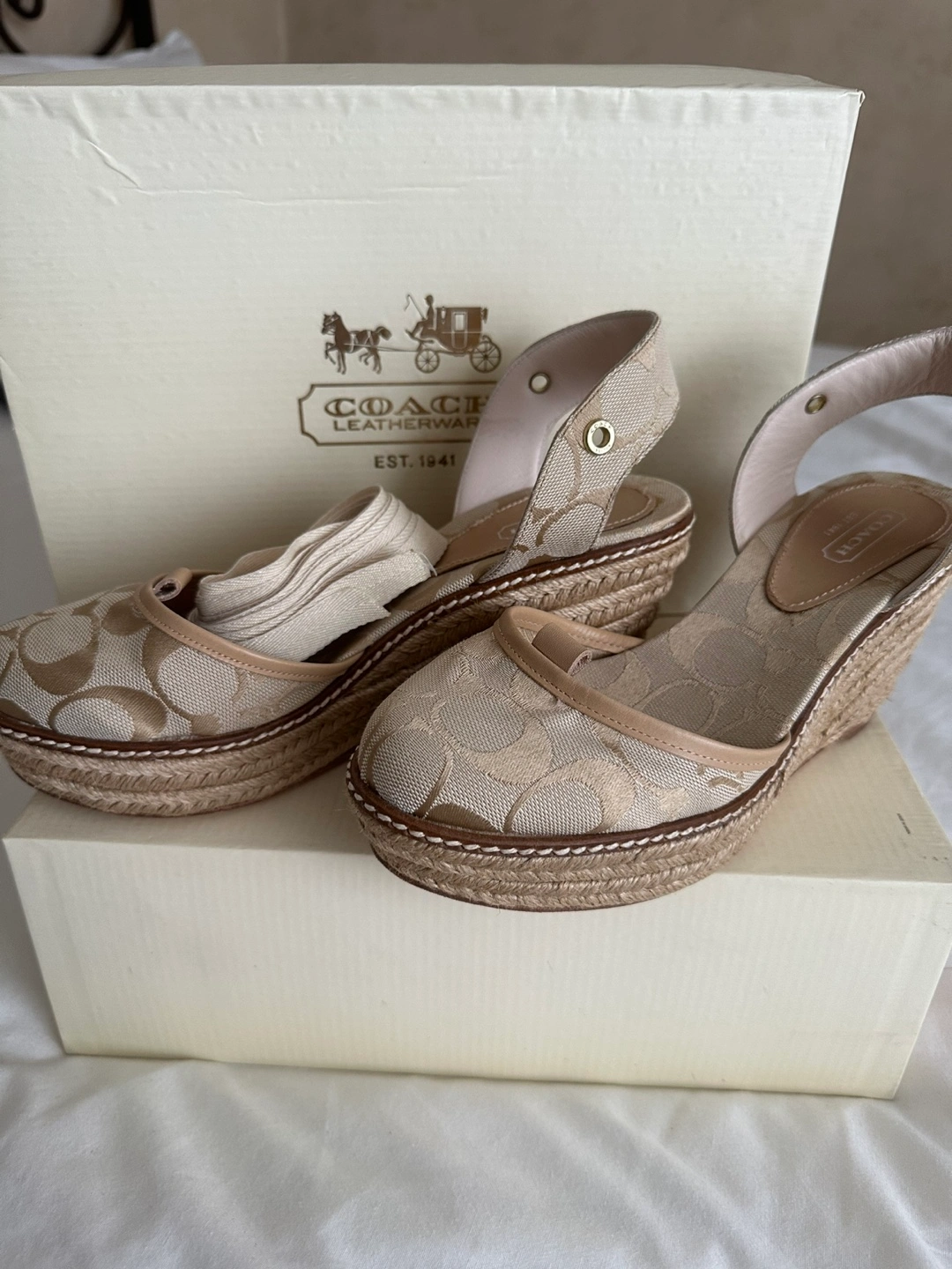 These espadrille wedges feature a beige monogrammed fabric. There is a braided jute sole. They come with an ankle strap. A great pair of shoes to wear while strolling around the city. Never wear out , I found out they are a little tide for me it will fix great 6.5 size or skinny feet.