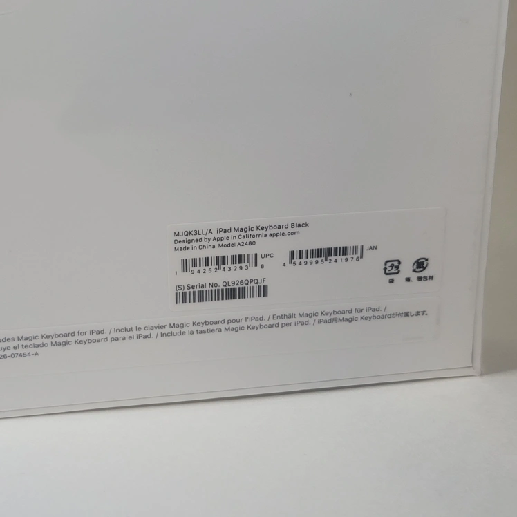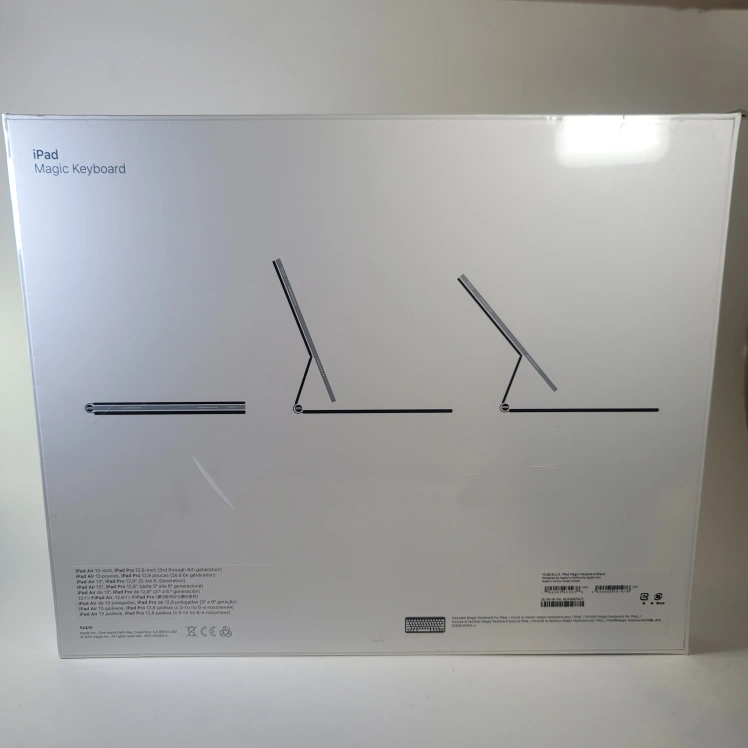 An iPad Magic Keyboard in its box, ready to make your work flow as smoothly as possible. The keyboard is in a sleek black design. It is unopened in its original packaging.