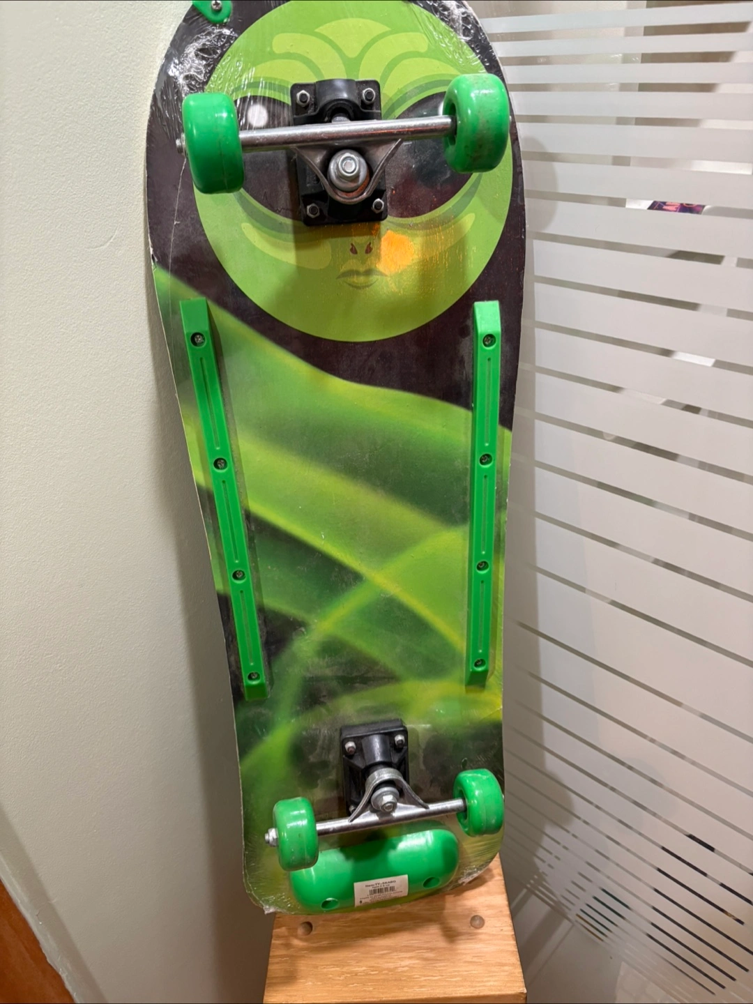 Skateboard with green wheels. The deck appears to feature an alien design. A good way to enjoy the sunshine, and maybe a bit of exercise too. New wrapped up never used