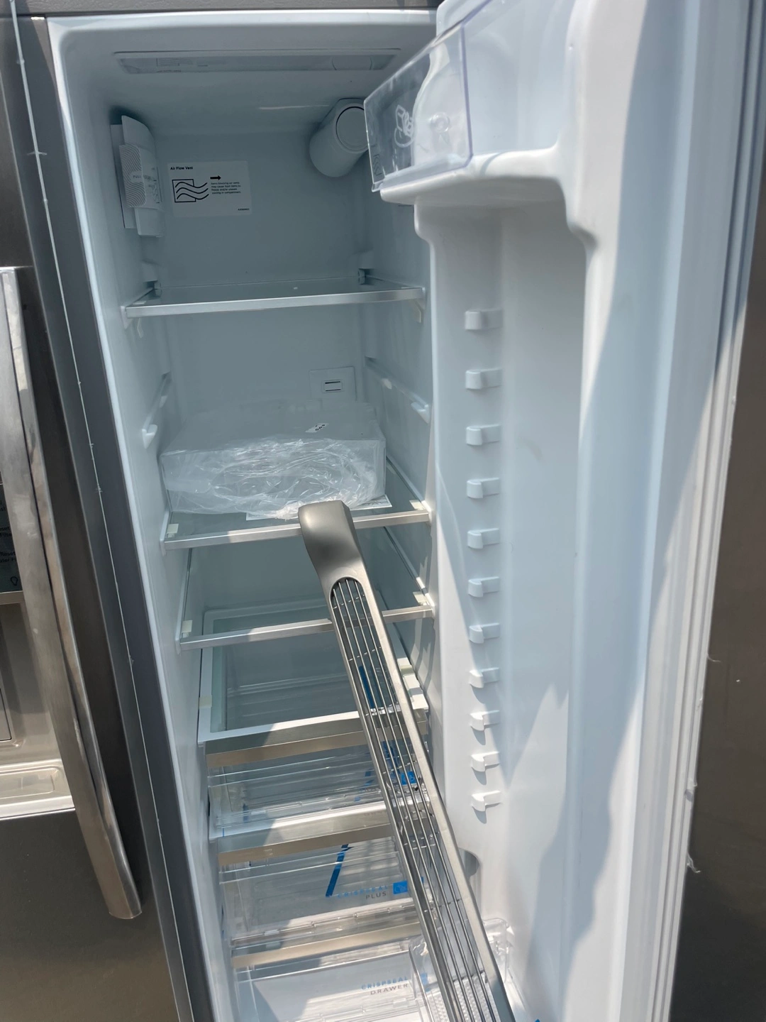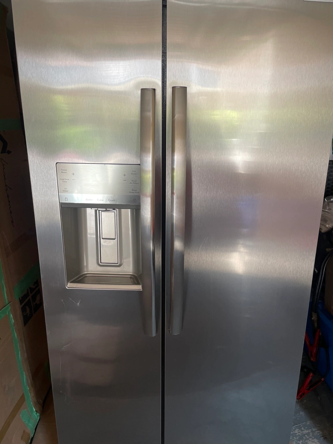 A stylish stainless steel refrigerator. Features side-by-side doors, water and ice dispenser. Includes shelves and storage bins. Perfect for keeping food fresh and ready for your next meal.