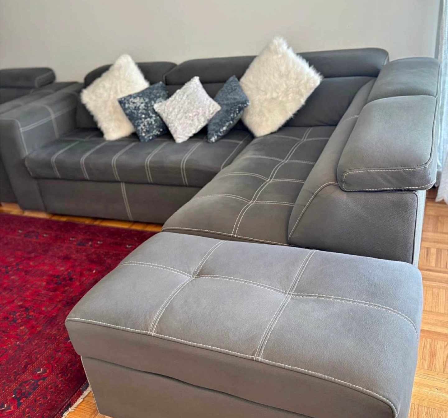 Spacious sectional sofa in a neutral gray color. Comes with an ottoman .Featuring detailed stitching. Perfect for relaxing after a long day. I always covered with sheet for making stainless. Sofa-cum-bed and ottoman have storage. -Good asset for living room -Extremely comfortable. -Ottoman have storage space -Every sitting space has head rest available. -Superior quality fabric used. -Purchased 2 years back for 2100$ Now selling it very low . Negotiations allowed. Moving shortly, should go asap Serious Buyers contact