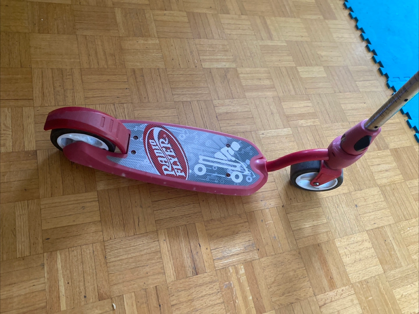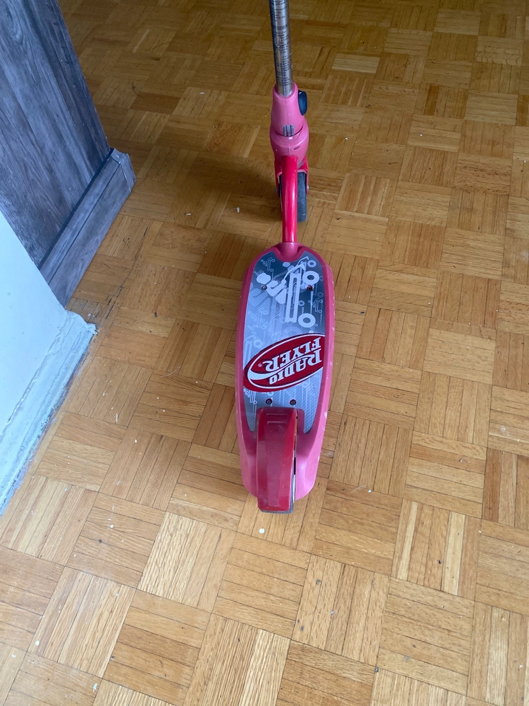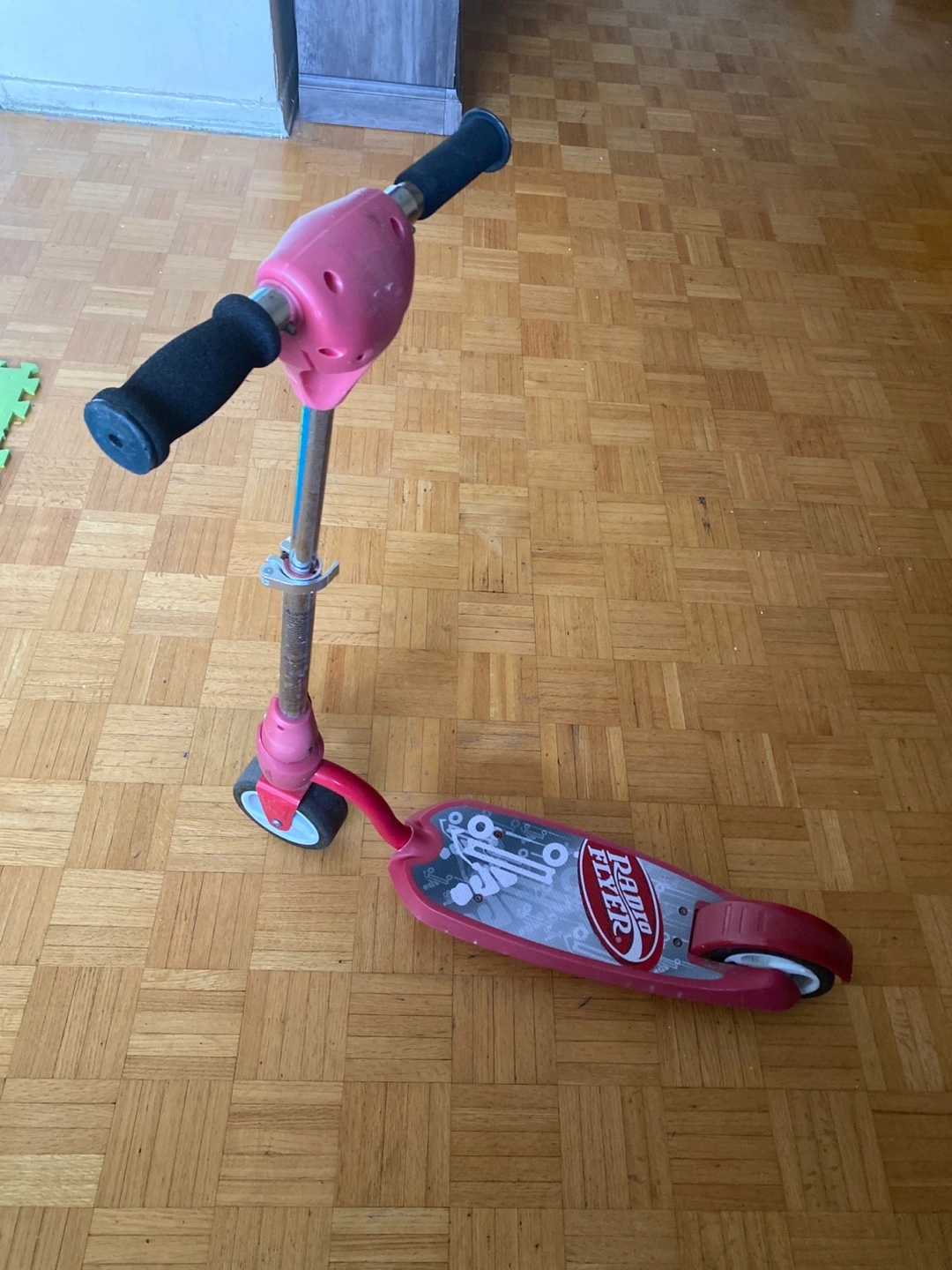 The scooter is a pretty shade of pink with black handlebars. Featuring a deck in grey and red. You could enjoy a relaxing ride with this scooter.