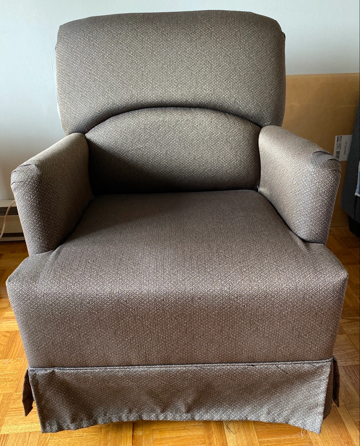 Upholstered chair with a patterned design. The chair has armrests and a high back. It also features a skirt around the base. Relax and enjoy this chair after a long day.