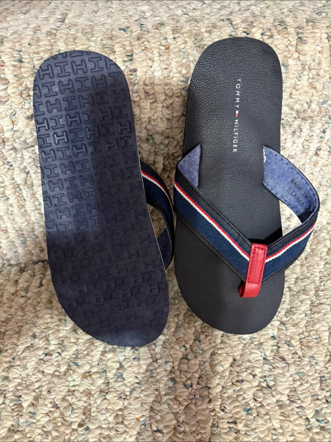 These flip flops are navy in colour. The straps have a red and white accent. Perfect for a stroll on the beach. New size 3 youth $10 pick up heartlake Brampton