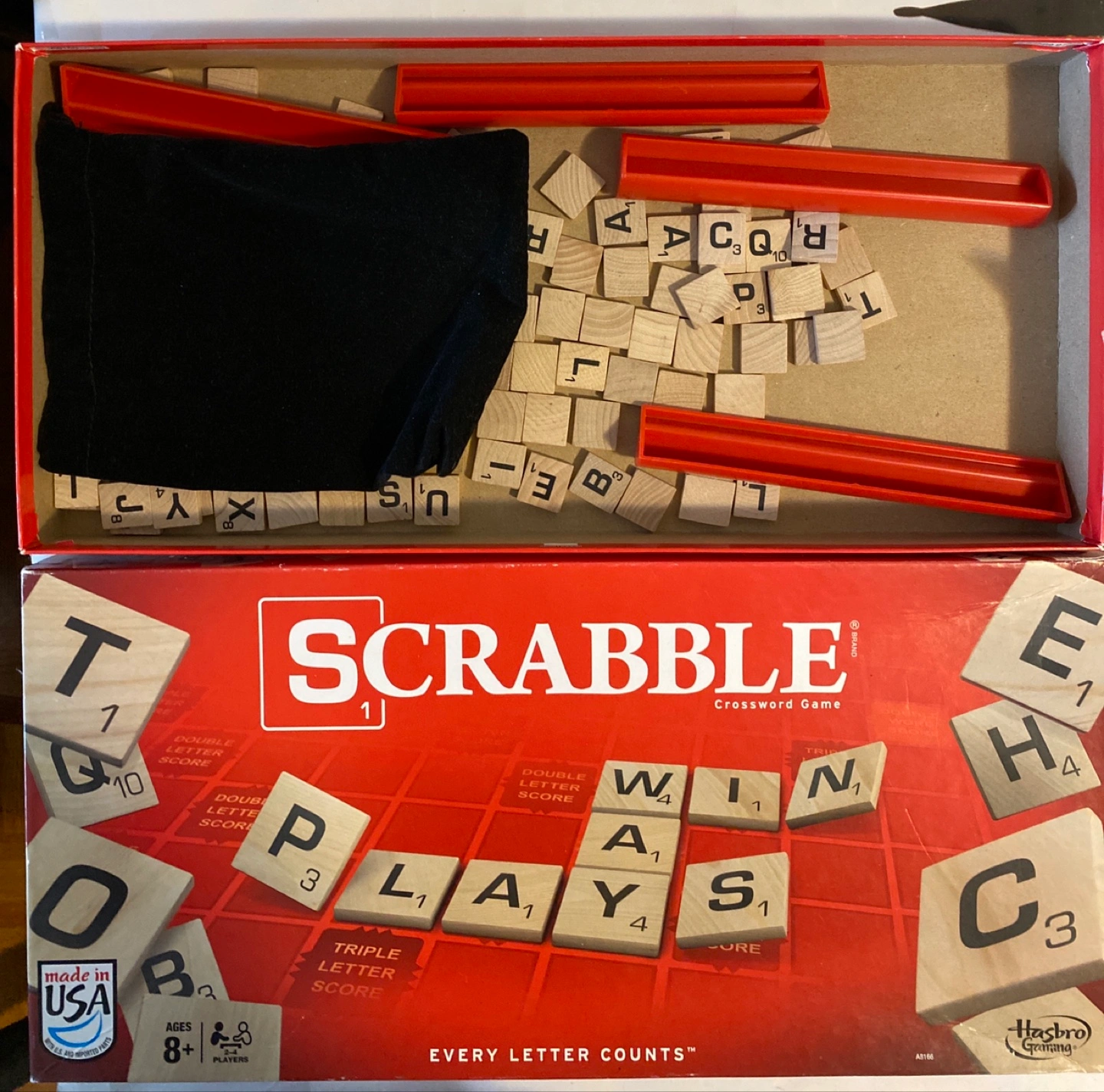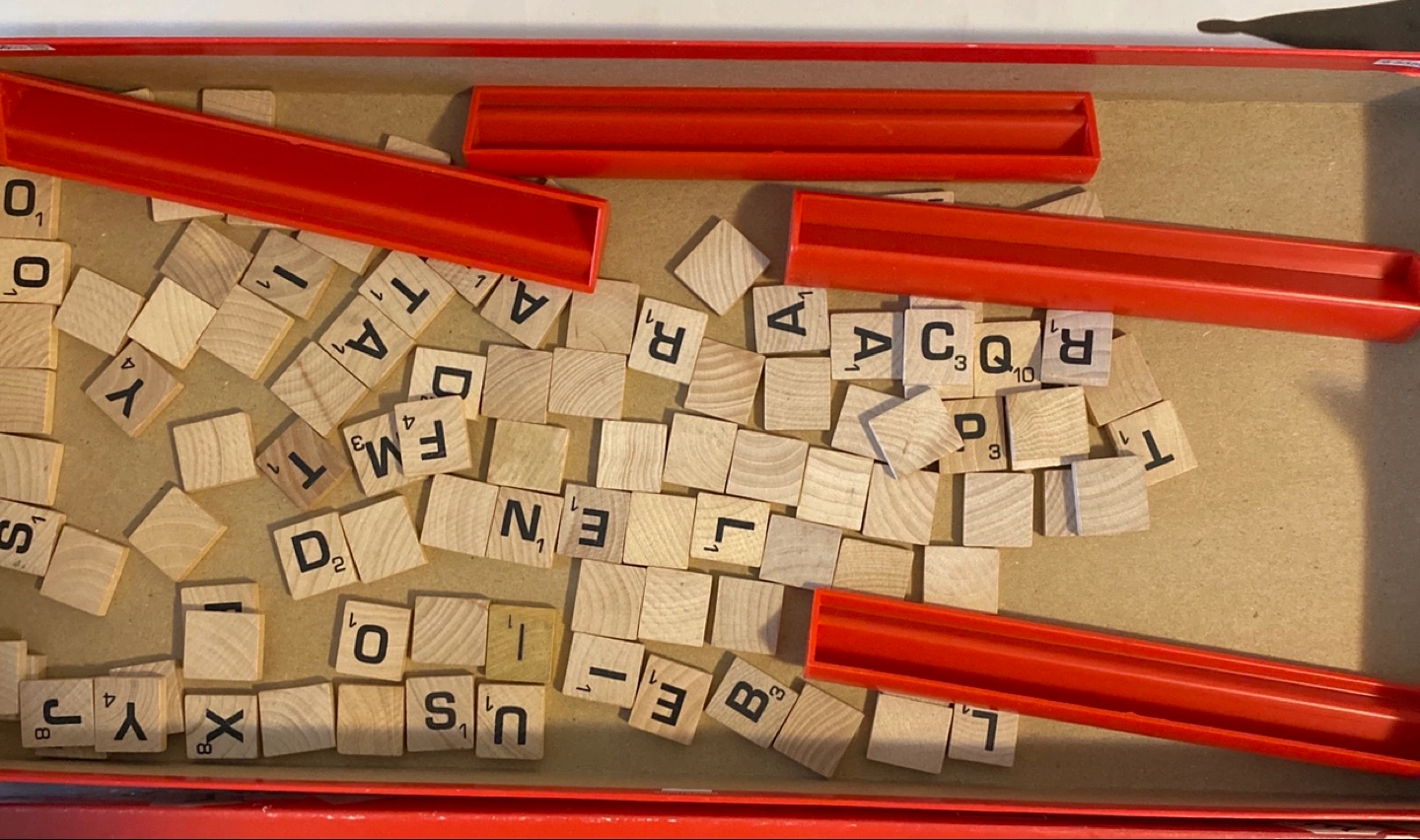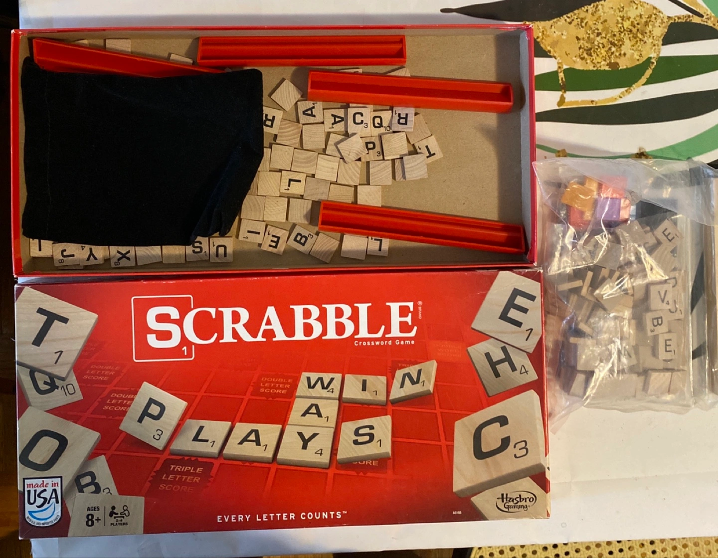 A classic Scrabble board game with all the pieces, including the wooden tiles and tile racks. It's a great way to exercise your mind. Complete game no tiles missing. And an extra set of tiles and racks from Hasbro which is brand new.