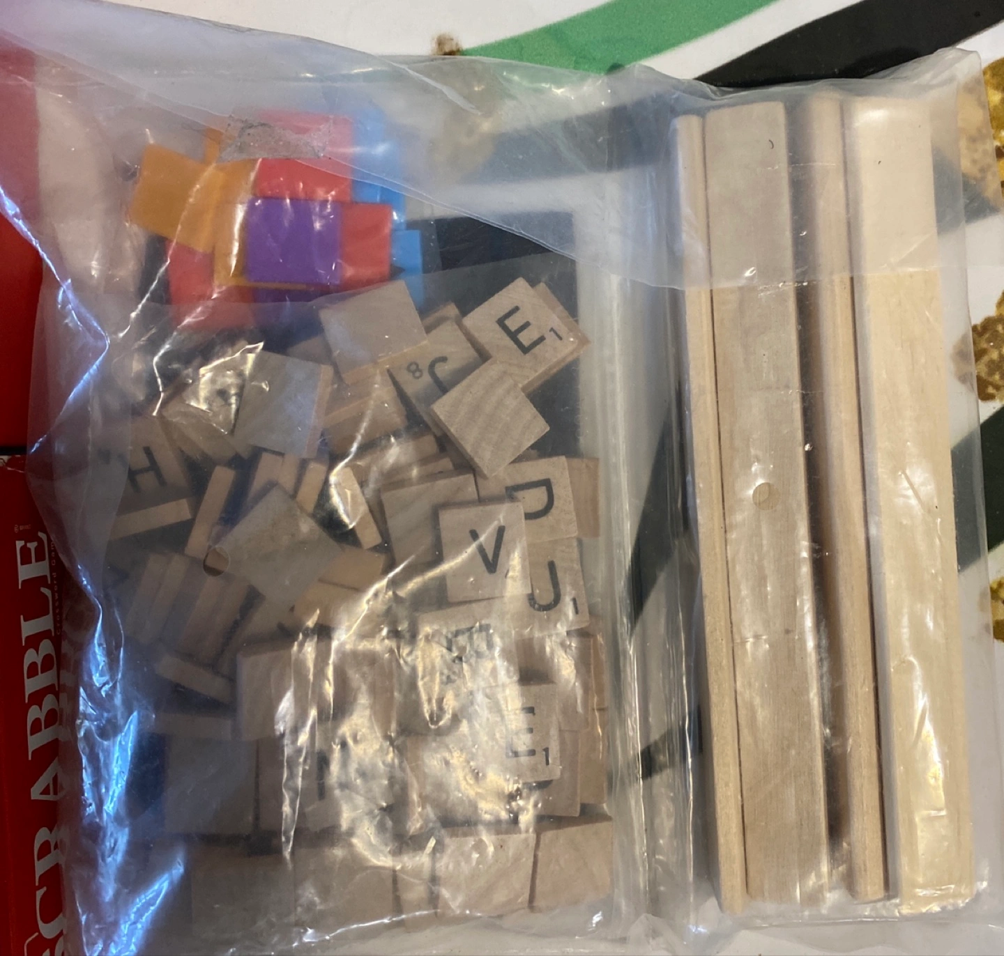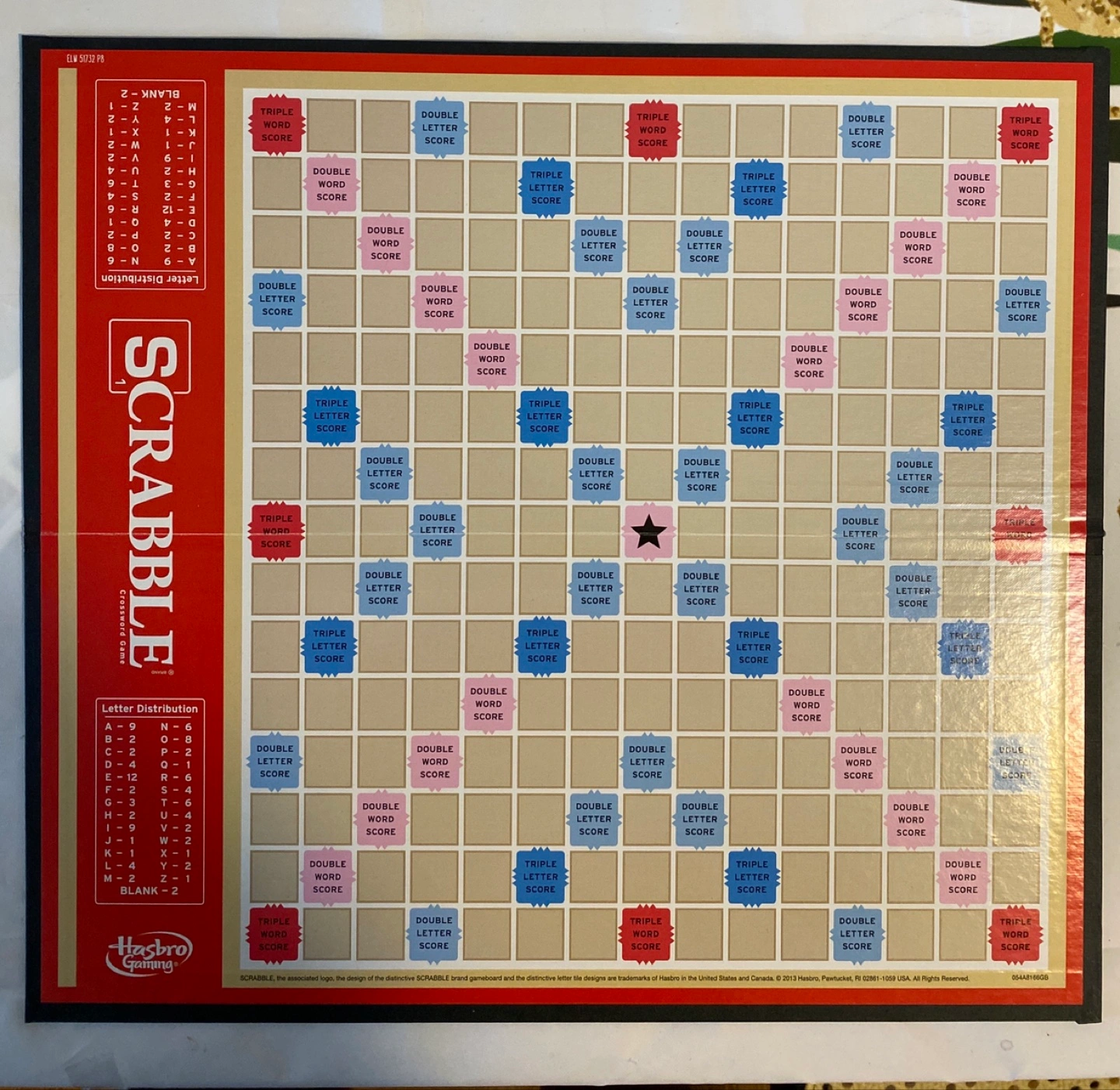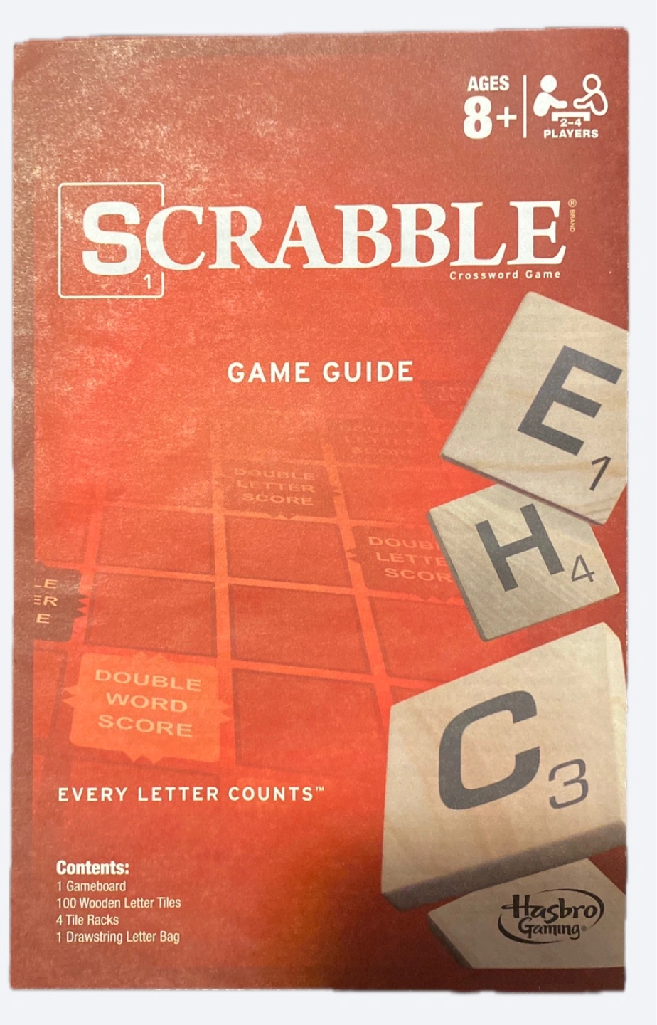 A classic Scrabble board game with all the pieces, including the wooden tiles and tile racks. It's a great way to exercise your mind. Complete game no tiles missing. And an extra set of tiles and racks from Hasbro which is brand new.