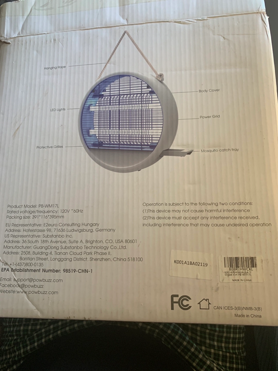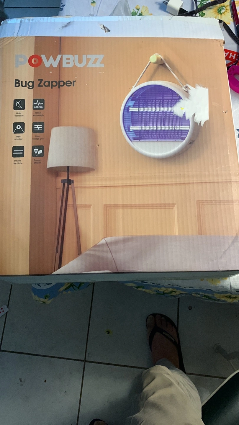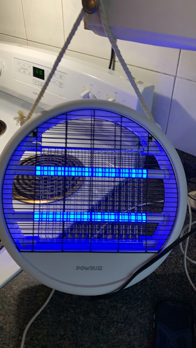 Bug zapper with a round design. White body with blue lights inside. Has a hanging rope. A great item to get rid of pesky bugs, which will surely help you relax.