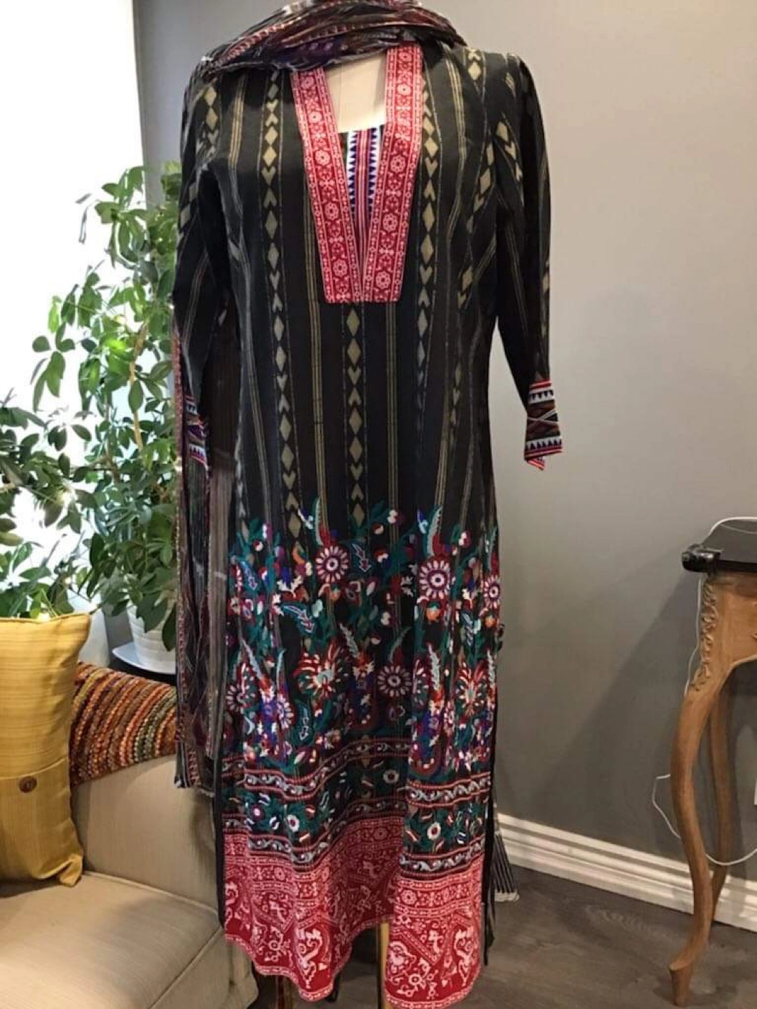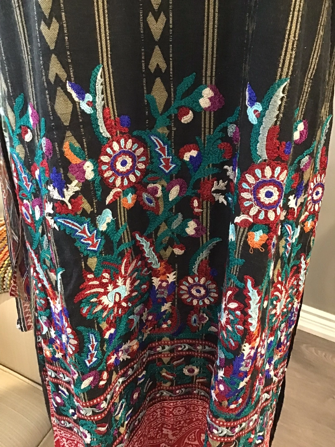 A black dress. Floral embroidery details. Features a scarf. Could be worn for a fancy evening out in style.