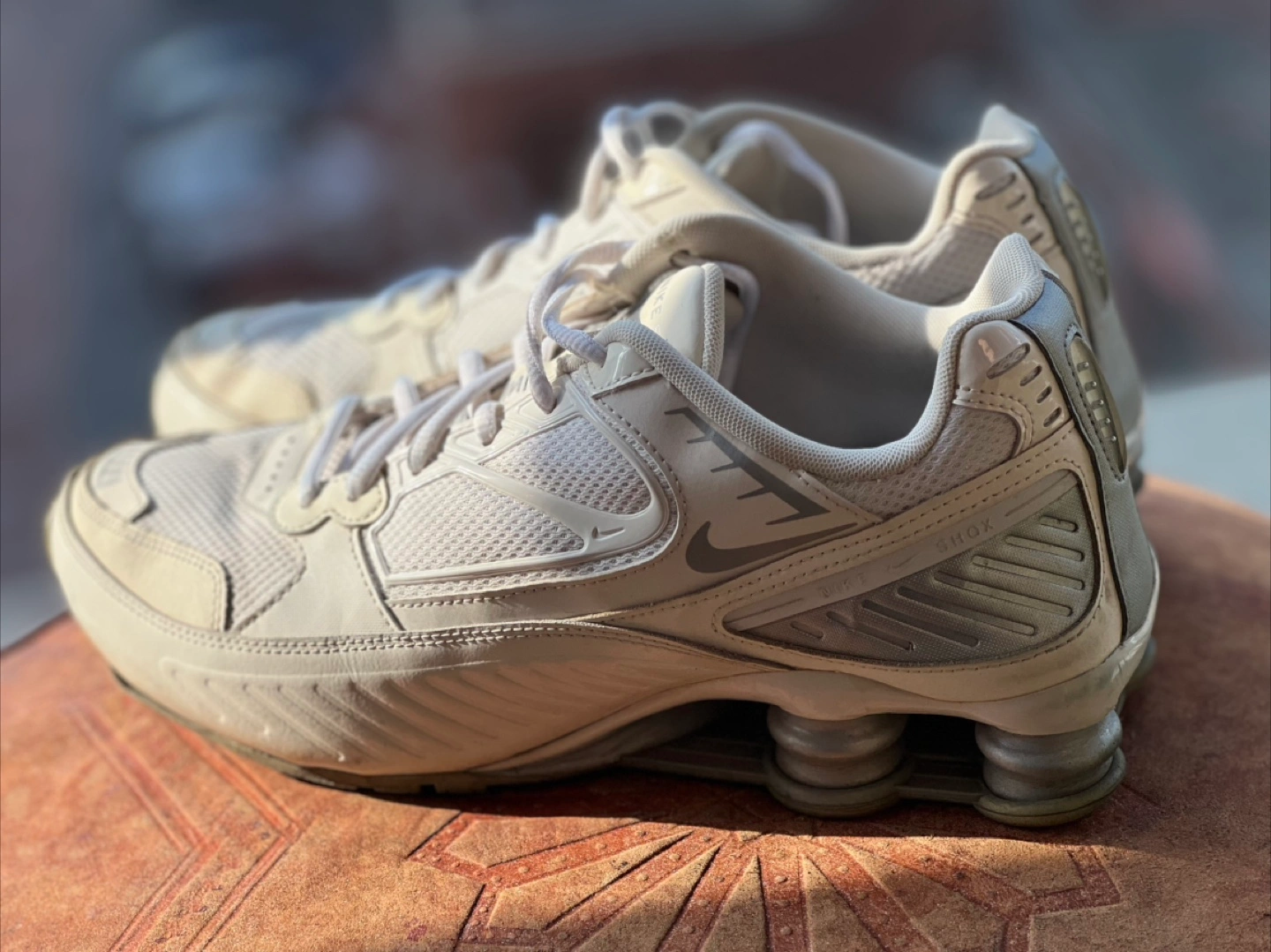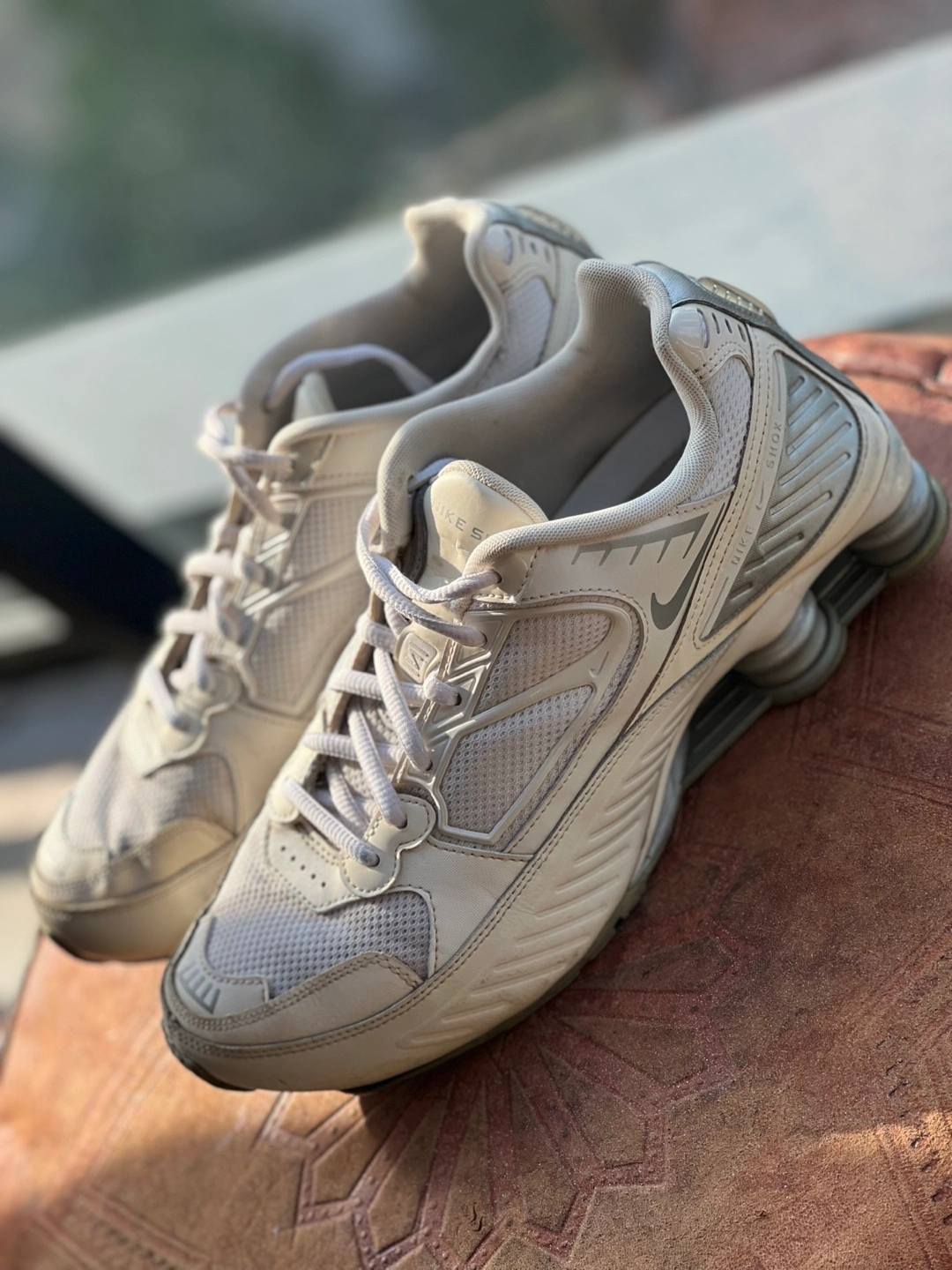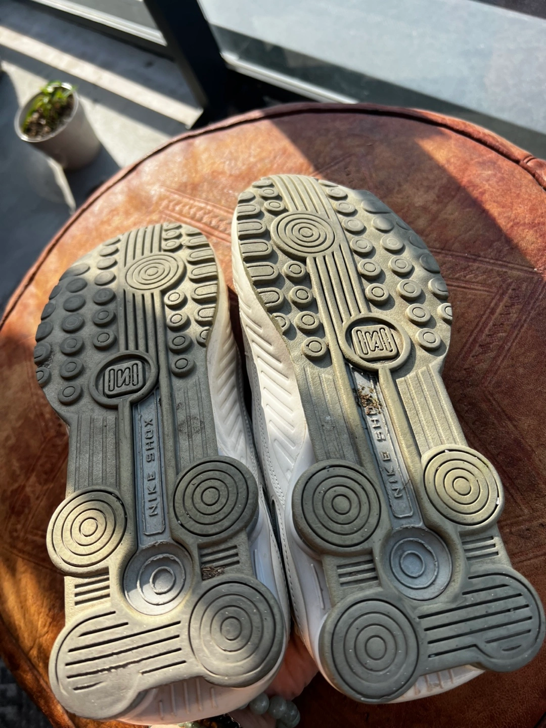 Worn but well cared for. Soles are still in great condition which reflects the price. They sell new for $200. White and silver Nike shox. Features the iconic Nike swoosh. These shoes are casual but make a statement. Very roomy for a size 9 1/2 women’s. Available for pick up near St. Lawrence market.