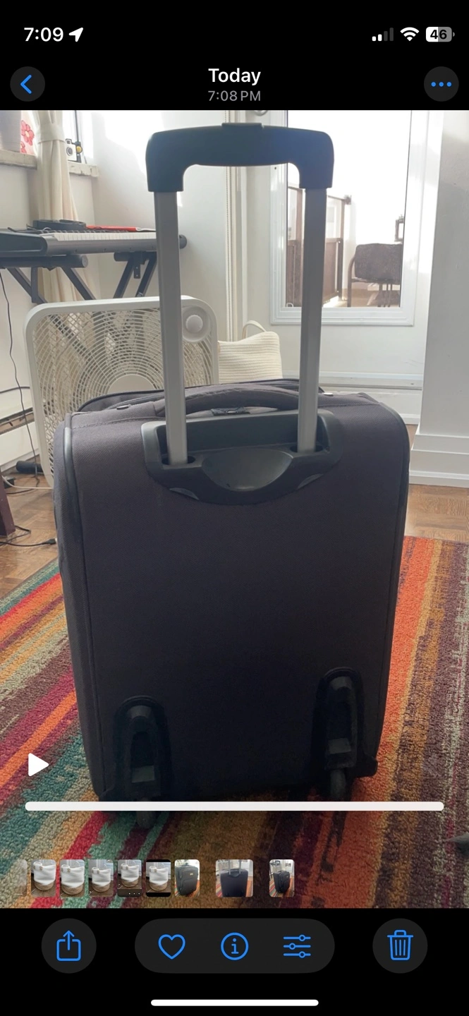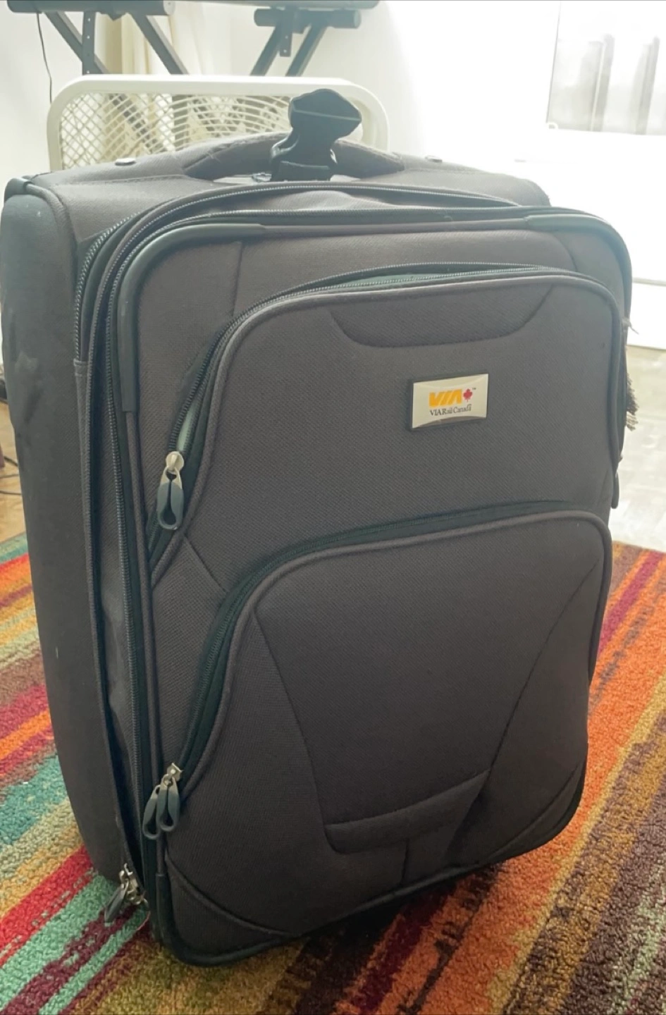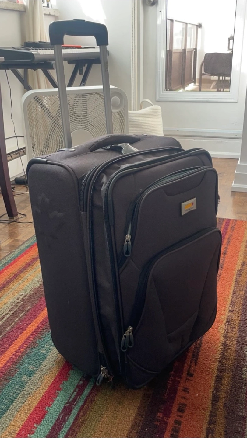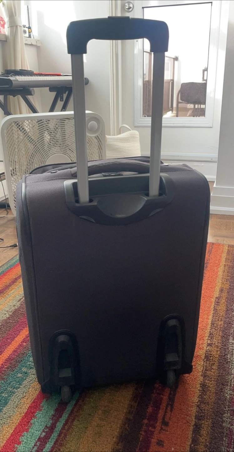 Suitcase has a retractable handle, as well as two small wheels. Features several zippered compartments. Perfect for carrying everything you need on your next adventure, whether it be near or far.