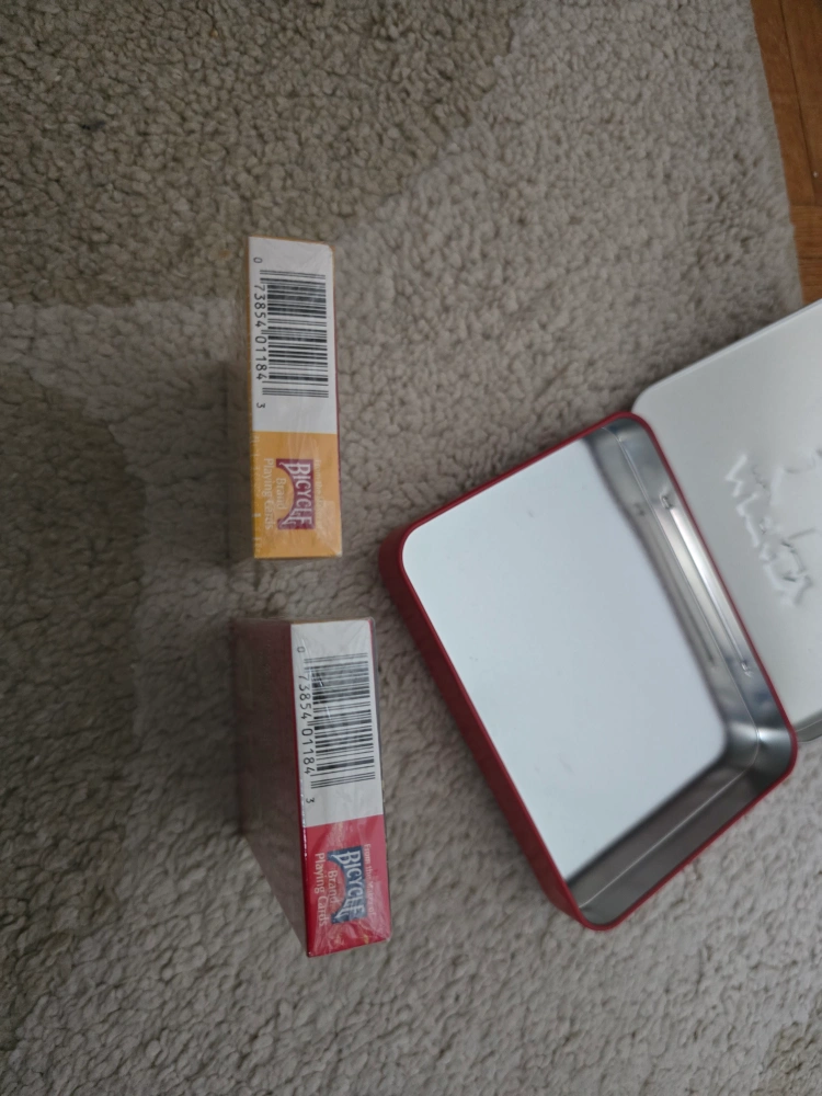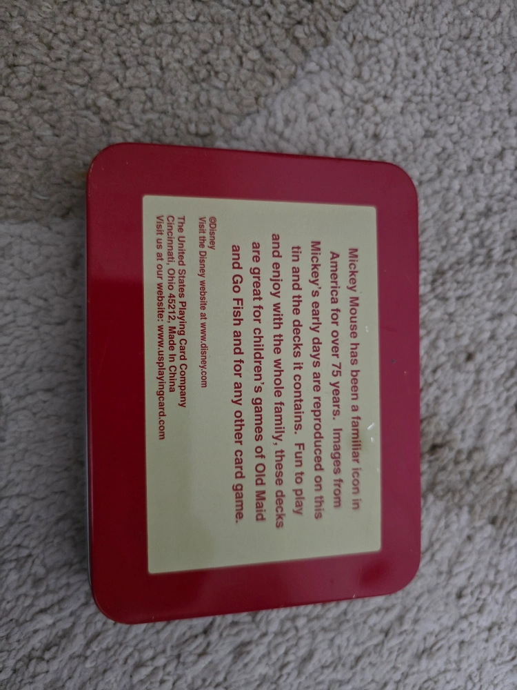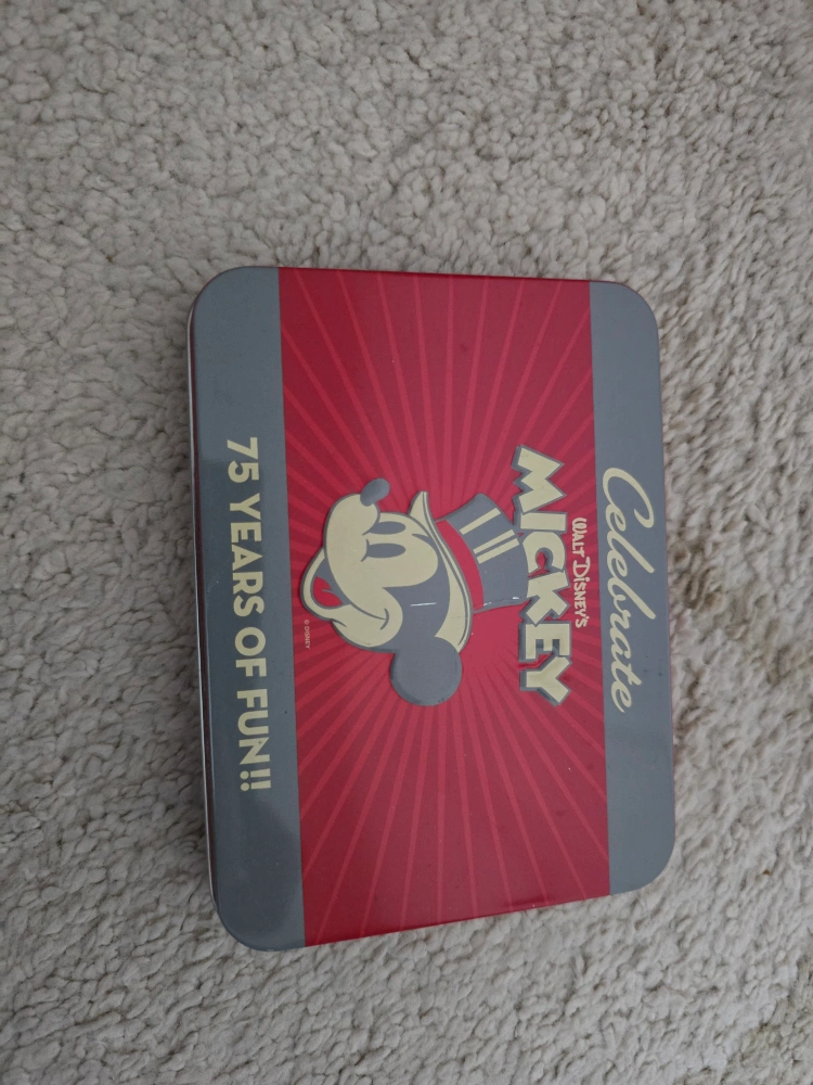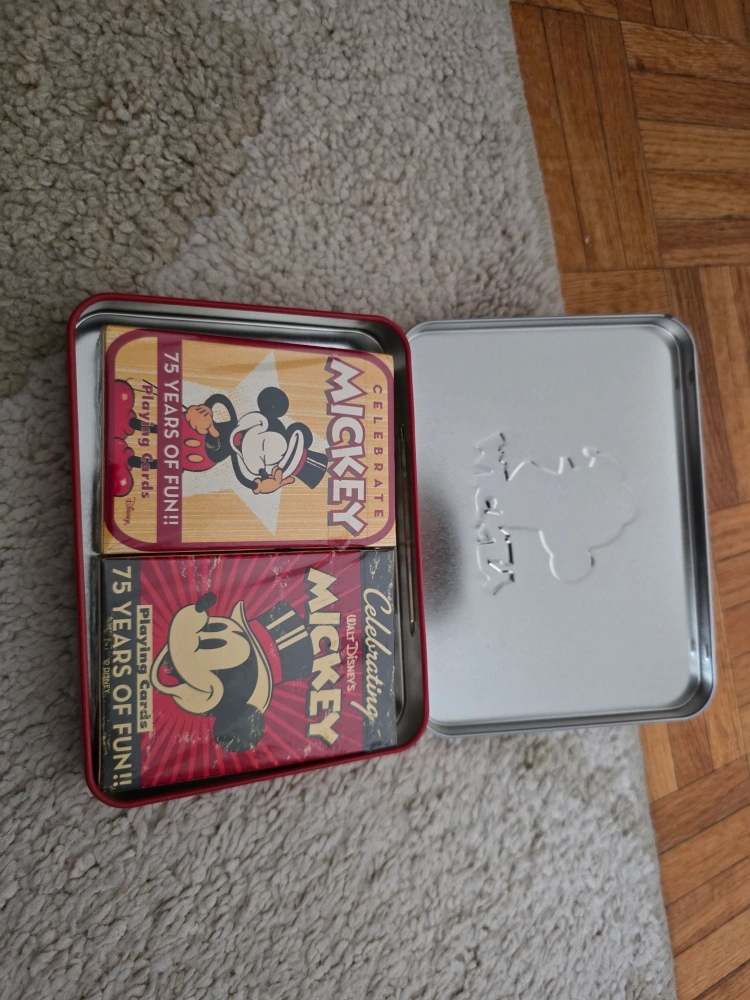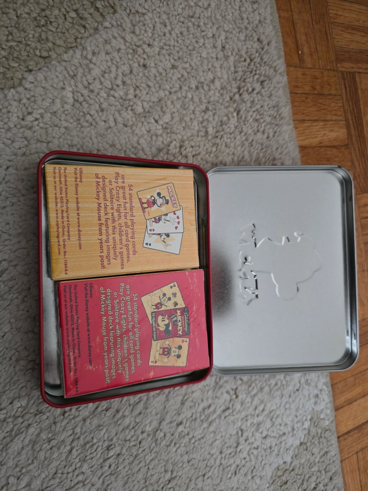 Still sealed /unopened playing cards inside a red and silver tin. Two decks of cards. The tin features a Mickey Mouse image. A great purchase for a relaxing night in.