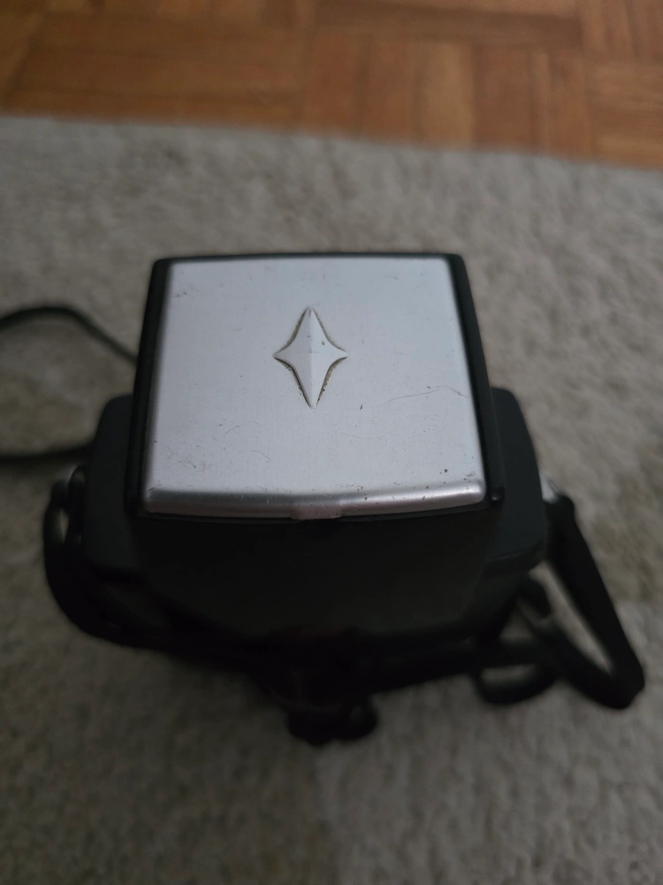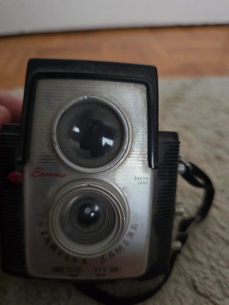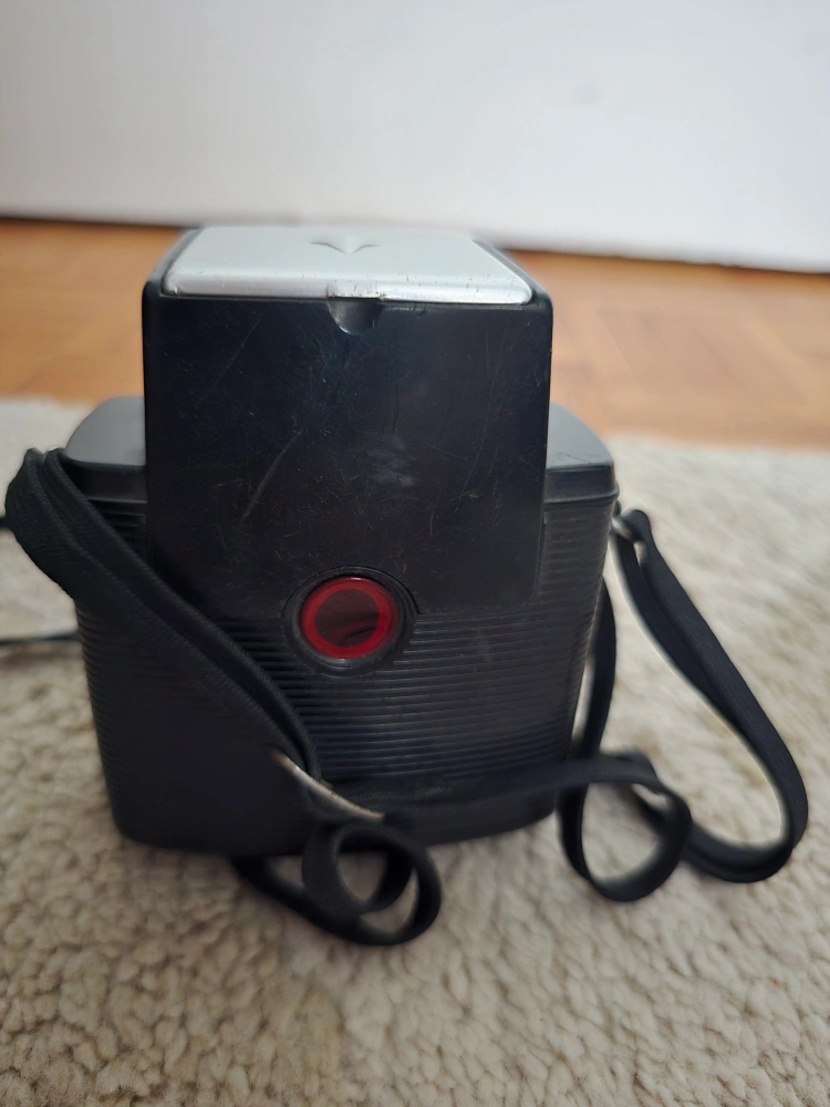 A vintage camera with a unique design. It features a silver front with two lenses and a black body with a strap. The camera’s top is also silver. This camera will allow you to capture memorable moments.
