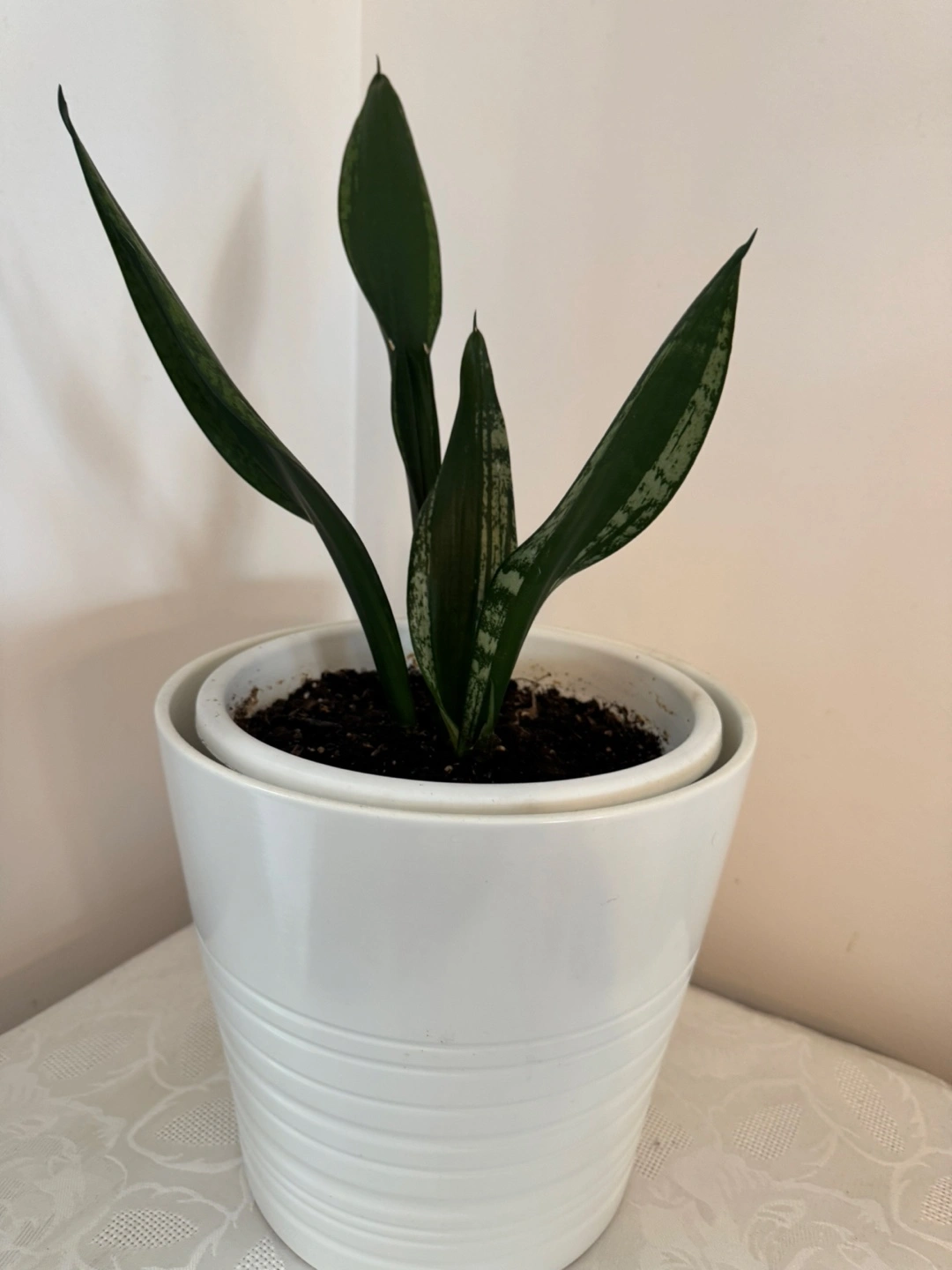 The snake plant is thriving in the white pot, it would look beautiful on a desk or shelf. The plant has long green leaves. It is potted in soil. Is it easy to take care. Pick up at Steeles & Bathurst intersection.