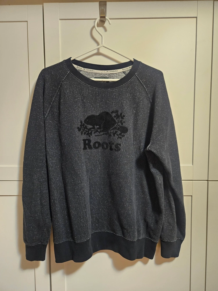 A comfortable Roots Canada sweatshirt Black, Size XL Ladies (good for Large fit) Features the brand's logo on the chest.