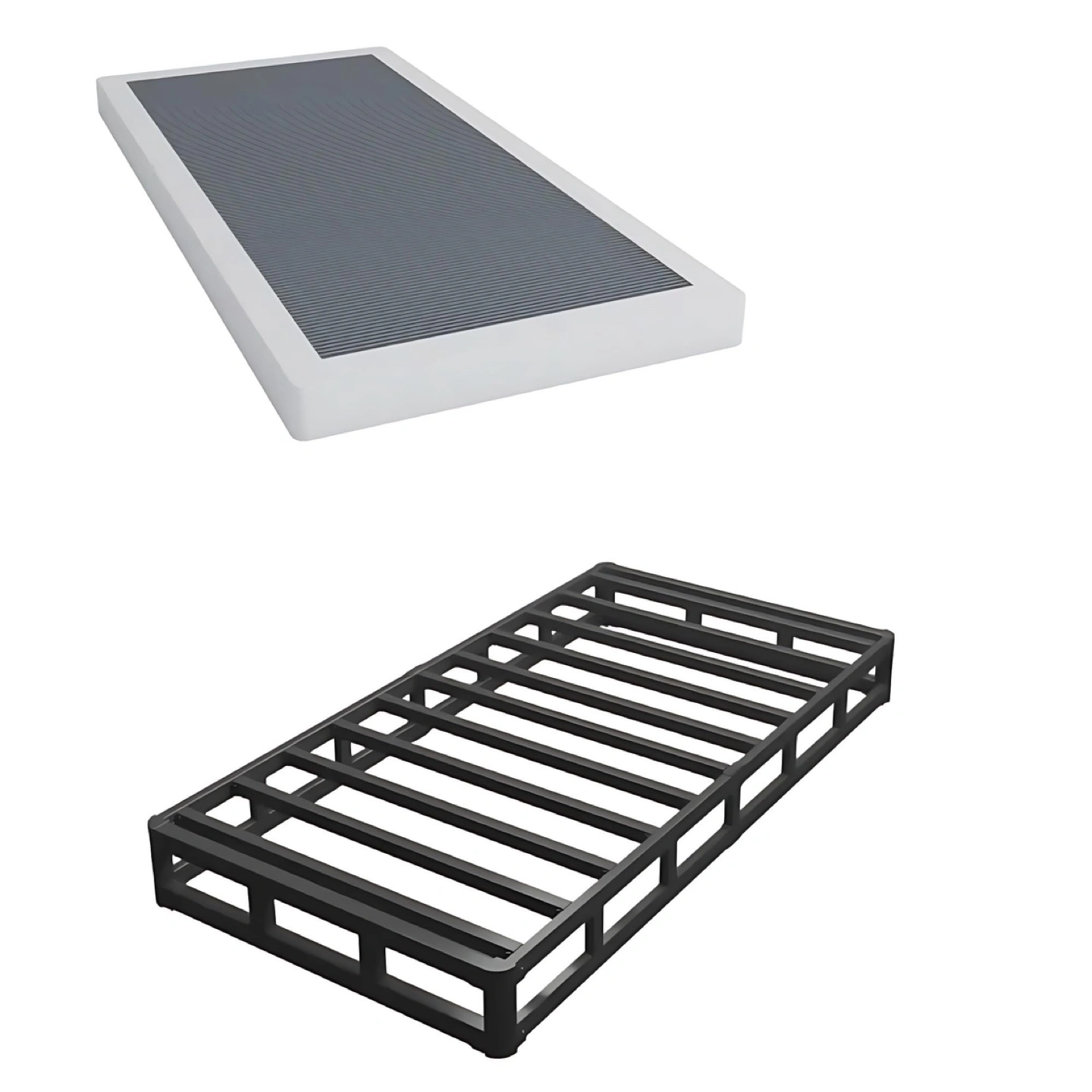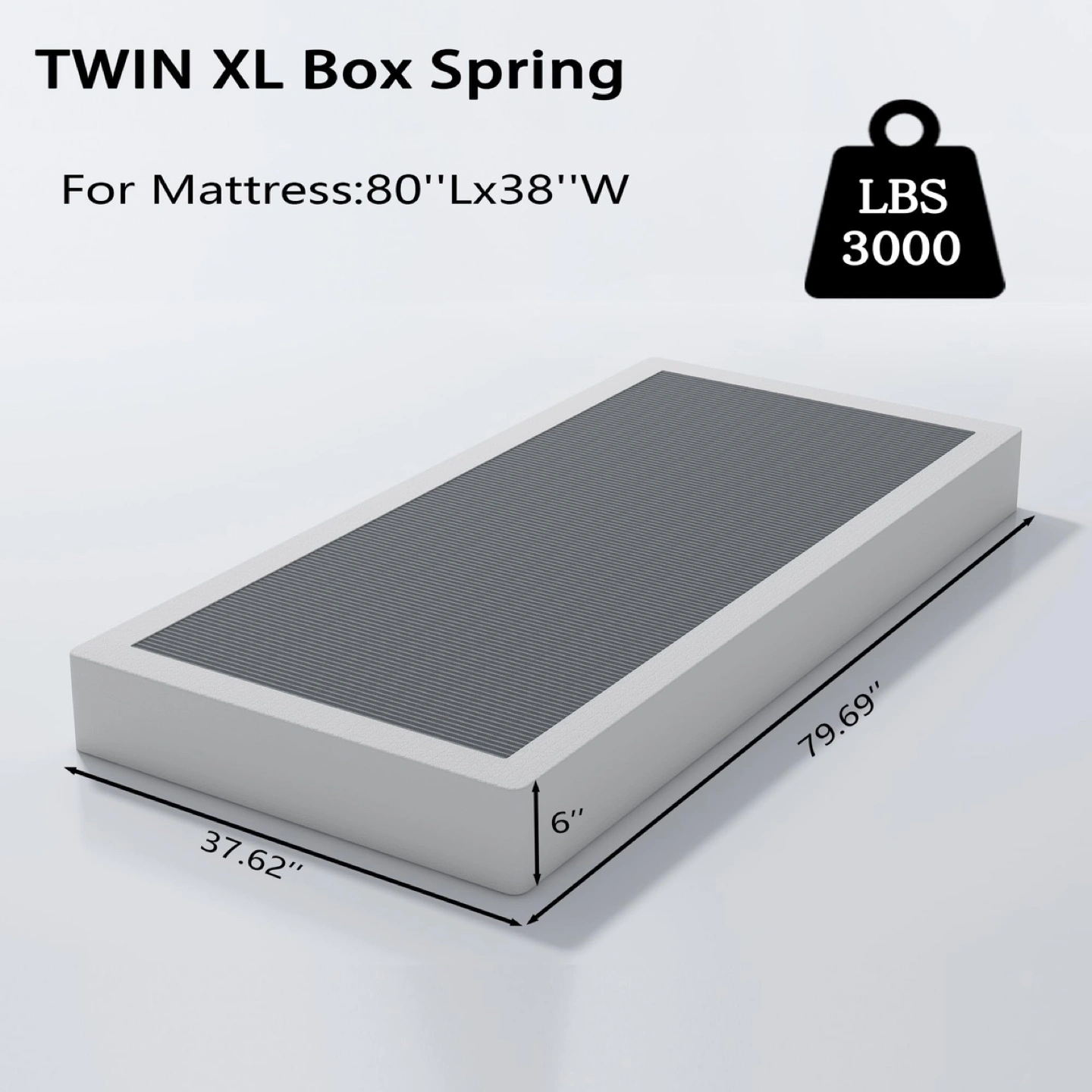 Size Twin XL Material Metal Product Dimensions 2.02L x 0.96W x 0.15H Meters Style Modern Special feature Squeak Resistant Colour 6 Inch Sturdy Structure: Box spring features a strong metal frame, which ensures the stability and durability of the mattress, heavy-duty and durable box springs can support up to 3000 lbs Compatibility Profile Design: 6 inch box spring elevates your mattress,suitable for different types of mattresses, including innerspring mattresses, memory foam mattresses,latex mattresses,etc Twin XL box spring only Cover Included: Box spring with fabric cover, elastic band, shrink and wrinkle resistant, keep mattress from slipping, easy take off for cleaning and assembly Quiet and Noiseless: This mattress foundation adopts a silent design, each pole and support frame is seamlessly welded at both ends, ensuring you a comfortable sleeping time Easy Assembly: All parts of the box spring 6 inch, assembly tools and clear instructions are. packed in a compact box, simply follow the instructions for quick assembly Box Spring Only: A bed base or bed frame is required to support this box spring and is sold separately, no bed base is included in the package, or this box spring has a sturdy metal frame construction that you can use as a bed frame to support the mattress.