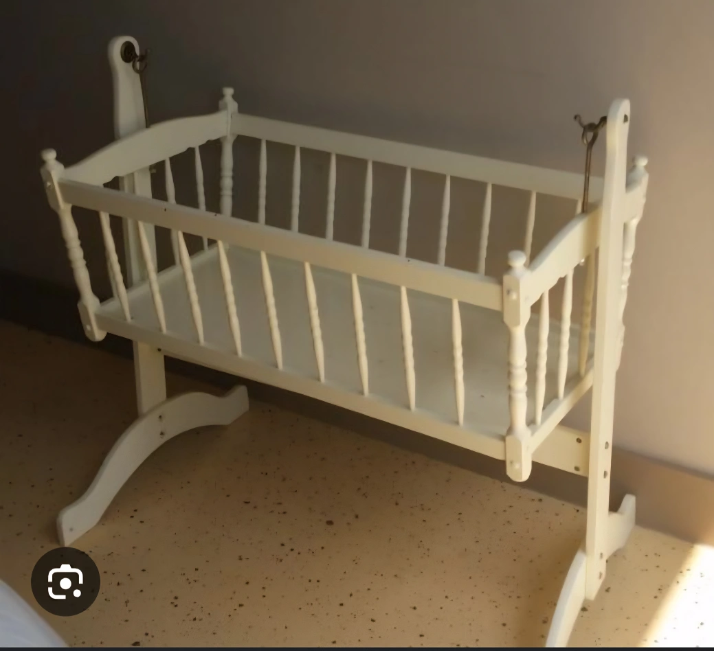 A lovely baby cradle in a classic design. Made of wood and painted white. It is a rocking style, with a low profile for easy access. It would be perfect for soothing your little one to sleep.