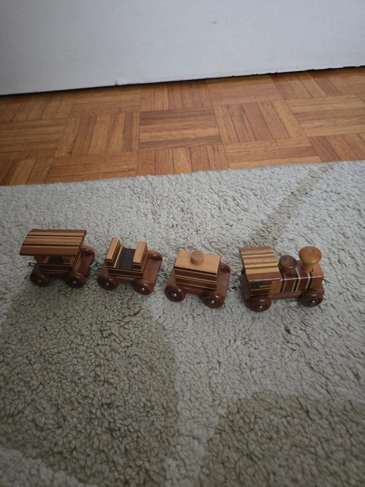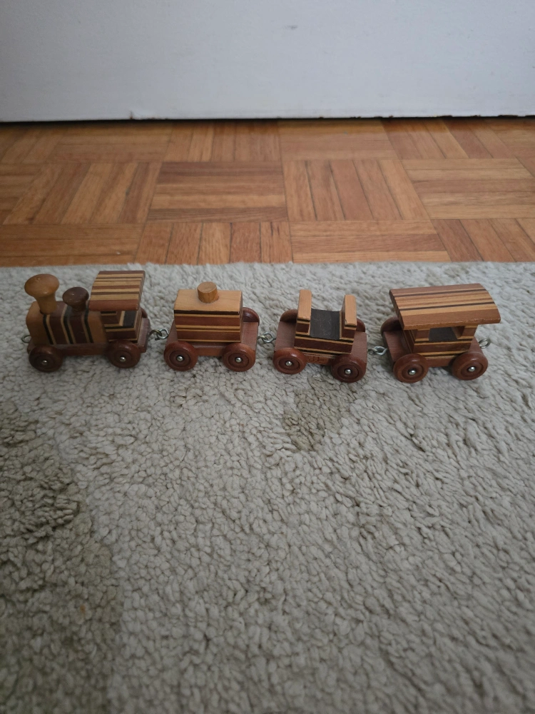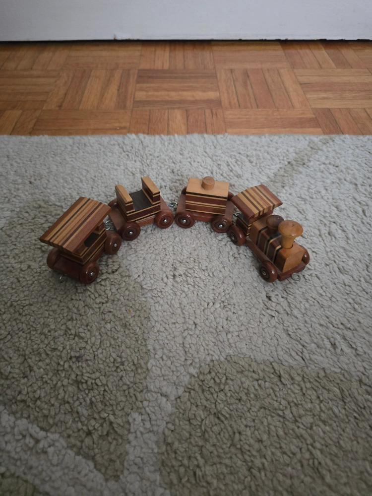 A charming wooden train set. Includes four connected train cars. Each car has a unique design and wheels. A great option for imaginative play, or even a relaxing moment of quiet contemplation.