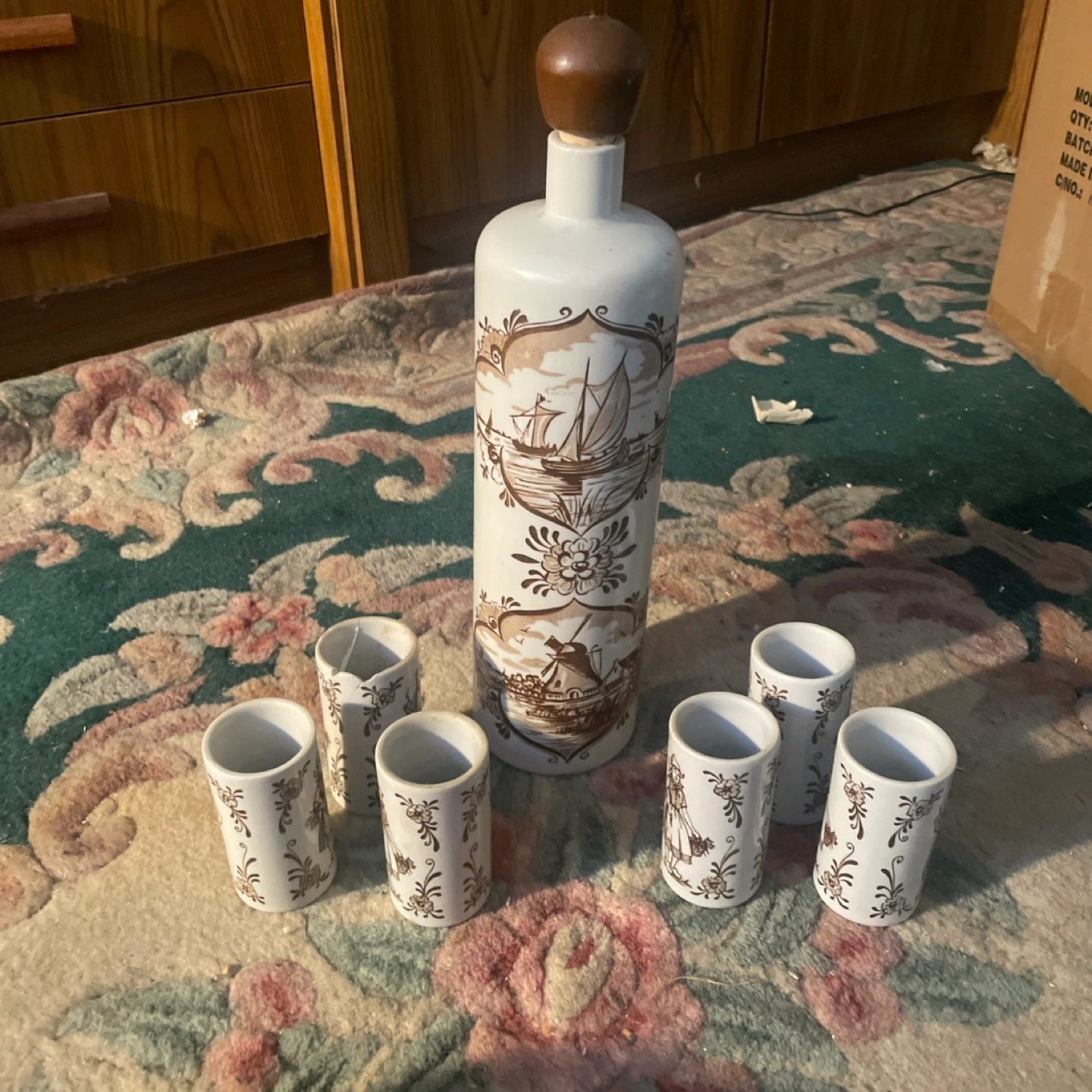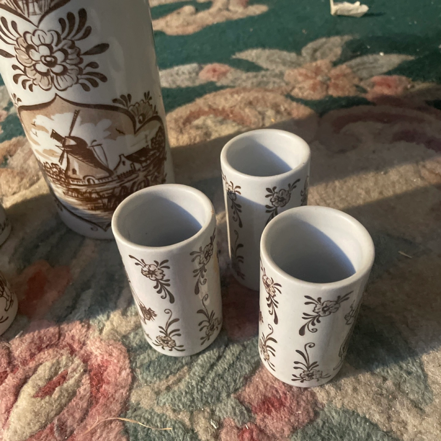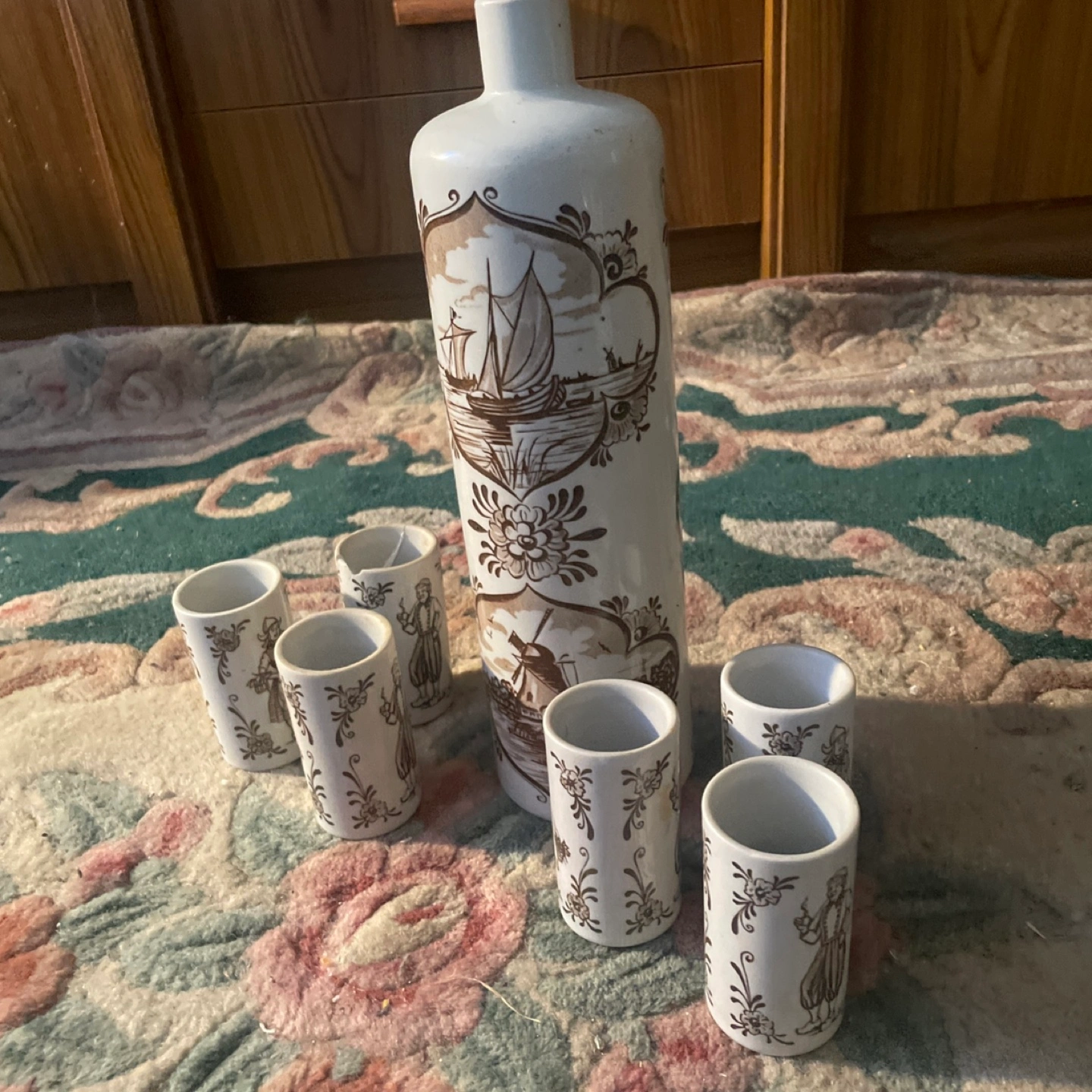 A ceramic decanter and matching shot glasses. Features a brown and white colour scheme. Some of the shot glasses have decorative designs. This set is great for any kind of drink or for decoration. From Brazil 1960s