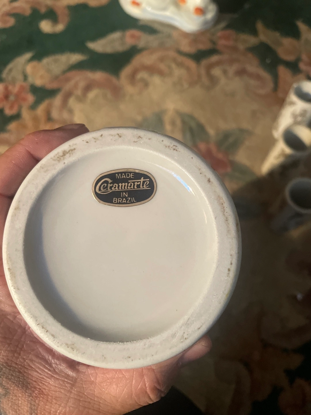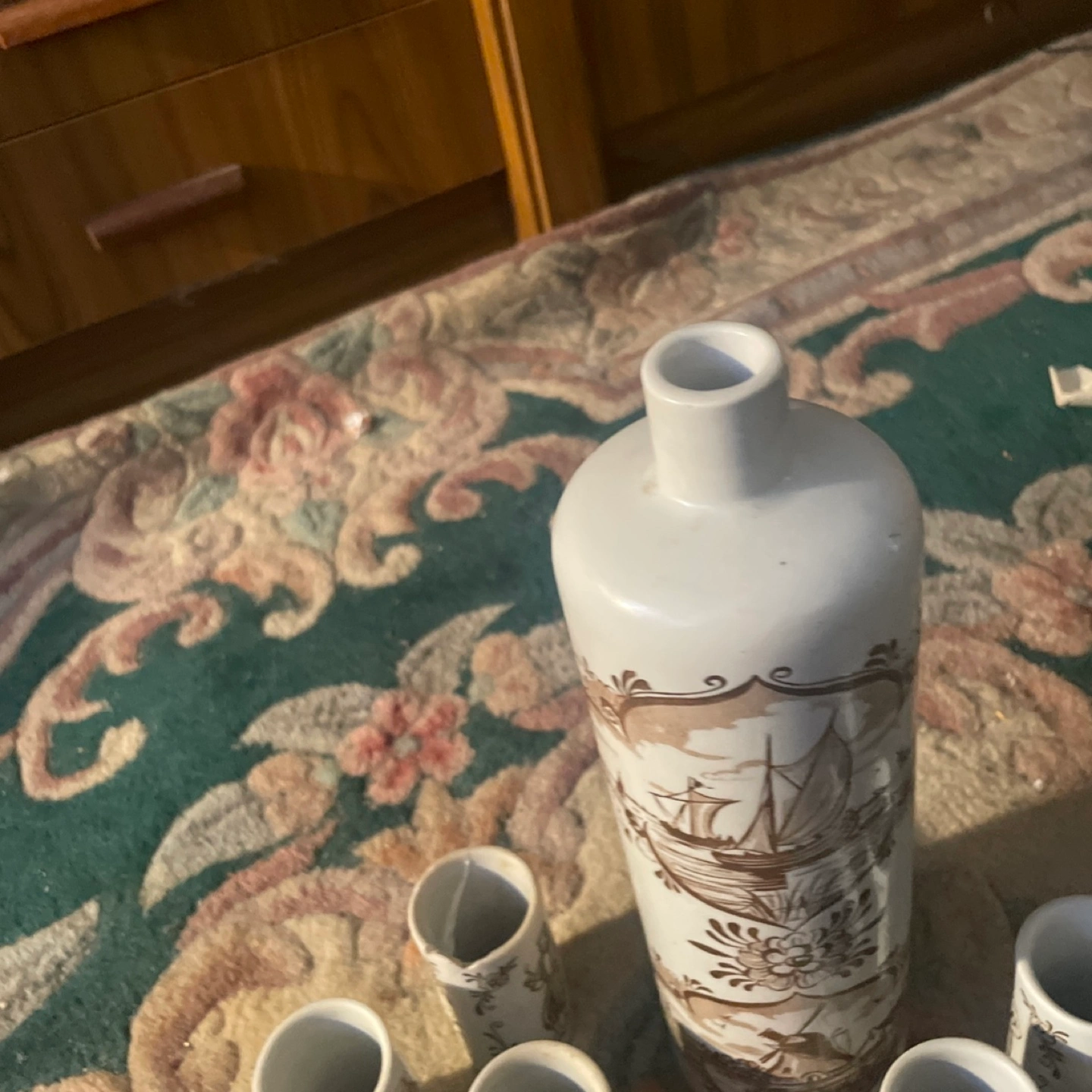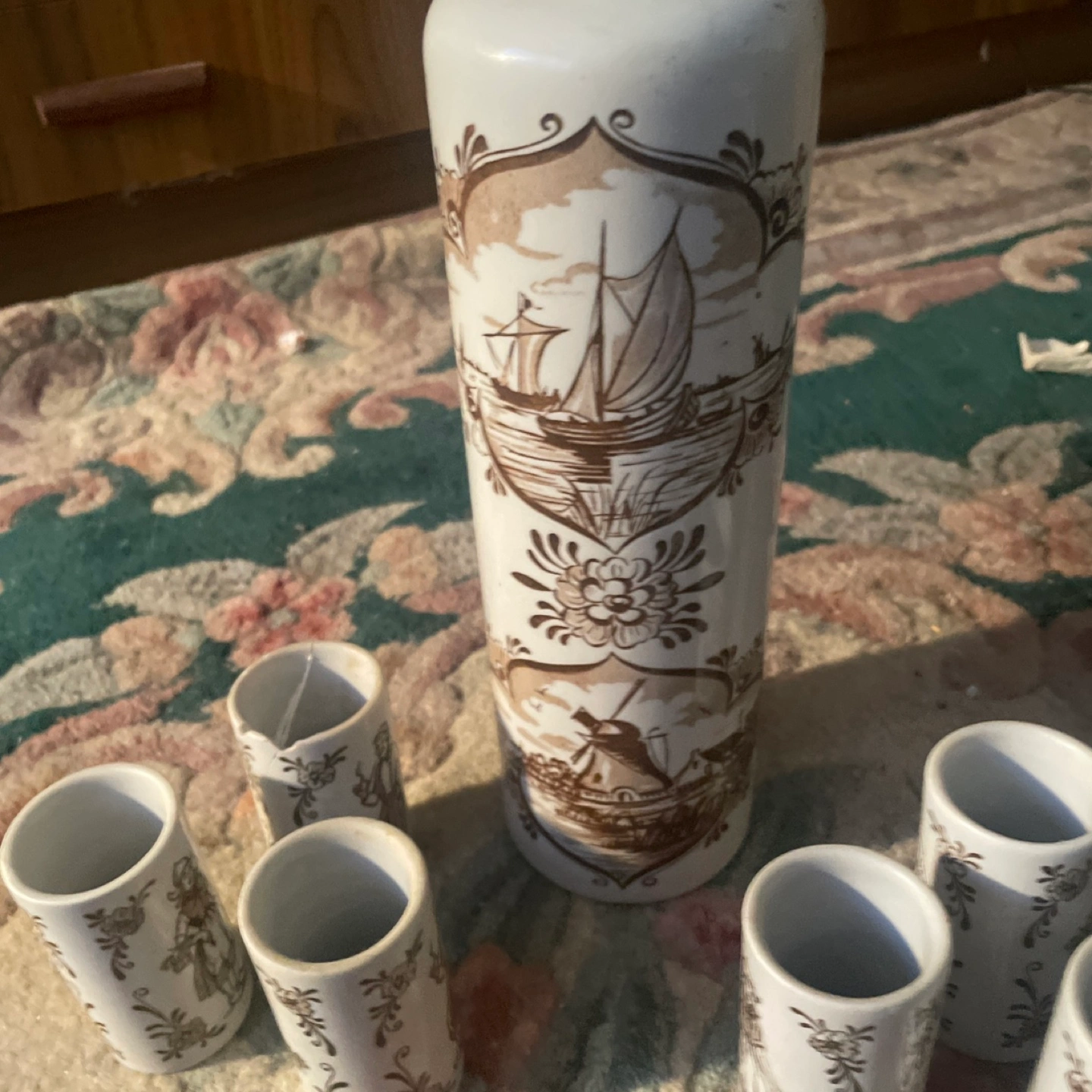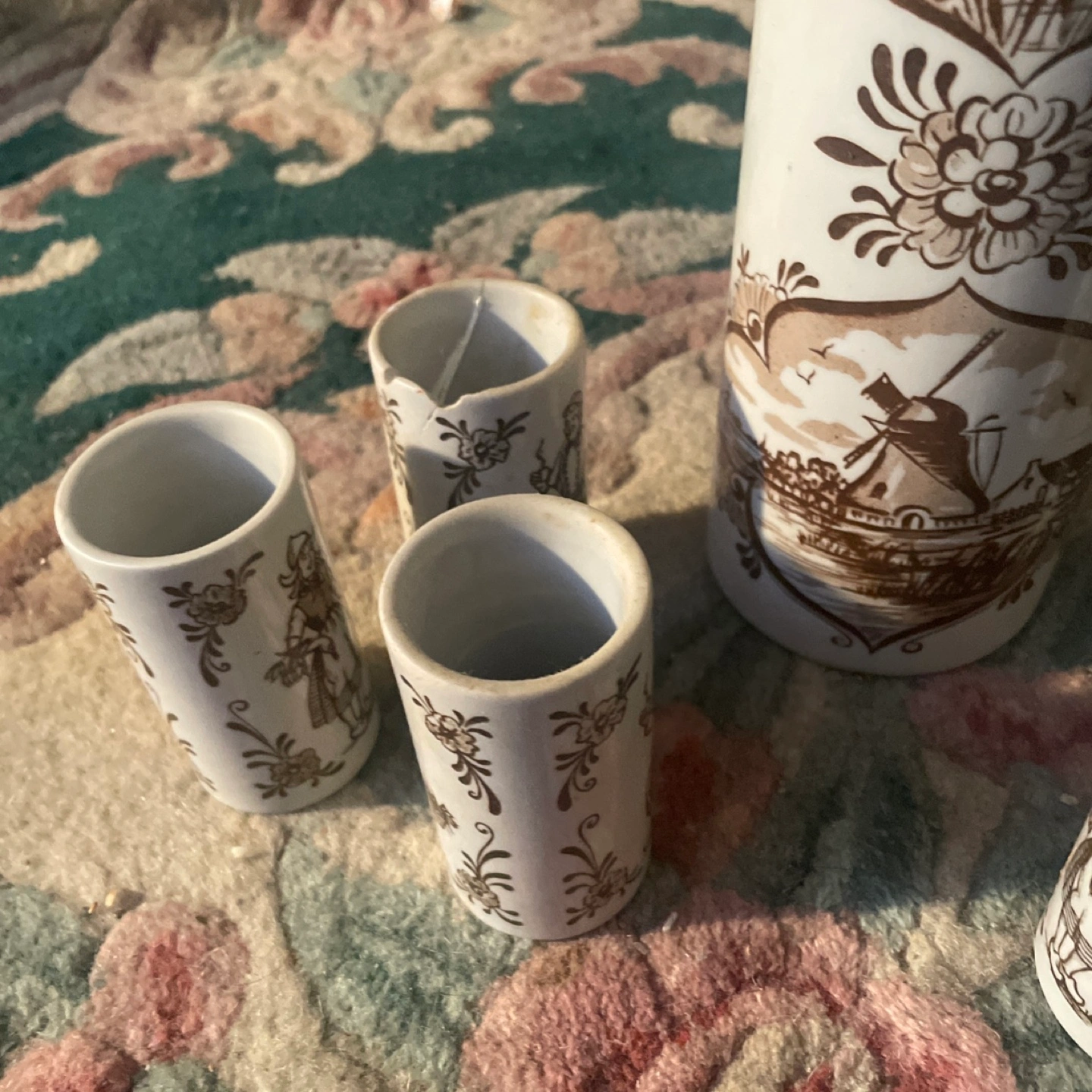 A ceramic decanter and matching shot glasses. Features a brown and white colour scheme. Some of the shot glasses have decorative designs. This set is great for any kind of drink or for decoration. From Brazil 1960s