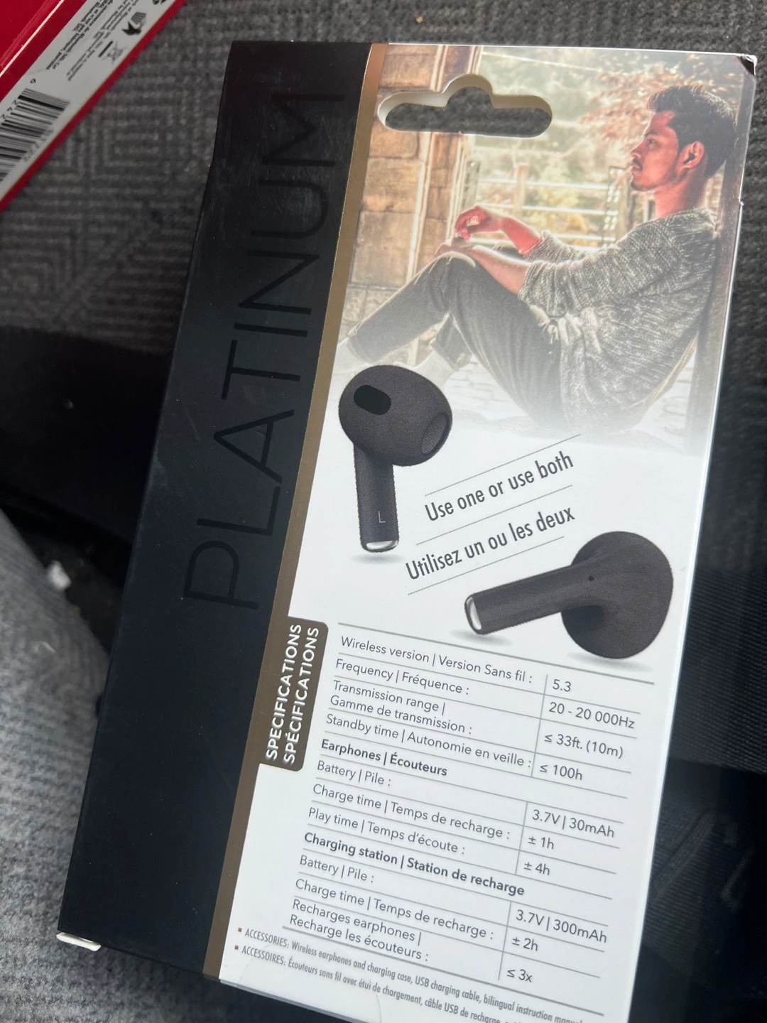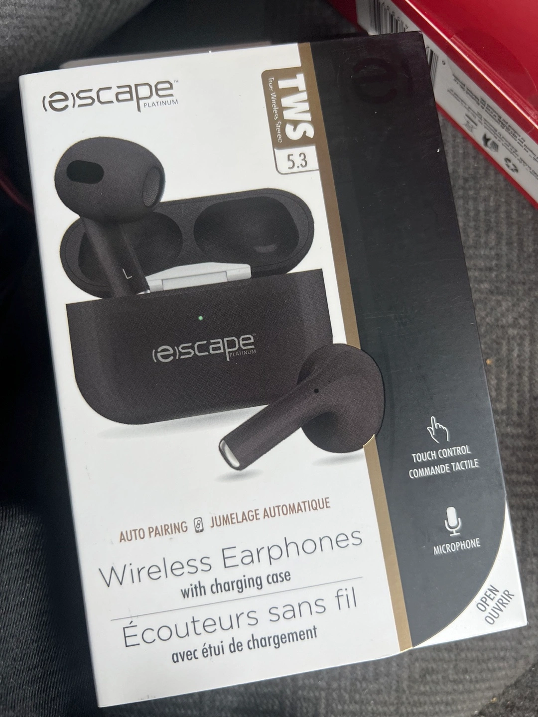 Wireless earphones with a charging case, in black. Feature touch control and a microphone. Brand New In Box. These earphones would be great to listen to a calming podcast during a commute.