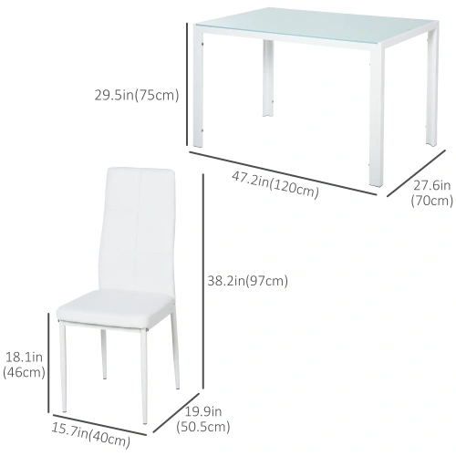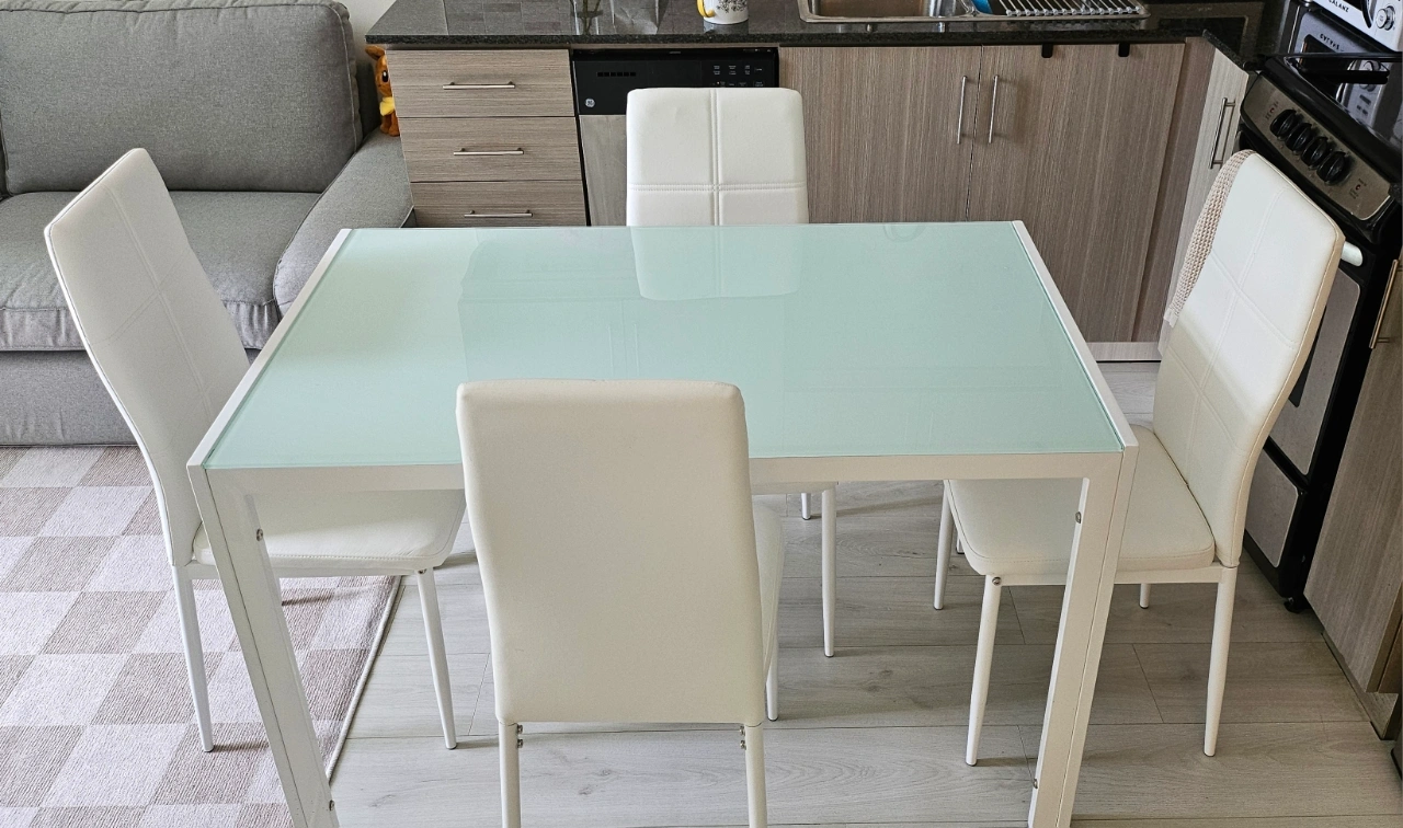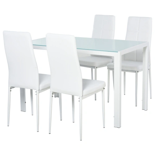 A complete dining set. Features a glass tabletop with a white metal frame. Includes four matching white chairs with a modern design. This would make a lovely spot to enjoy a peaceful meal. Price has been lowered and is set!