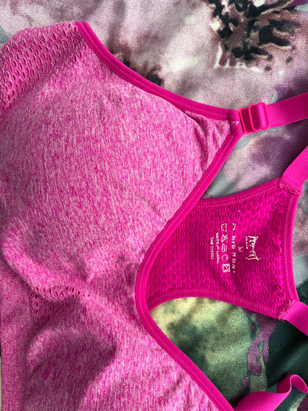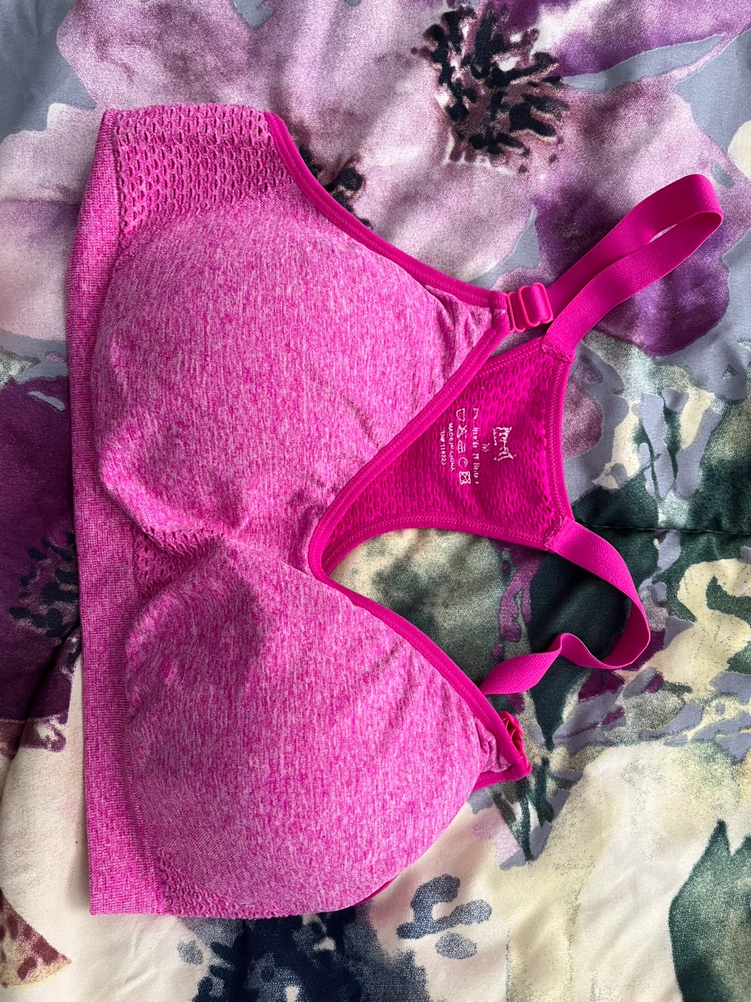 A comfortable sports bra. Features adjustable straps and clasp closure. Offers a seamless design. This bra would be great for yoga or pilates.