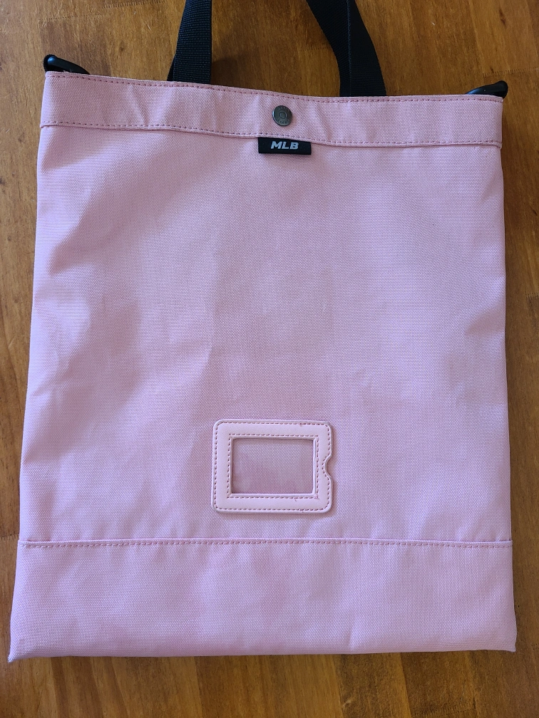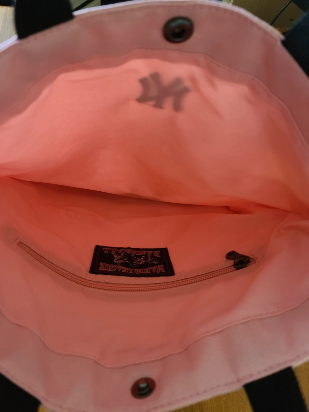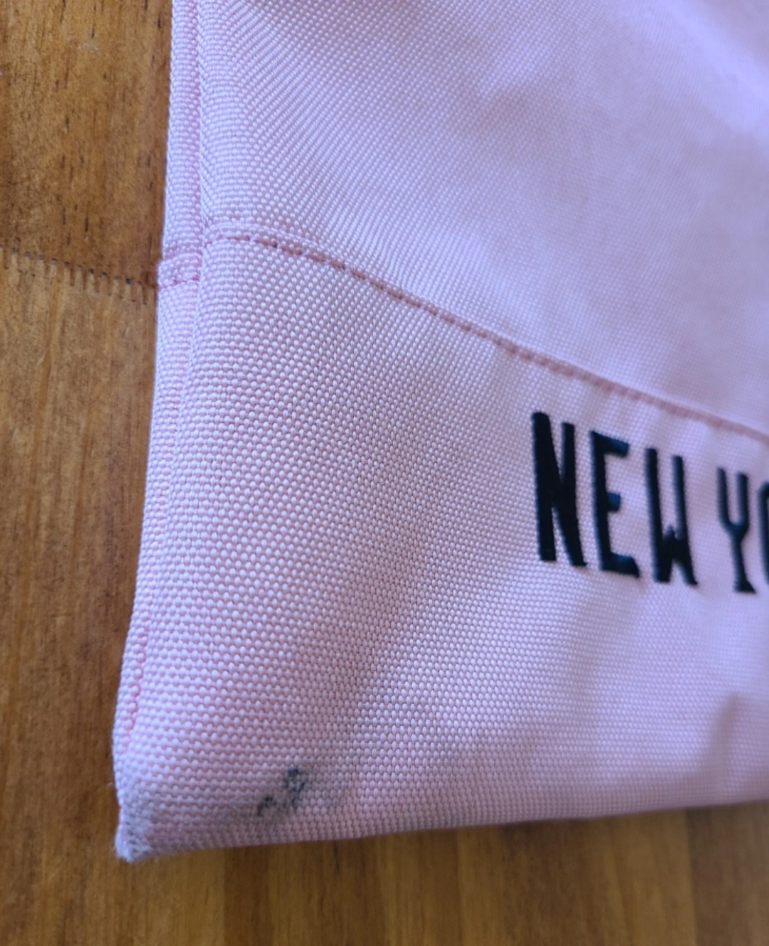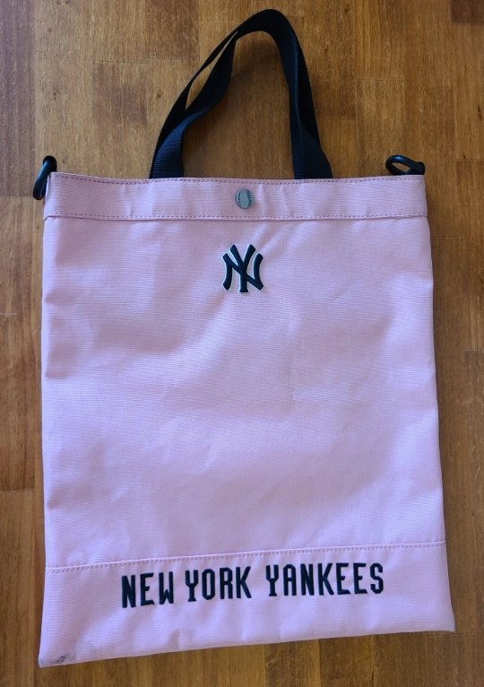 This bag is a delightful shade of pink with a simple design. It features a black strap for carrying and the "NEW YORK YANKEES" logo printed at the bottom of the bag.