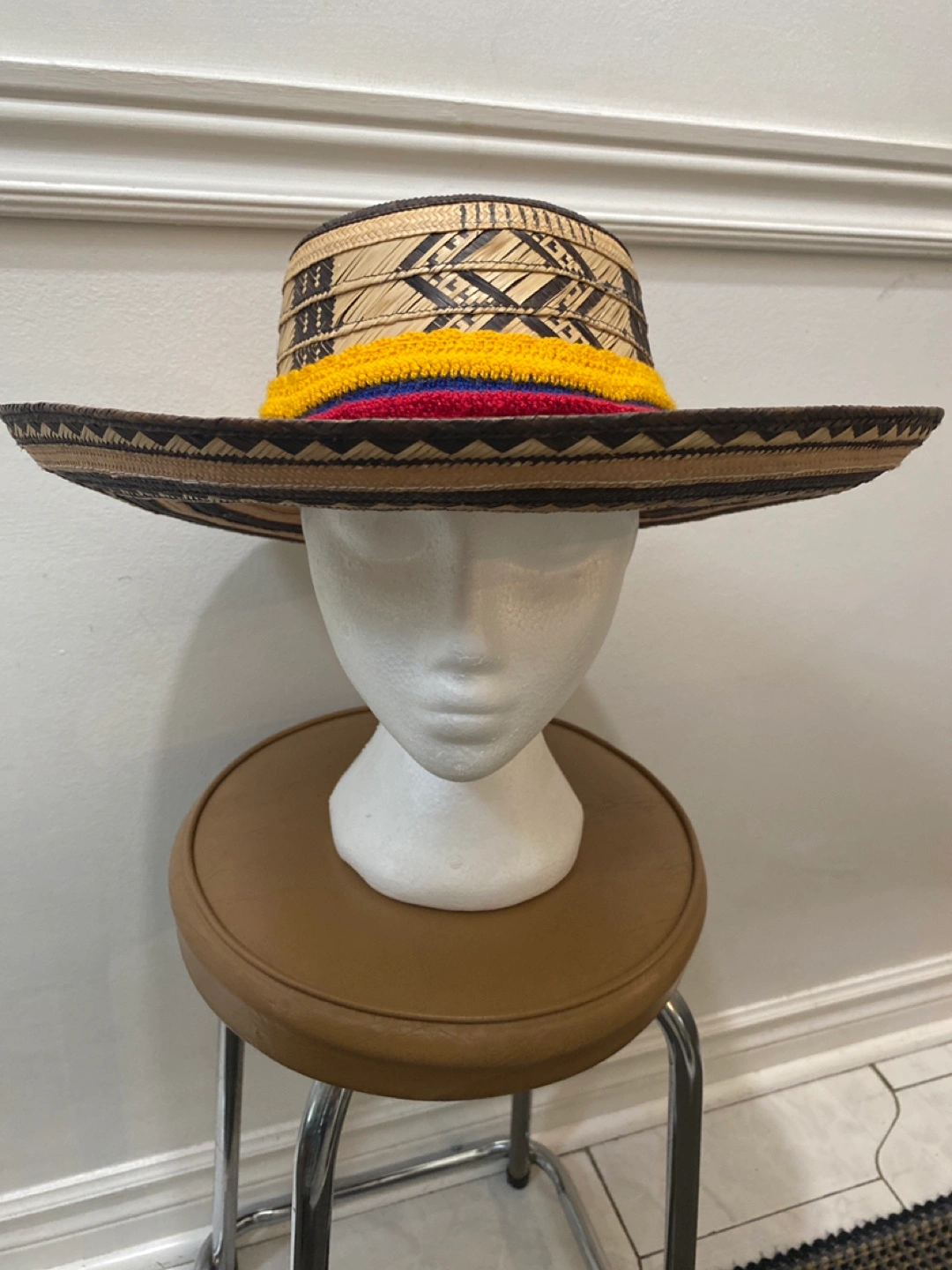 Offering a lovely straw hat. It has a wide brim and decorative band with Colombian colours. Woven with decorative patterns, perfect for sunny days.