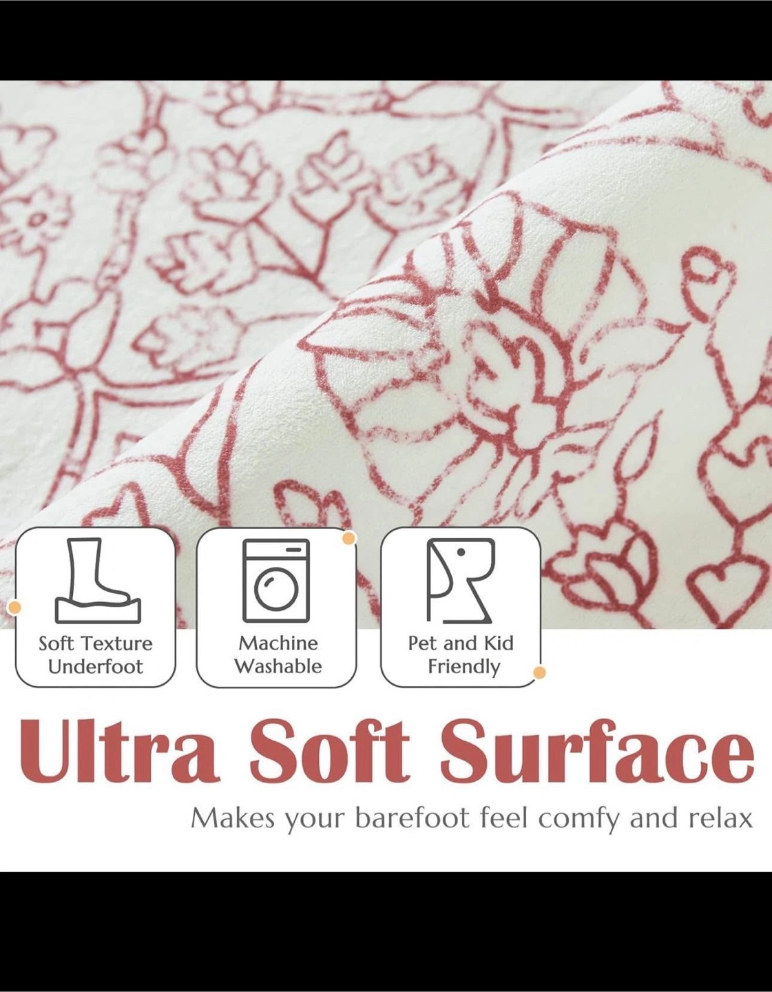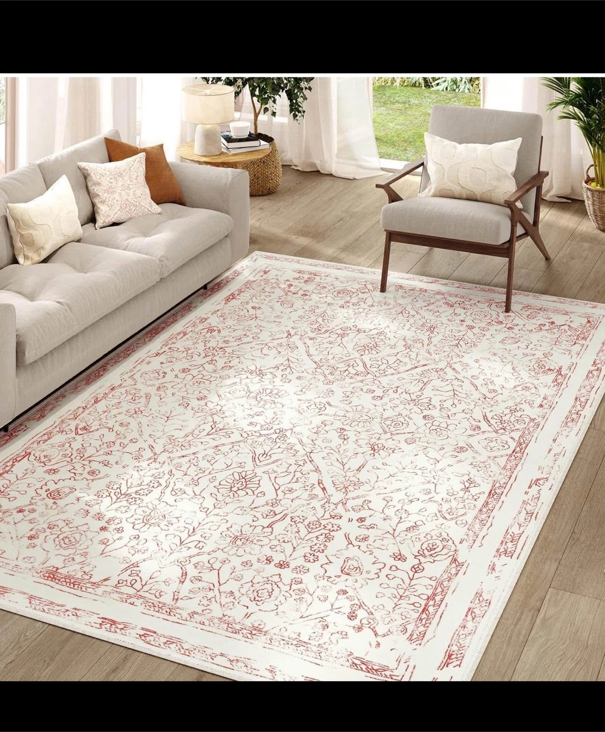 New I am selling a large area rug. Creamy colour with red details. Looks soft and has a pattern. Makes a great accent piece. You can use it to create a calming space in your home.