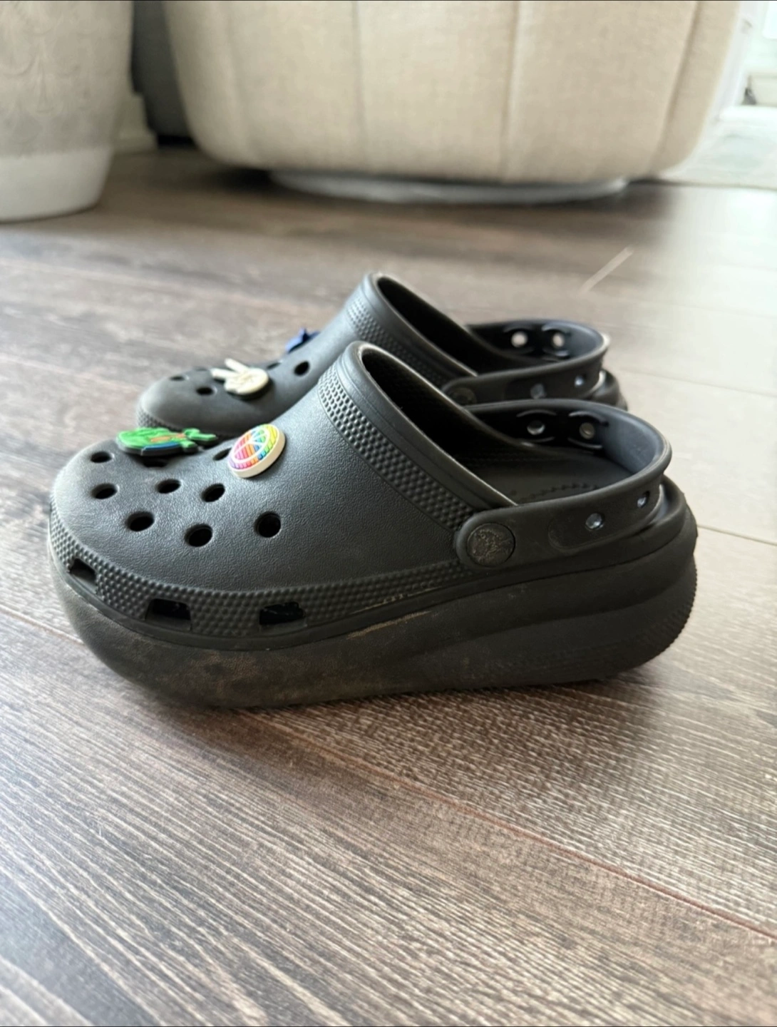 Black clogs. Decorated with assorted Jibbitz charms. Great for wearing around the house, and will help you relax.