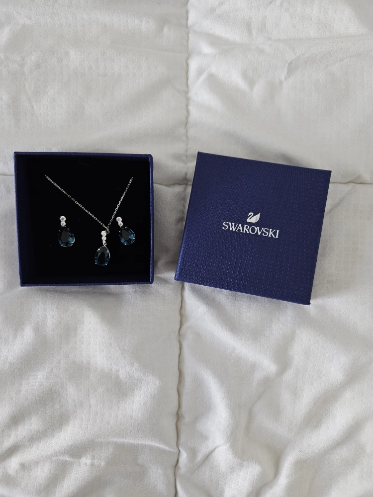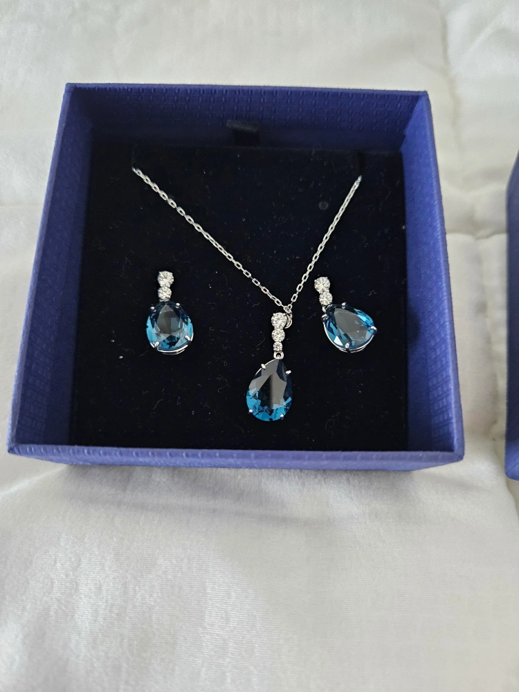 A lovely necklace and earring set. Features beautiful blue pendants. Comes with the original box. It's perfect to wear on a night out.