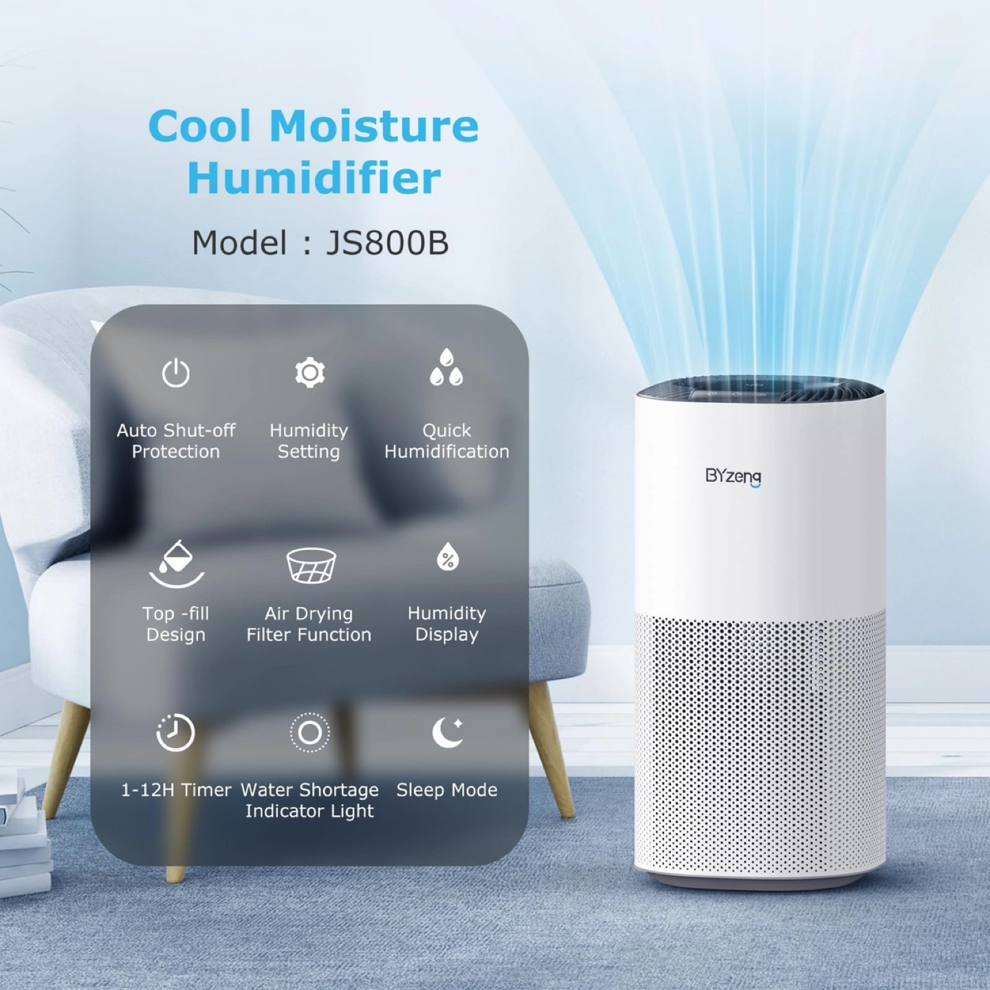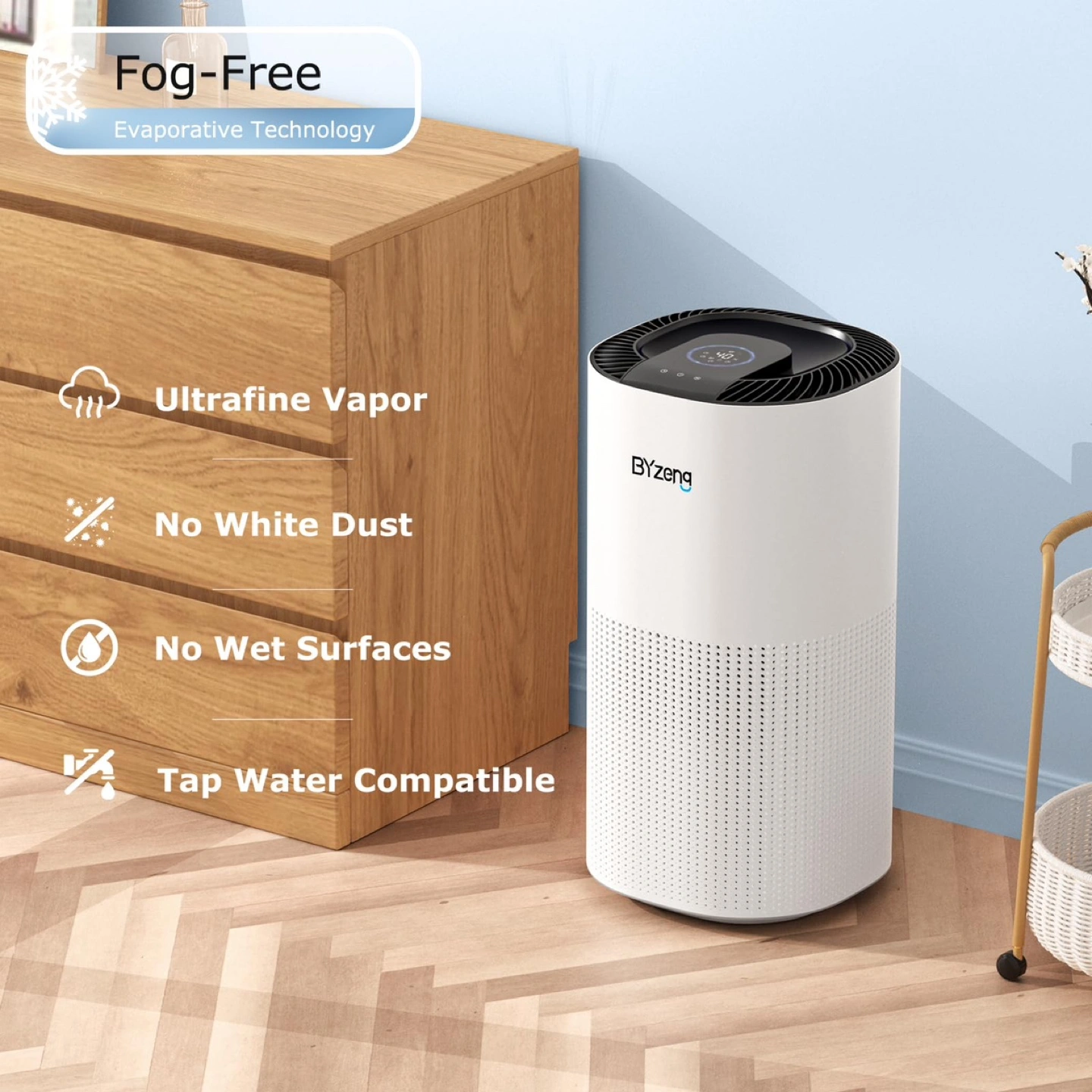 Brand BYZENG Special feature Quiet Capacity 6 liters Floor area 650 Feet Operation mode Evaporative Runtime 36 hours CLEANER INVISIBLE MOISTURE – Byzeng Cool Moisture Humidifier effectively brings invisible moisture to your home. It utilizes a wicking filter to help treat the water and capture minerals to keep them out of the air for a cleaner mist. EVERYDAY COMFORT – This humidifier for home features evaporative technology that increases and holds the targeted humidity level to optimize moisture in the room. It’s ideal for everyday comfort and year-round relief from dry throat and dry, itchy skin. EASY TO USE – Featuring a large 6L, easy-fill, self-standing tank, this cool moisture humidifier provides up to 36 hours of run time. Plus, it’s easy to clean – all parts that touch water can be cleaned in the dishwasher. HUMIDIFIER FOR BEDROOM – As the ideal humidifier for baby, this device has a soft, fan-like sound to add restful noise to any room. Great for an adult or child’s bedroom, the large tank can run overnight, providing consistent soothing moisture. Worry Free- Nice Service: We offer 120 days of free exchange,1-year quality assurance, 7 x 24h customer service, and lifetime tech support for this humidifier. Please contact us freely through the order detail page if you have any questions about this product, we will get back to you within 12 hours to help you resolve the issue. Please pick me as your home helper!