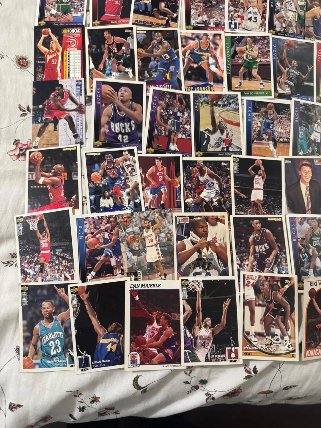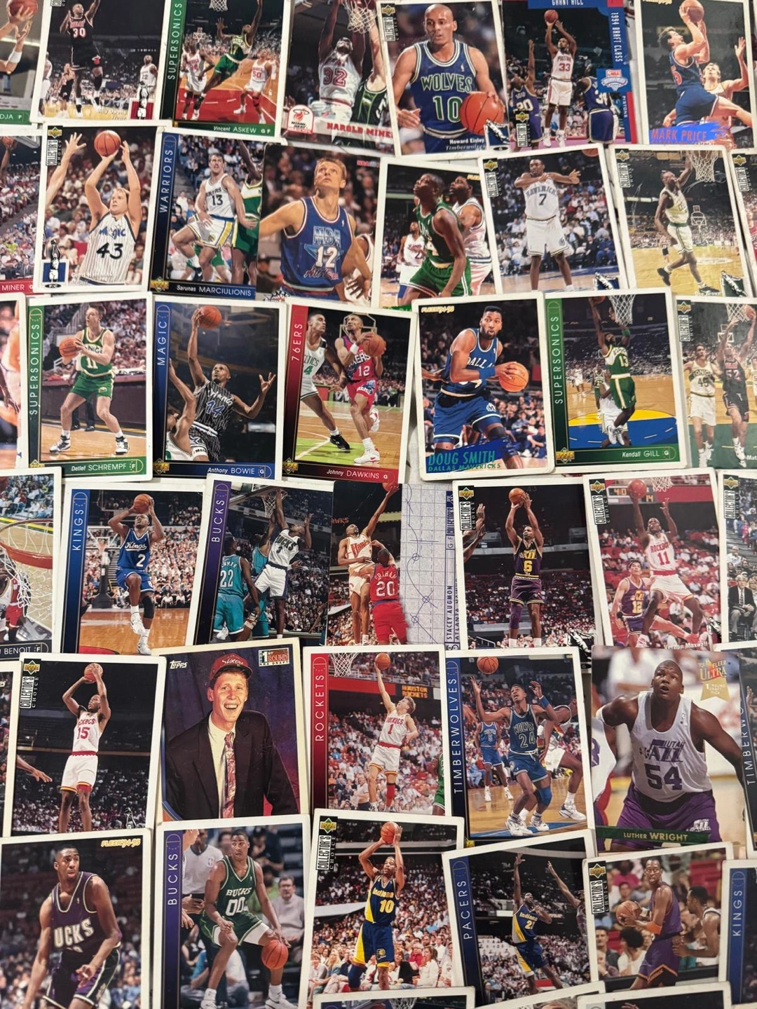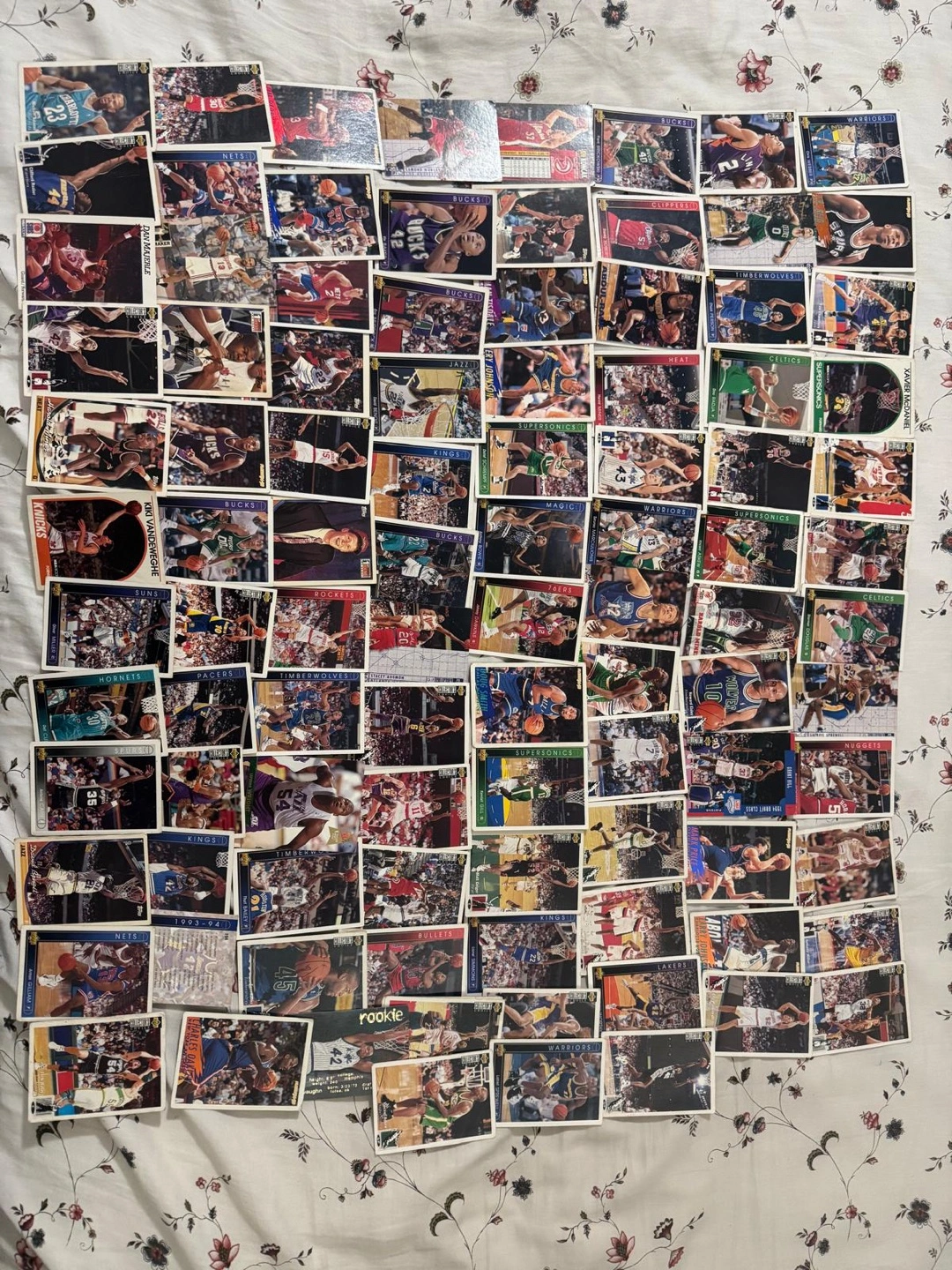 A large collection of 100 basketball trading cards. Many cards feature players in action. A fun purchase to look through on a rainy day.