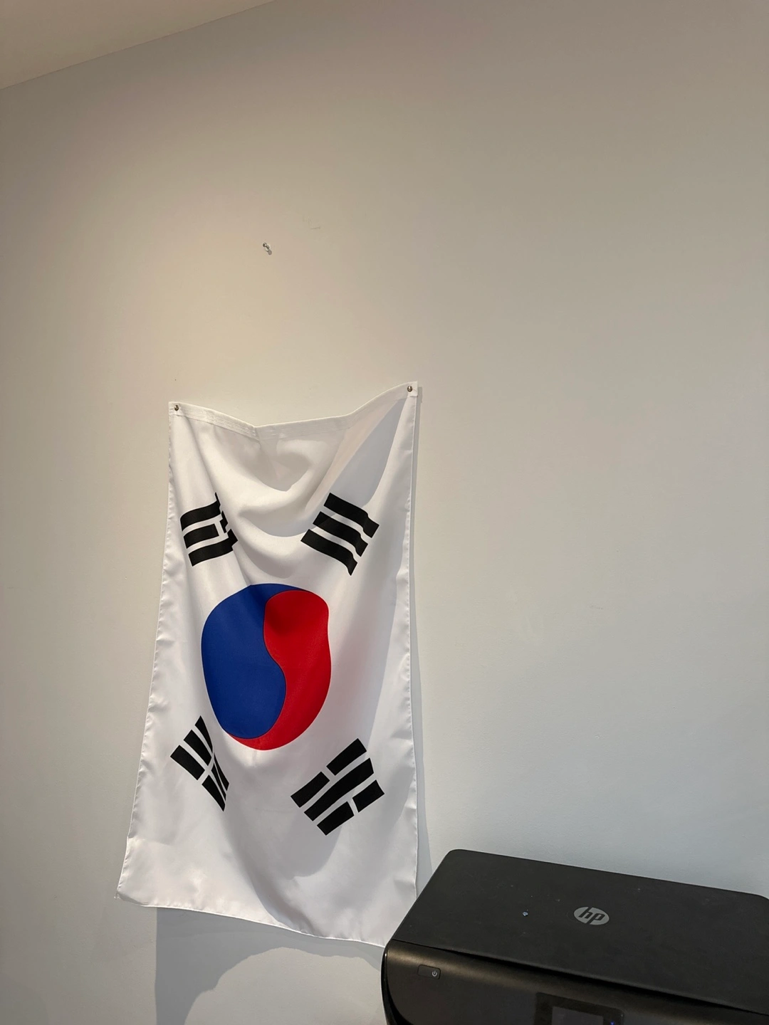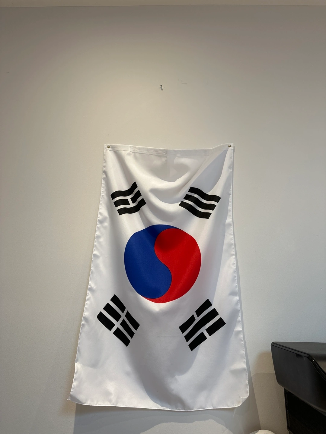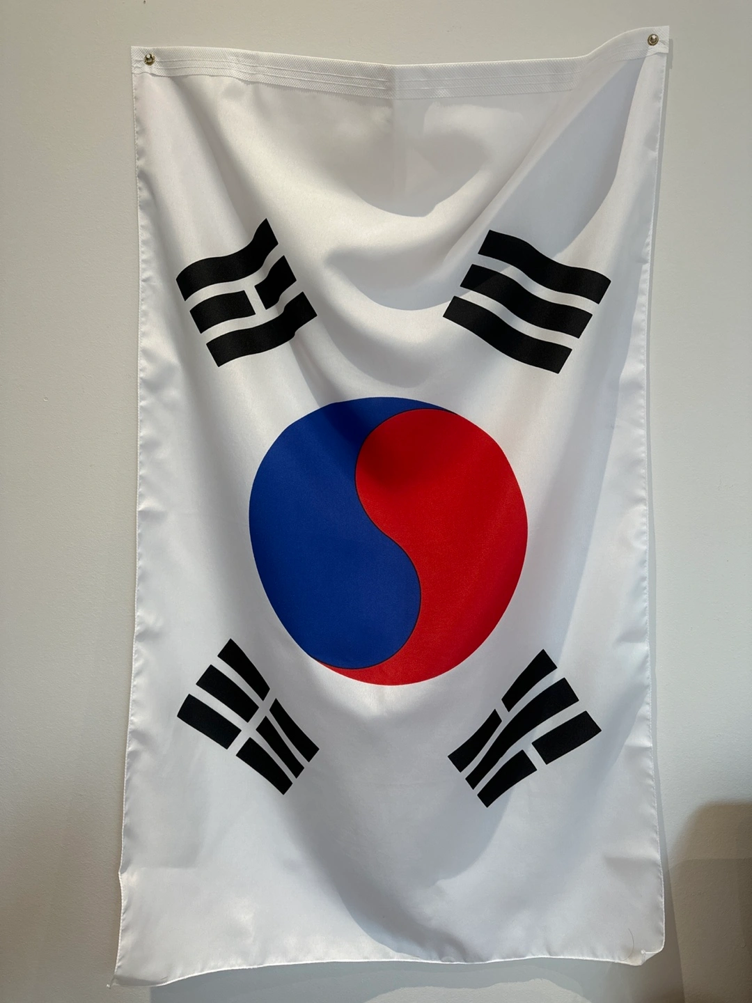 Originally South Korea flag from South Korea. White flag with the South Korean national emblem. Features black bars in each corner. Red and blue symbol in the center of the flag, it would be perfect for a classroom, or a world traveler's bedroom.