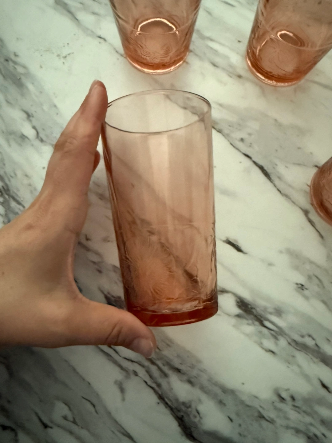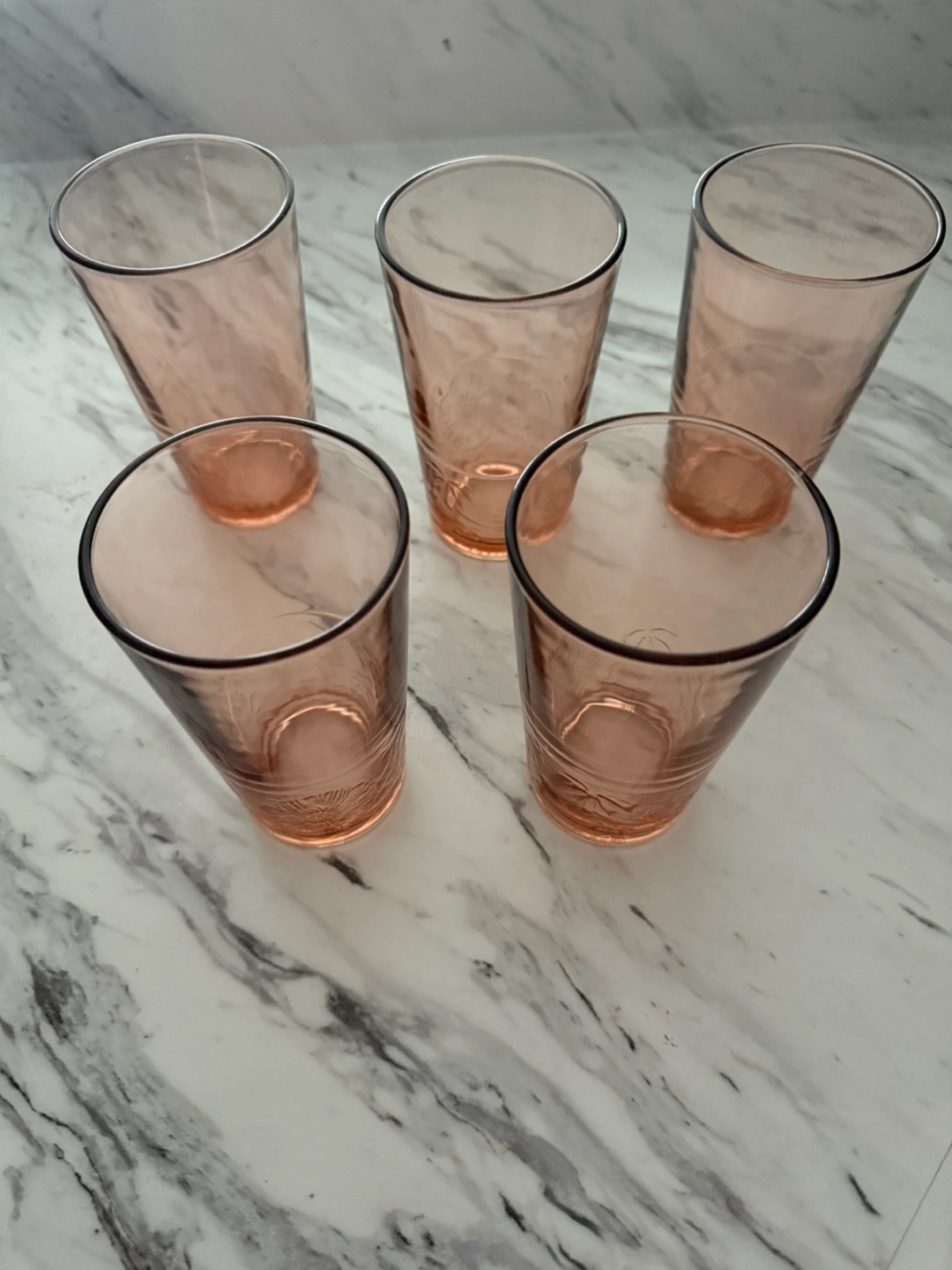 Set of five pink tumblers. The glass is etched with a delicate pattern. Perfect for a refreshing drink after a long day.