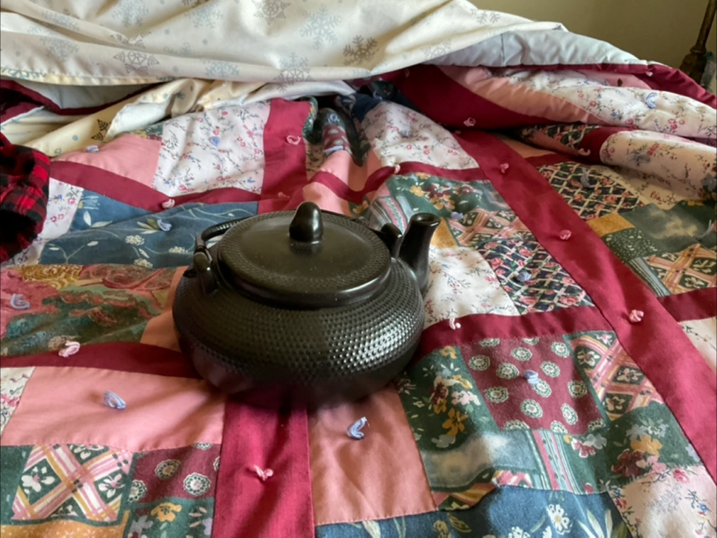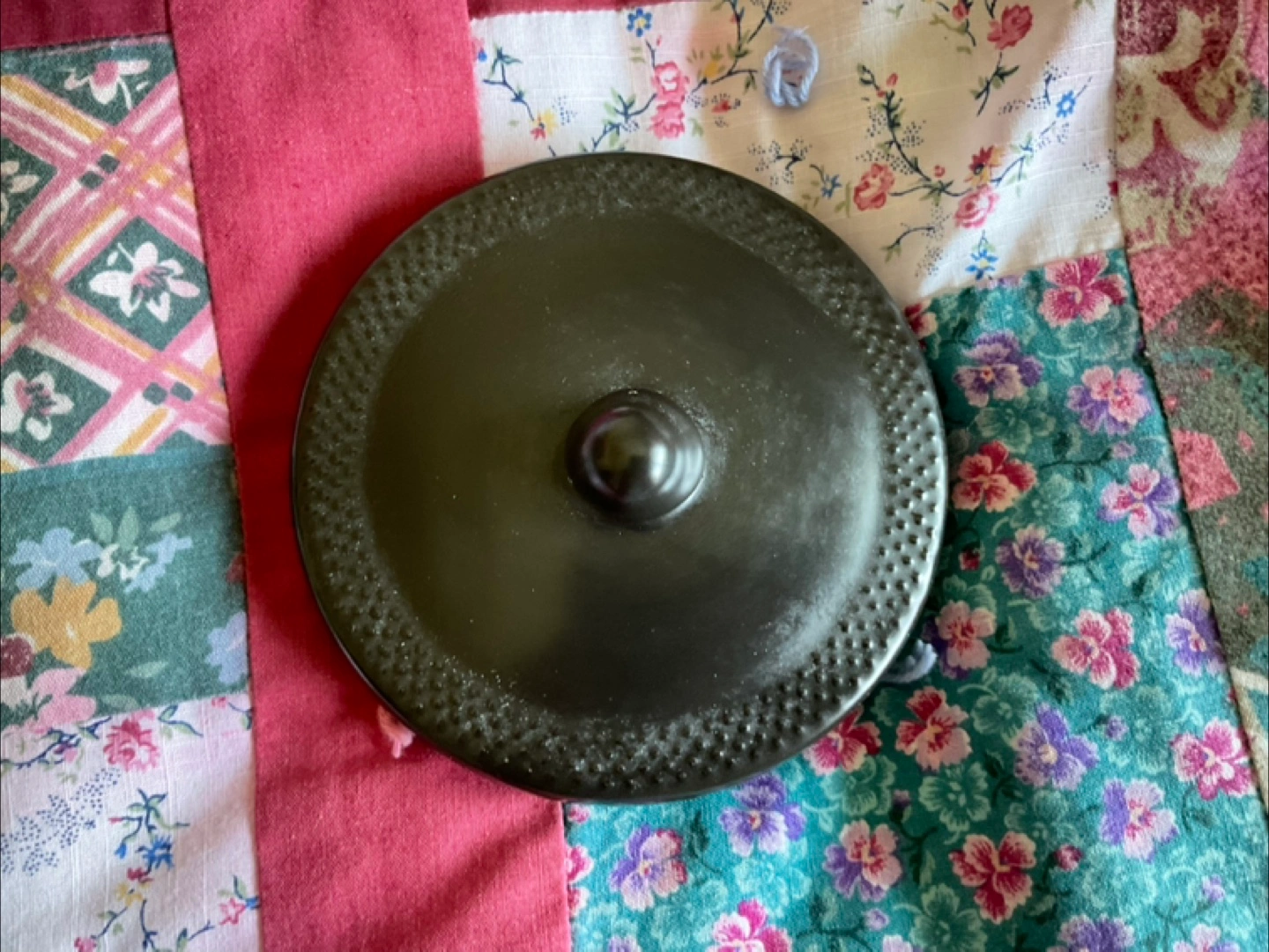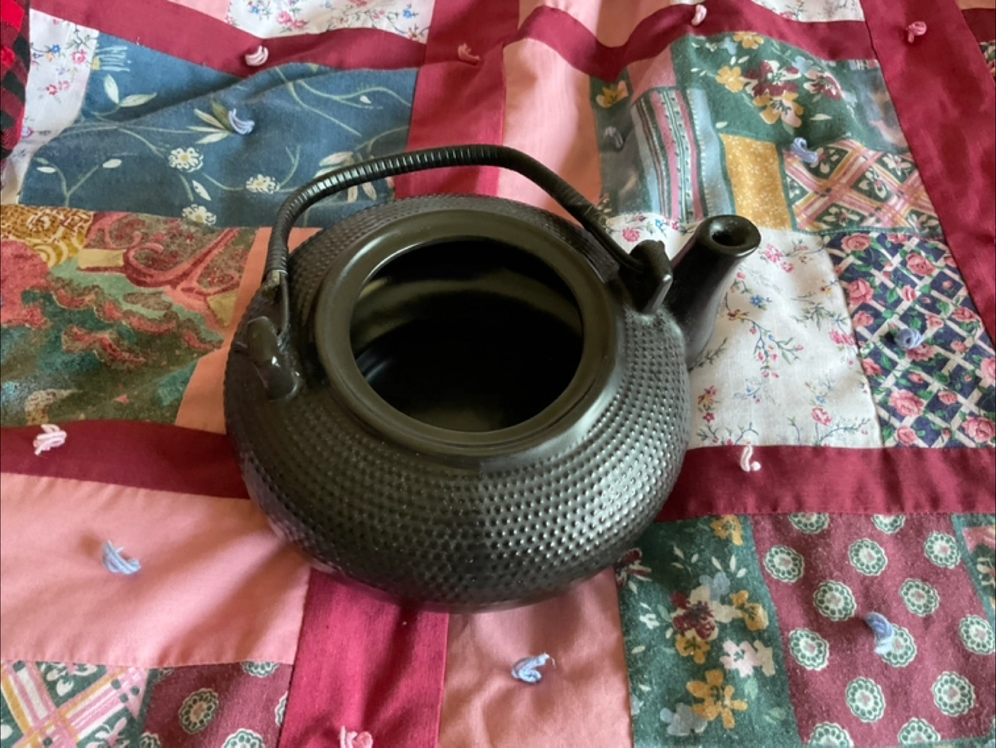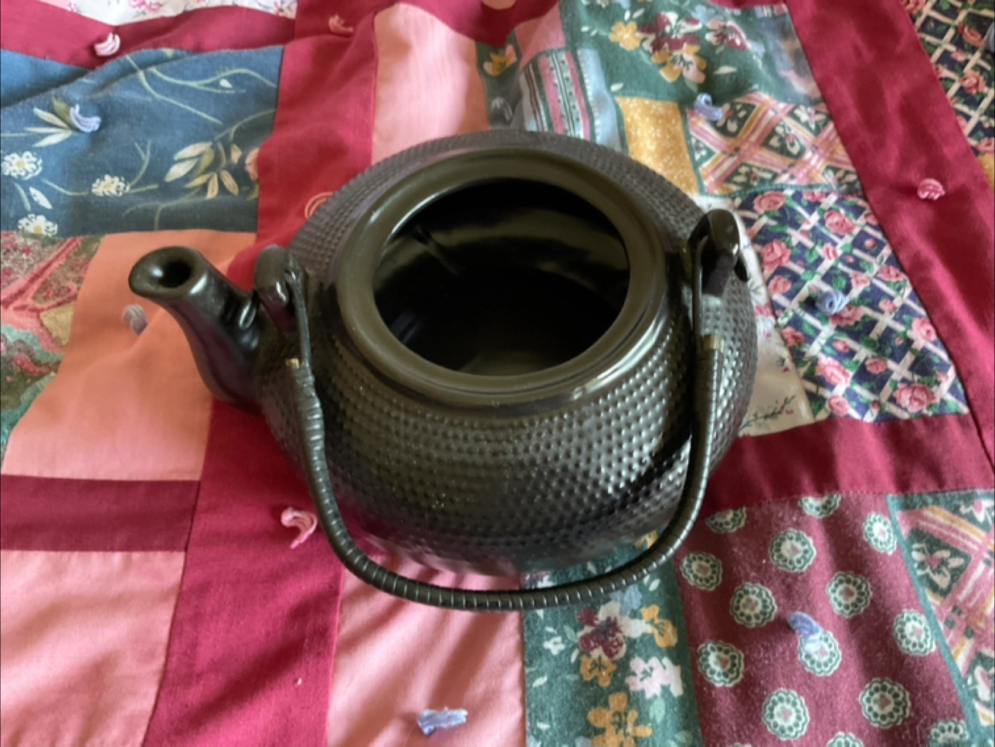 A beautiful black teapot. The Handle for easy pouring. A lovely addition to any tea time, to help you relax with a cozy beverage. This is an antique tea pot and holds about 3 cups of tea. It has never been used only as a decorative piece.