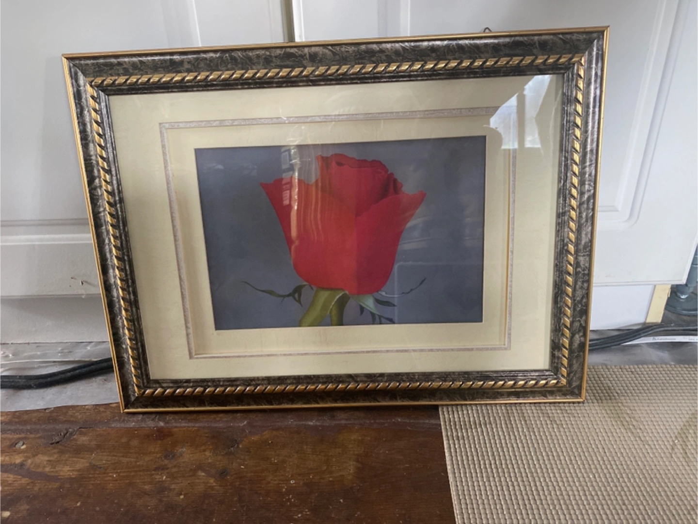 A framed floral print. The frame is a combination of gold and dark-brown tones. The print features a red flower. A beautiful addition to any room.