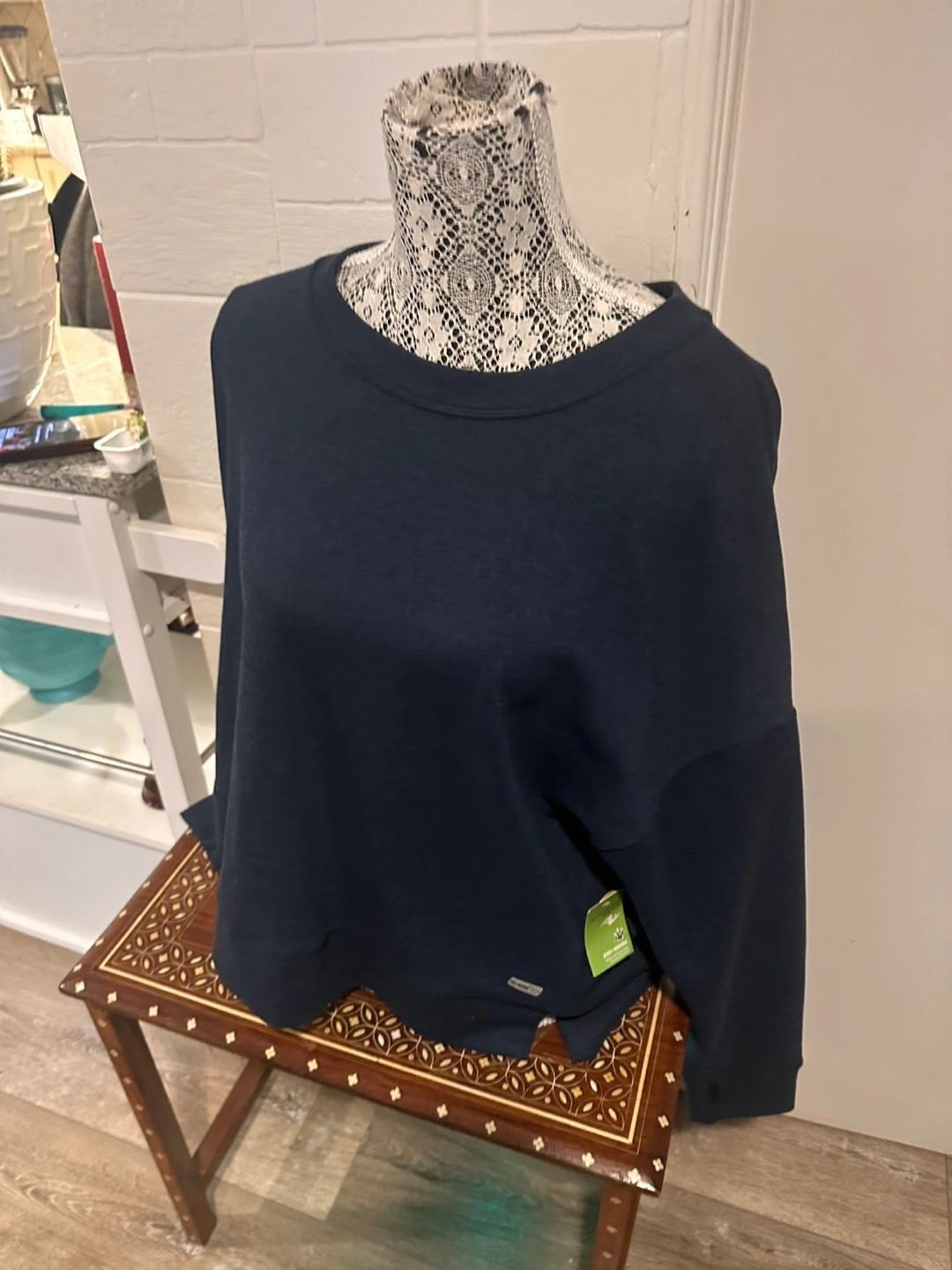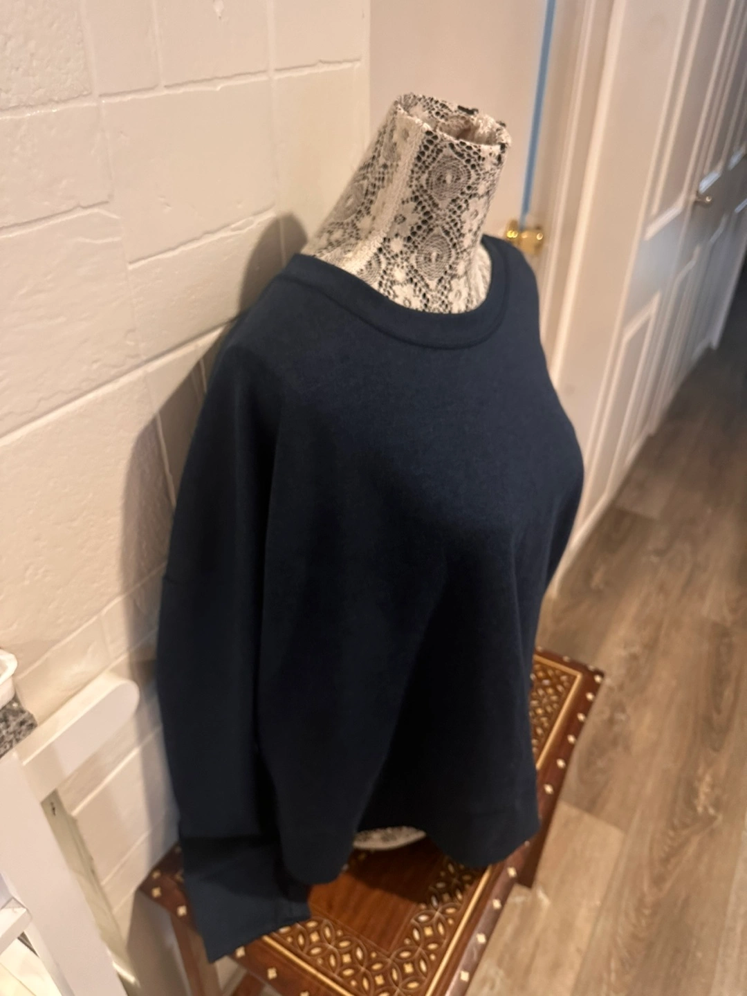 A classic, crew neck style sweatshirt. The sleeves are long. Its colour is navy. Snuggle up and enjoy the simple things in life.