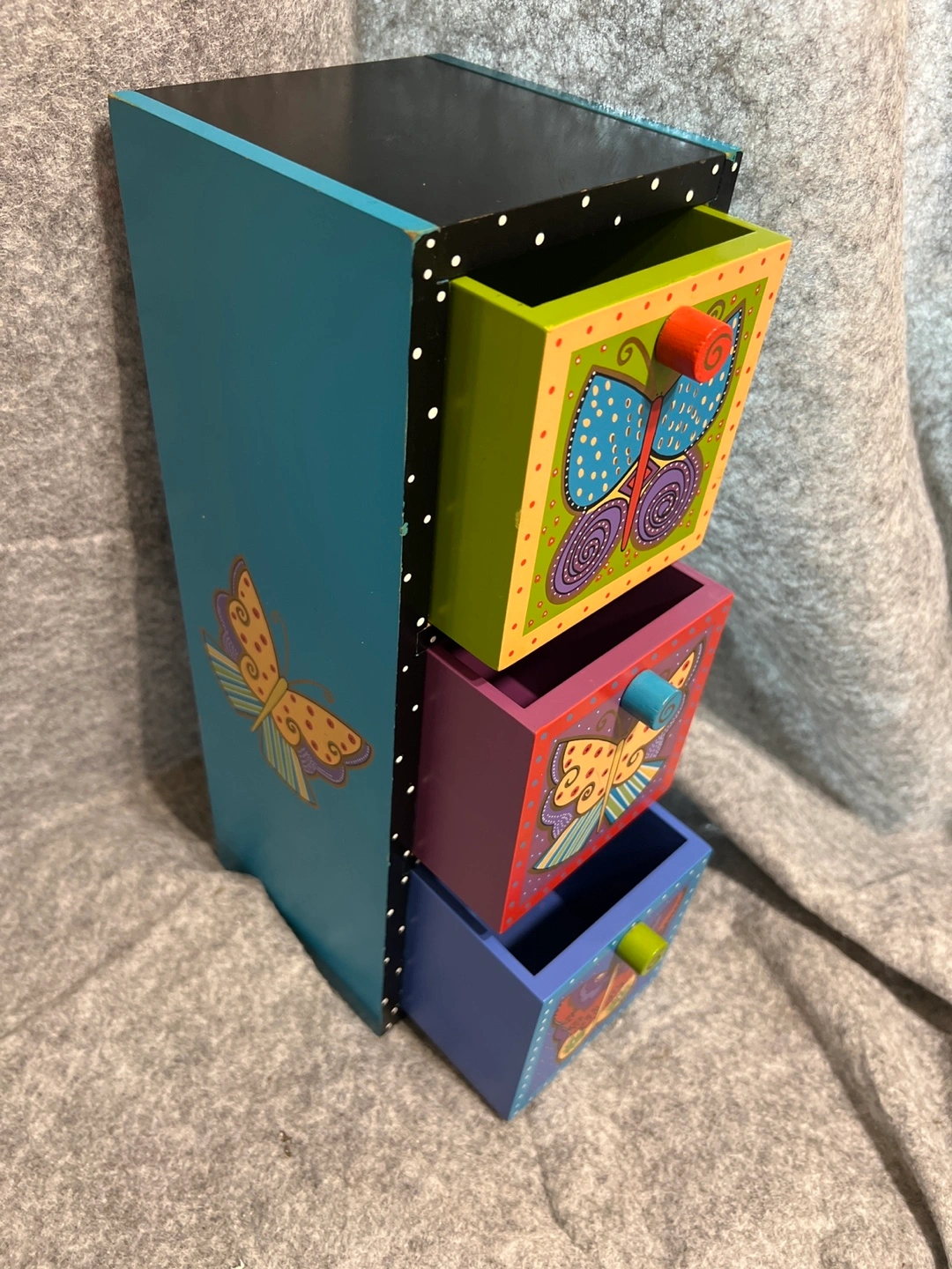 A wooden box with three drawers. Each drawer is painted with a unique butterfly design. The main body painted blue with a butterfly decal. A great item to keep your favourite things organized, which can bring a sense of peace.