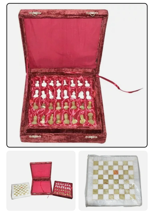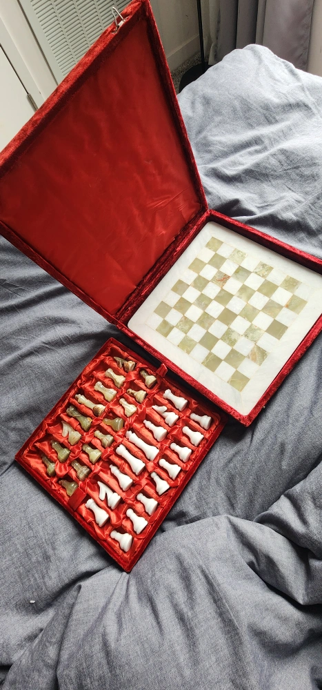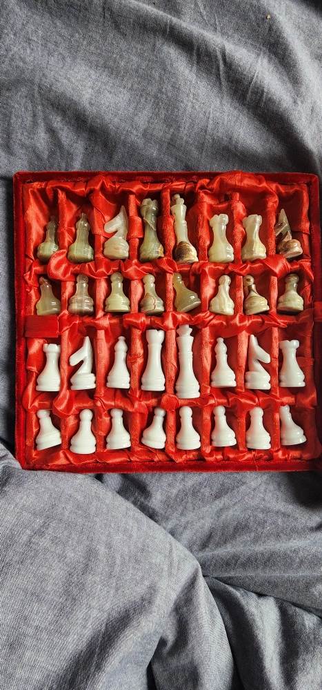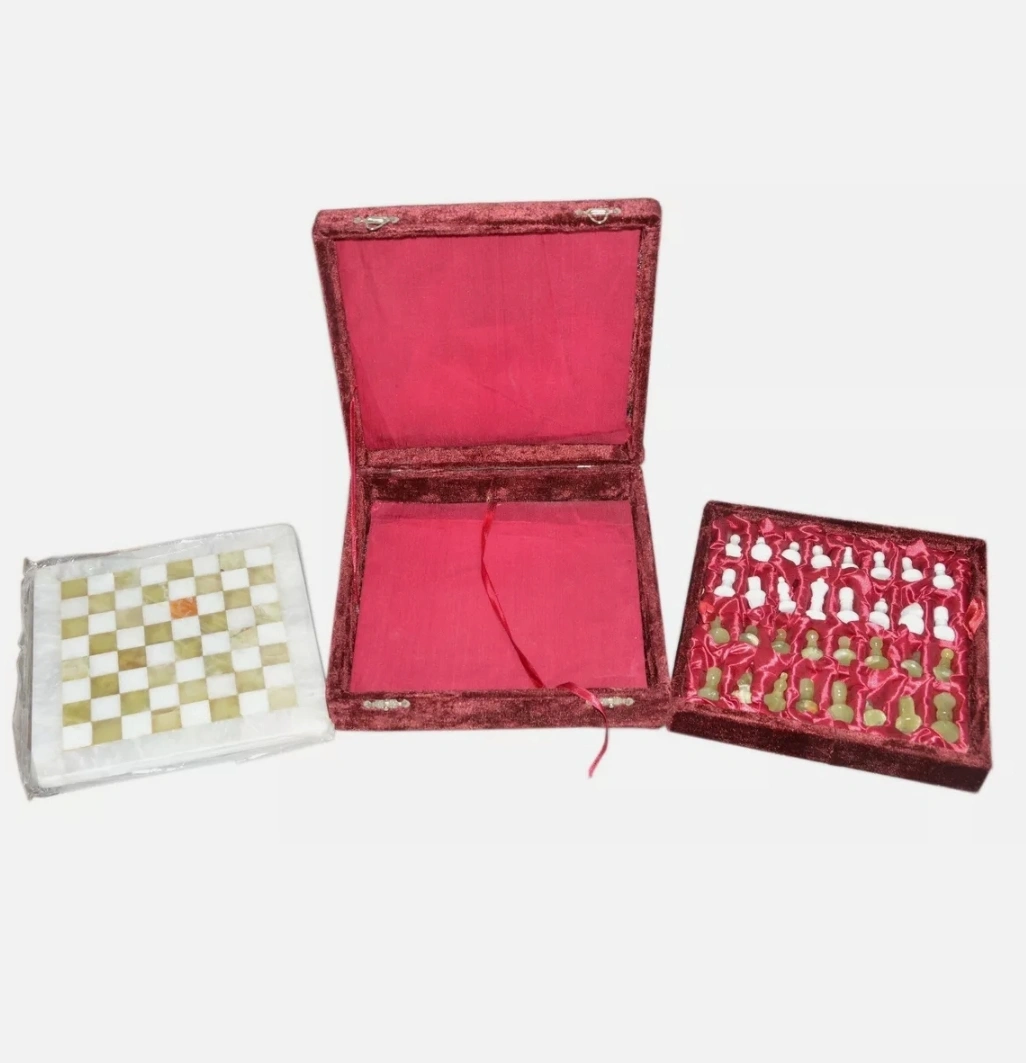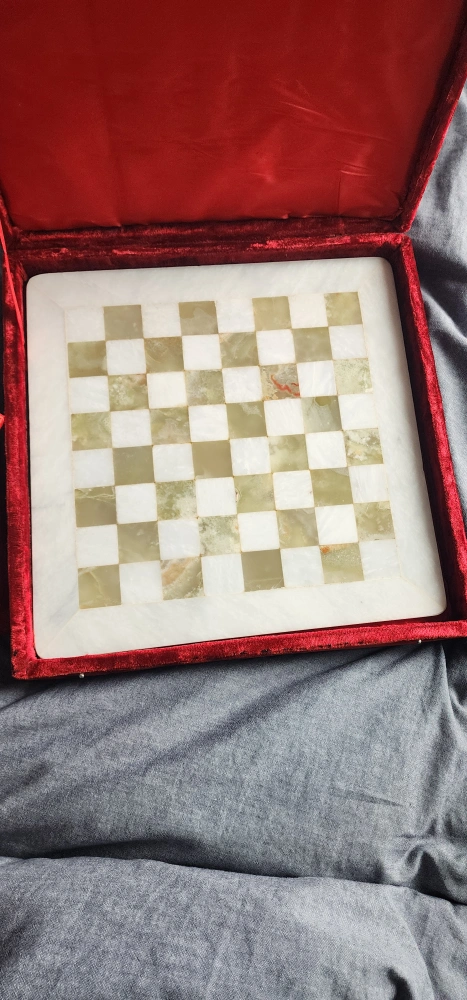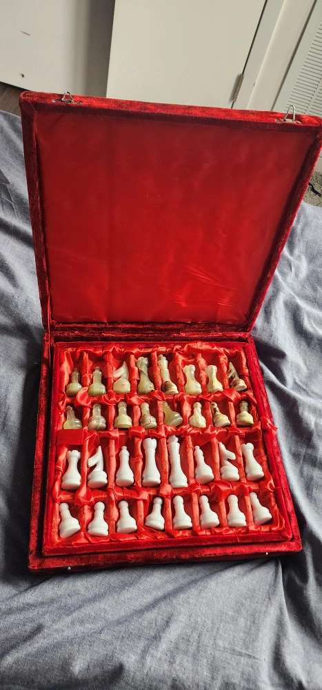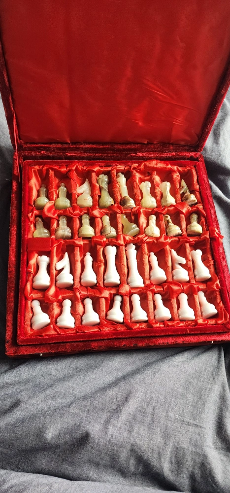 Original Case. Vintage Chess Set No damage as shown in photos. Condition: collection, excellent. Marble Onyx Figures - Handmade H1,5" Case Velvet Burgundy Color. In the original case. I am pricing cheaper than average prices so someone can enjoy this beautiful chess set instead of it sitting around my grandparents house - I have seen many of these for sale and are upwards of $100-$150+ Sizes: figurines(height)- 1,50" ( 38 mm) Case- 9,05" х 9,05" х 2,36" (230 х 230 х 60 mm). Total weight: 4,84 lb ( 2200 grams). You buy what is shown in the photo. As is. Pickup is on River St in Toronto Can bring to beavermead area in PTBO *Delivery extra depending on distance*