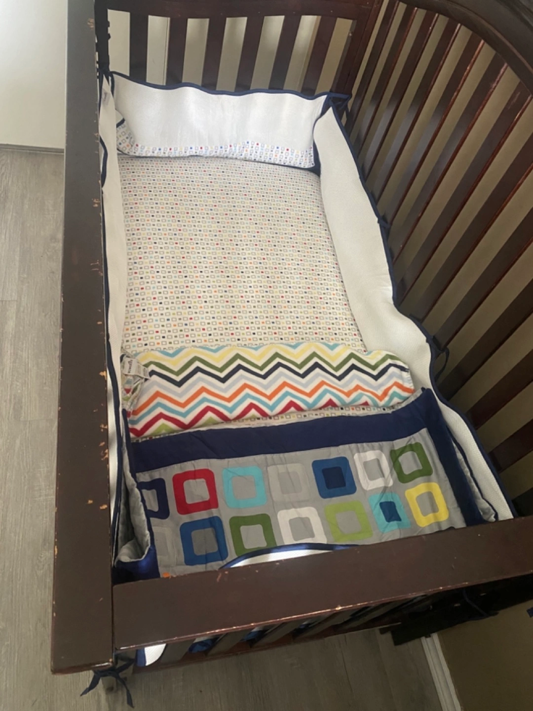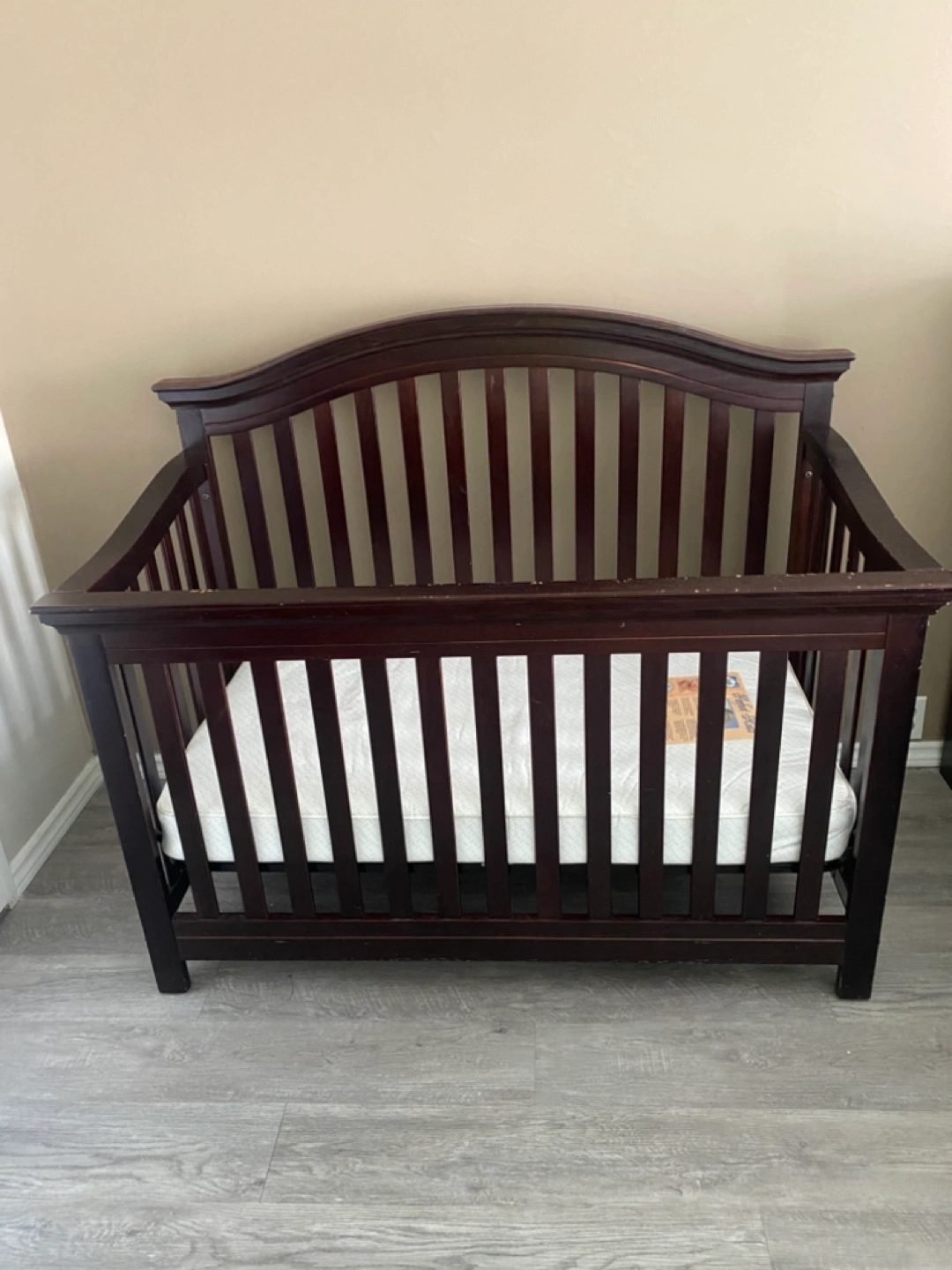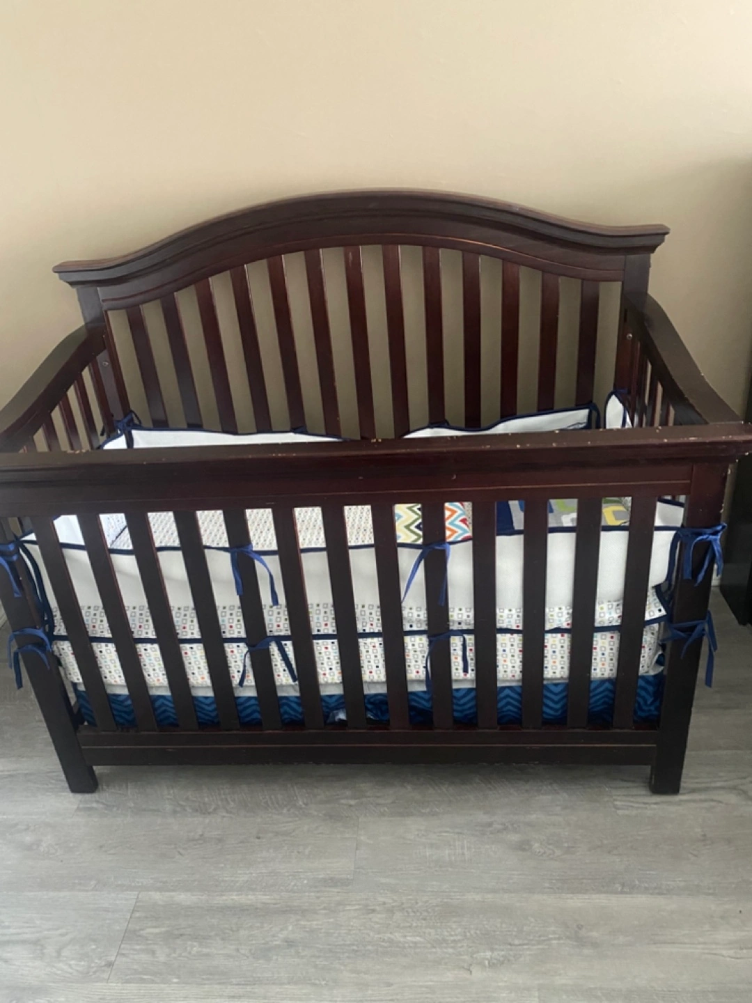Selling 4 in 1 convertible crib made of solid wood. Used handful of times as I co- sleep my baby. Selling with mattress as good as new. Will also throw a crib set which includes baby bumper, a fitted sheet, 1 comforter, 2 extra blanket (My baby didn’t use the comforter and blanket at all) included for free It features a highly functional design that allows the crib to be transformed to a toddler bed, a daybed and a full-size bed to accommodate your growing child. Adjustable mattress heights for convenience when baby learns to sit or stand