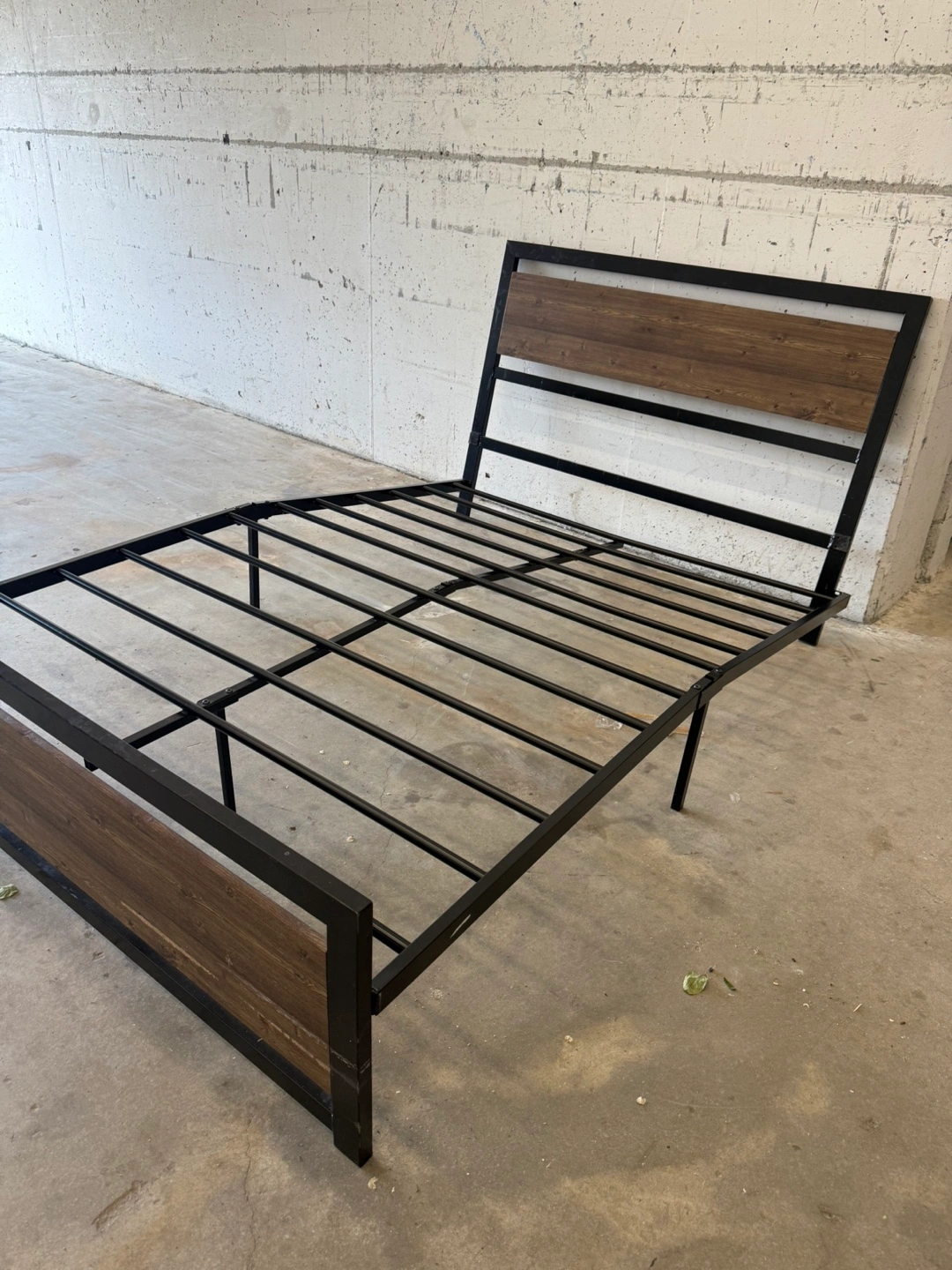 Bed frame made of metal and wood. Features a headboard and footboard. An excellent way to get a restful night's sleep.