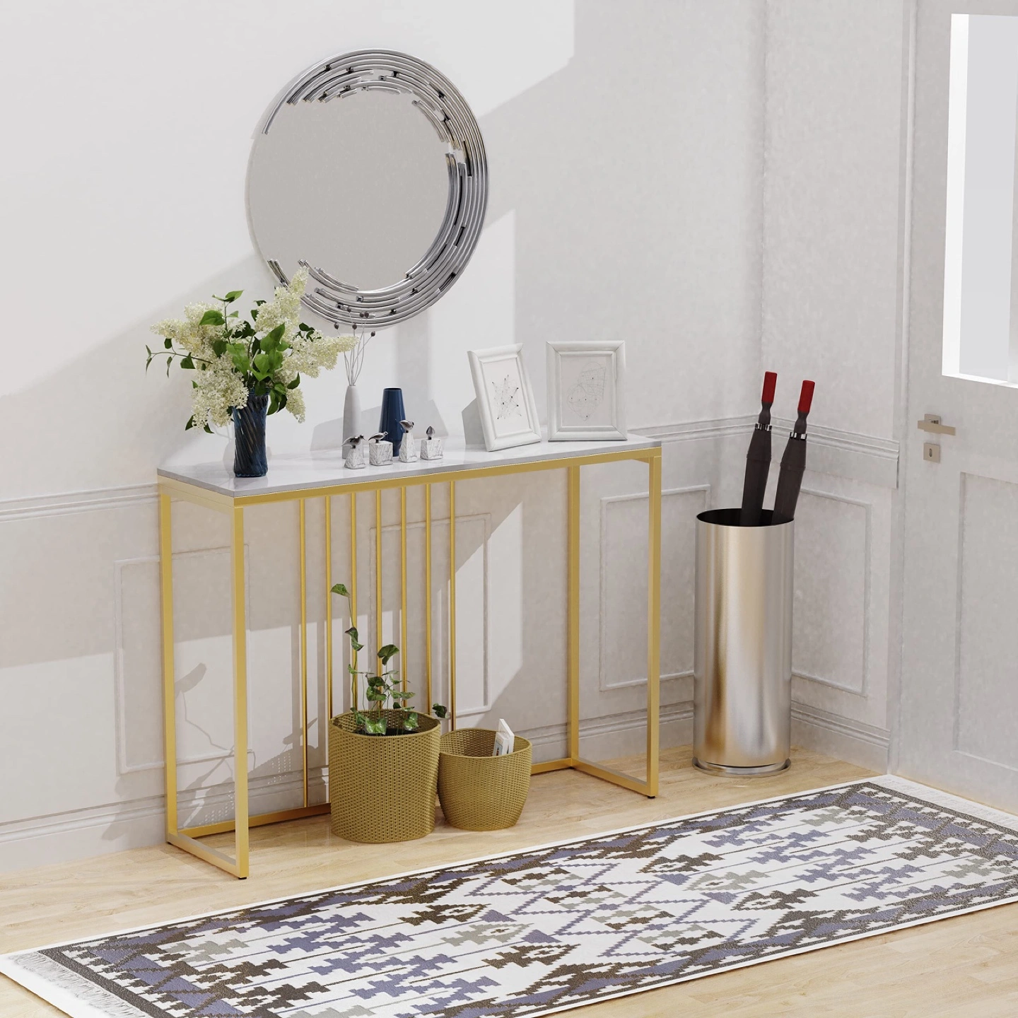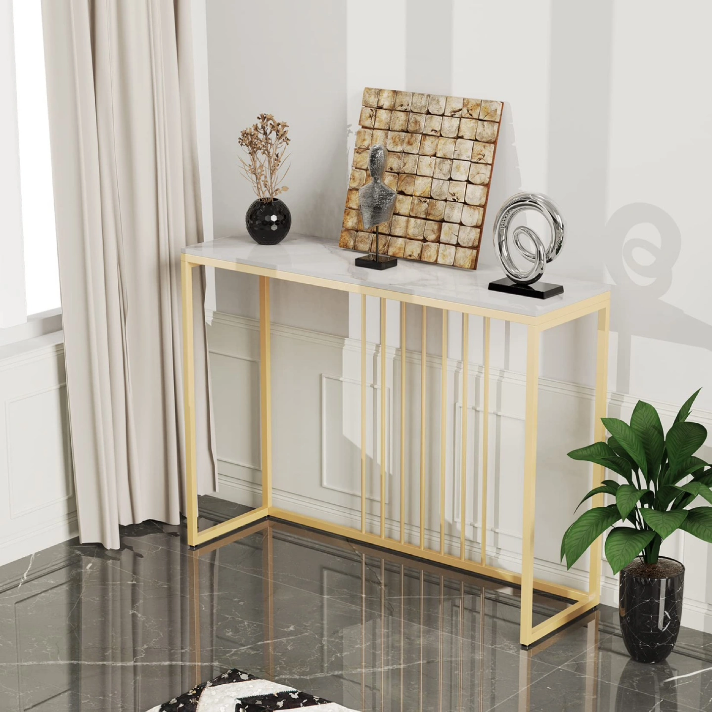 Brand new in original box Please check images for designs and prices DM for more information on any design. Pickup/Delivery available all over GTA Product Dimensions 30D x 100W x 78.5H Centimetres Item weight 13.55 Kilograms Maximum weight recommendation 50 Kilograms Frame material Metal Colour White Luxury Console Table - Combined golden metal frame and high gloss sintered stone table top into a luxury console table. This rectangular accent table features a smooth marble texture tabletop in white supported on a metal frame in gold, which provides an elegant effect. When decorated, a hallway console table can give guests a sense of your interior style and add a lovely, lived-in quality to your home Strong Genuine Sintered Stone - Compared to a glass and MDF board table top, the marble console table made by new-style but stronger sintered stone, which features good toughness and hardness than marble. High density, non-permeable, anti-scratch, high temperature resistance up to 1200℃. The strong durability will last you for years to come. Board thickness: 10.7mm Golden Metal Frame with Adjustable Bases - The accent table supported by golden metal legs is as sturdy as they get, max load 50kg, anti-rust and wear-resistant. The design of the table leg is light and slender, so that the whole looks not so bulky. 4 adjustable and non-slip base will help you adjust the height of each leg to fit the floor to keep the table level. While it can also protect the floor from damaging by the metal frame Decorative Console Table - Marble console tables will look fabulous adorned with a classic vase filled with fresh flowers, a few coffee table books, picture frames, candles, or a beautiful lamp! We recommend hanging a wall mirror above your hallway console table – it'll not only fill the empty space above the table, but it will also give you a place to touch up your appearance before leaving the house Easy to Assemble - All hardware and instruction are provided, read the steps carefully and assemble the table. It’s a table that is placed either to the side or in front of your door as an integral hallway idea. It was a place, and still is a place for some, to plug in the best landline phone. It is also a place to pop your keys, store magazines, or any other odds and ends that don’t quite have a place anywhere else like entryway, corridor, living room, office, couch