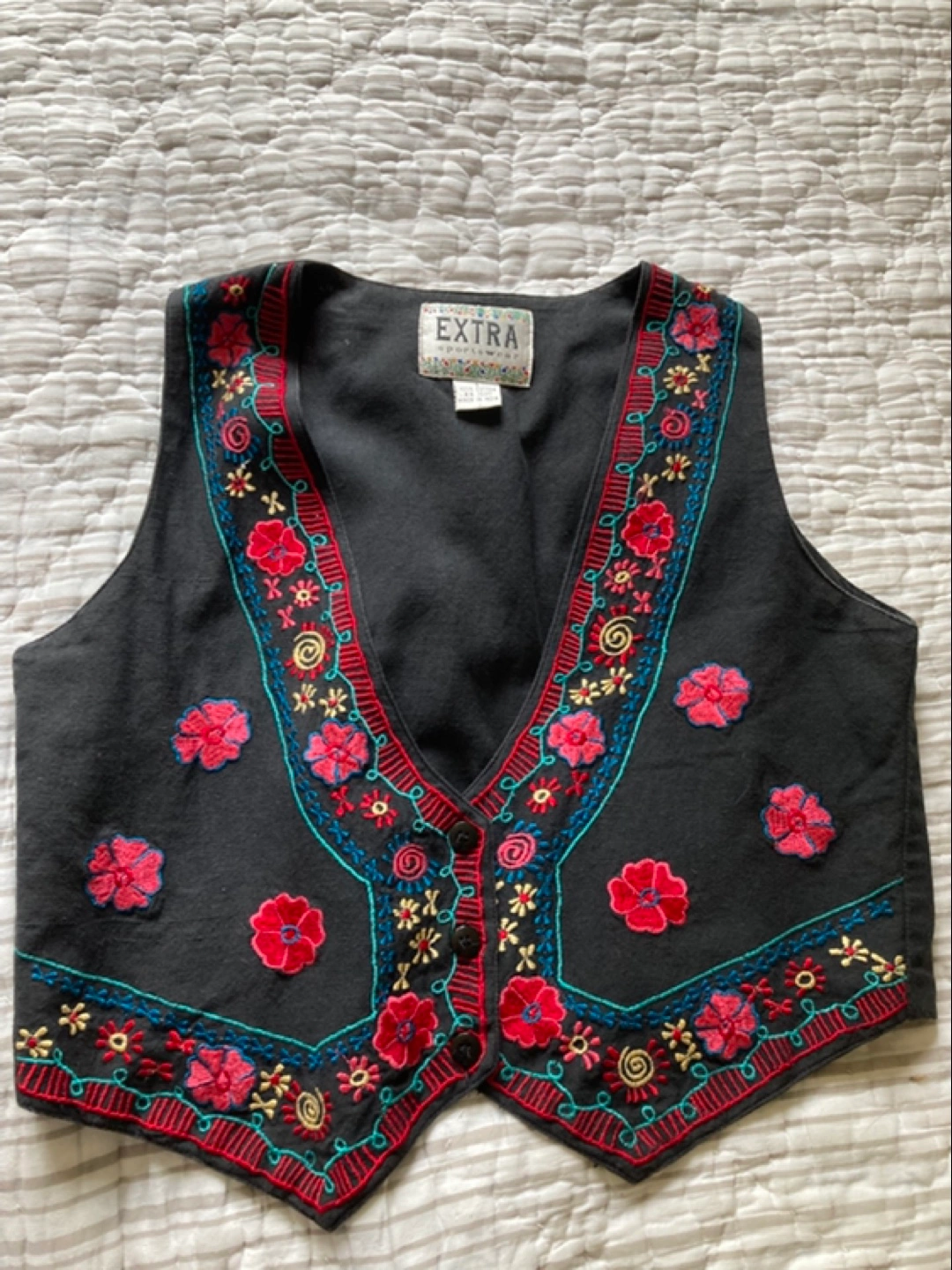 Black vest. Features colourful embroidered flowers. V-neckline and button closure. Perfect to wear over a basic tee or blouse for a relaxed, vintage look. Spring clothing purge in progress. Available for pickup, or I can also meet downtown as needed. 🌺 Please check out my other items too! 🥰