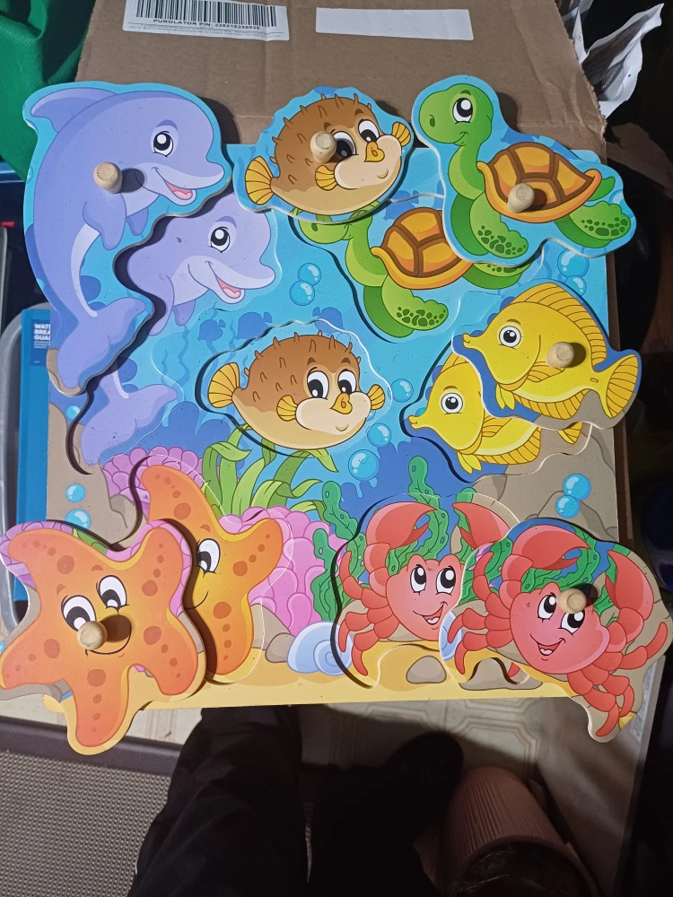 Wooden puzzle with a sea life theme featuring a dolphin, turtle, pufferfish, fish, starfish, and crab. The pieces have wooden knobs.