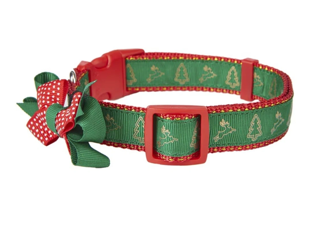 Festive dog collar with red and green design. Features a removable bow. Comes with a quick-release buckle and a strong metal D-ring. A perfect way to add some holiday cheer to your furry friend's wardrobe, so they can join in the fun and feel included.