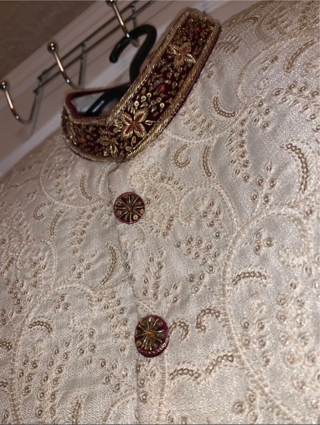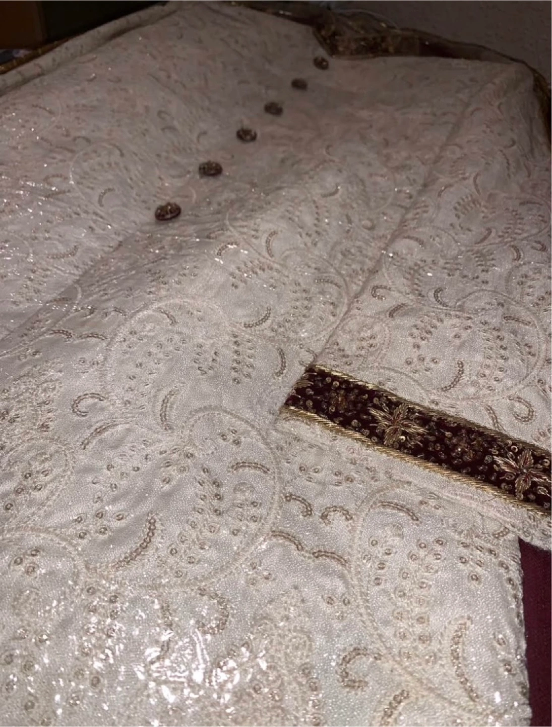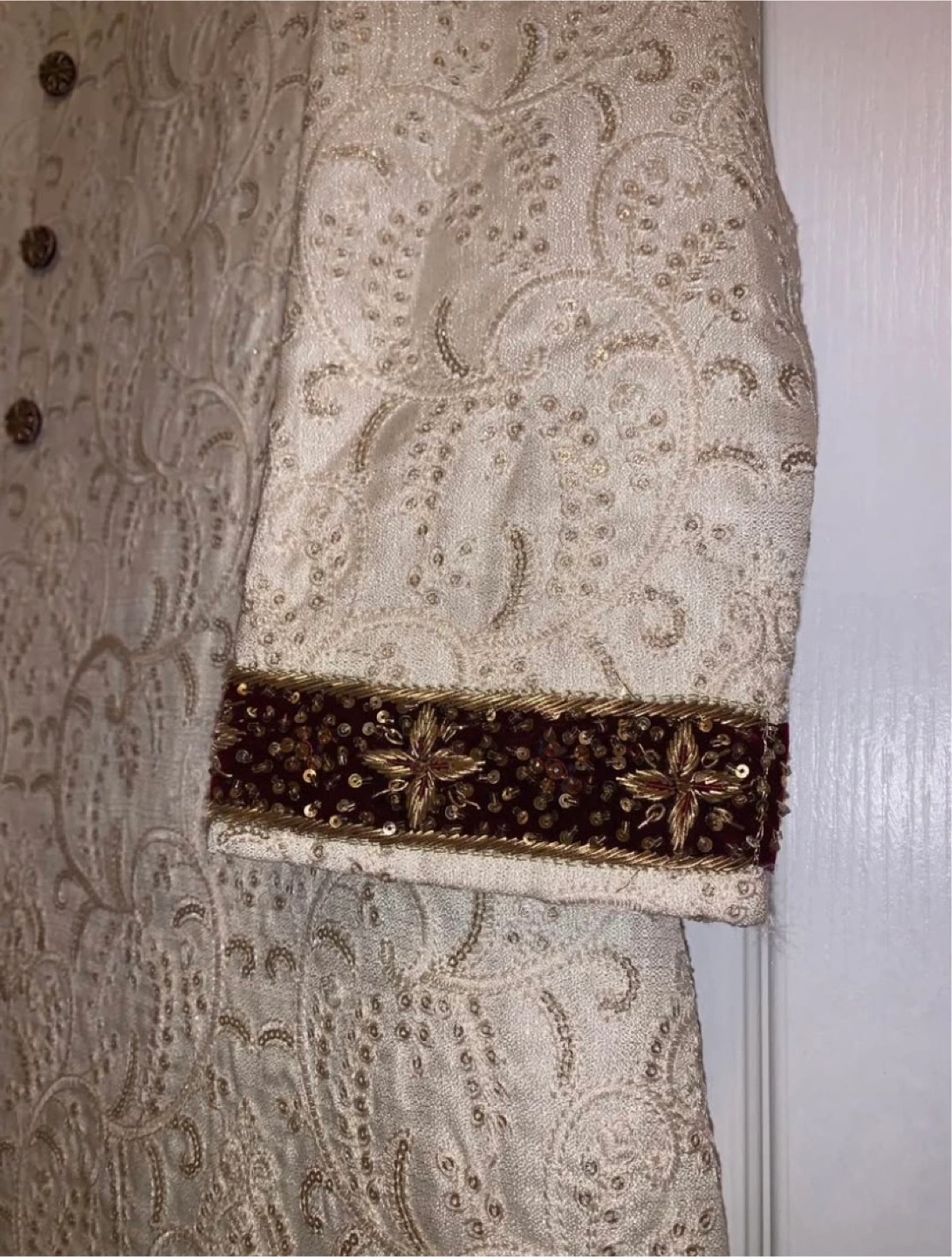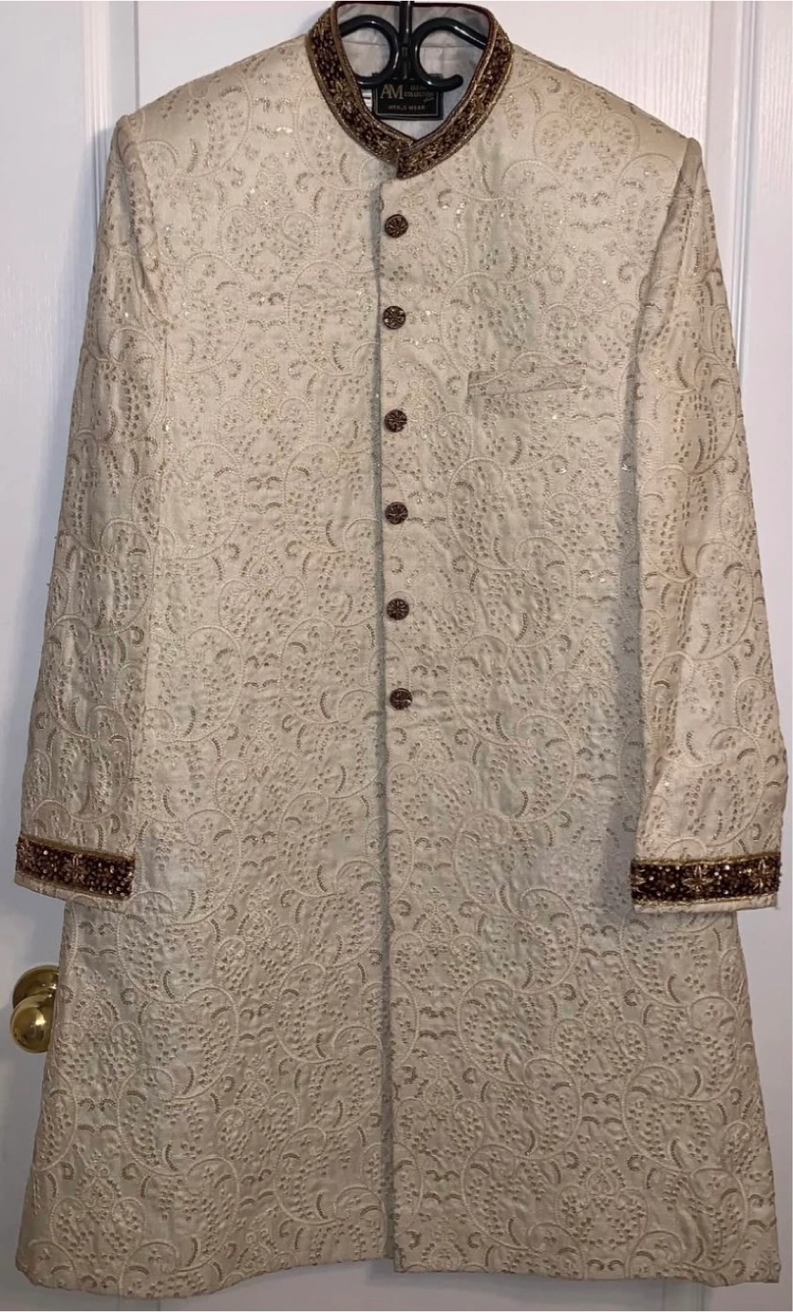 A beautiful, brand new Sherwani with intricate gold embroidery. This Sherwani features a sophisticated off-white color, accented by detailed gold work and complementary brown buttons. The mandarin collar and cuffs are beautifully embellished. Perfect for weddings, Eid, or any special occasion where you want to make a statement. Size [Large]. Never worn, in A1 condition. Asking [450$]. A steal for the quality and design! PRICE IS NEGOTIABLE