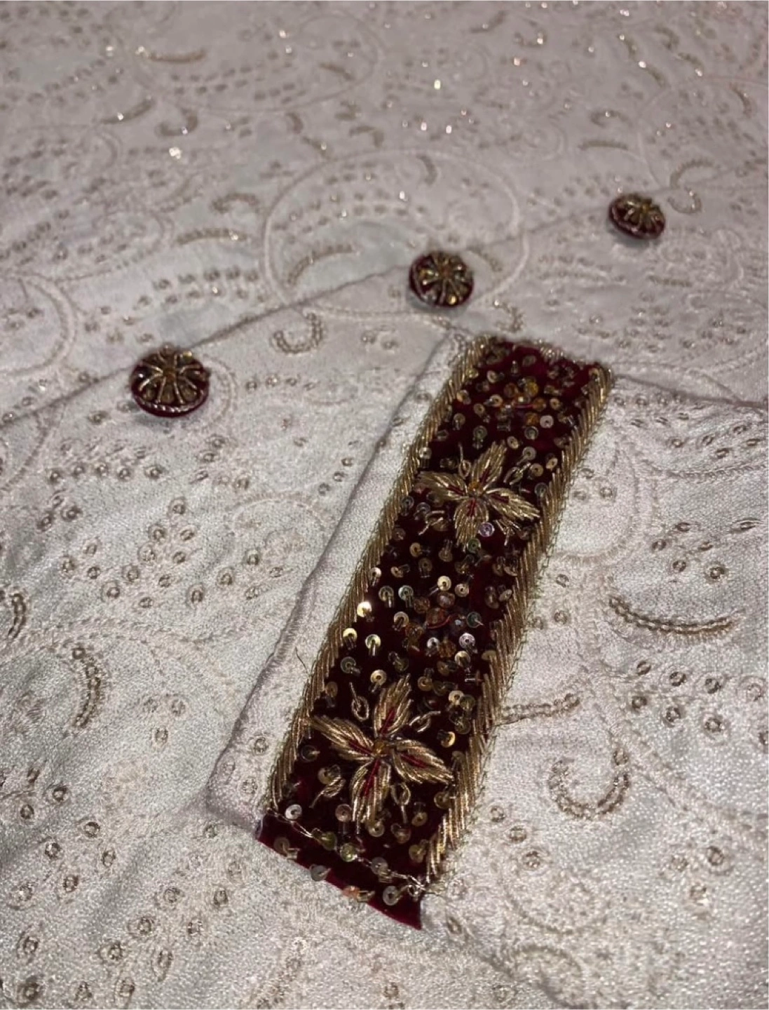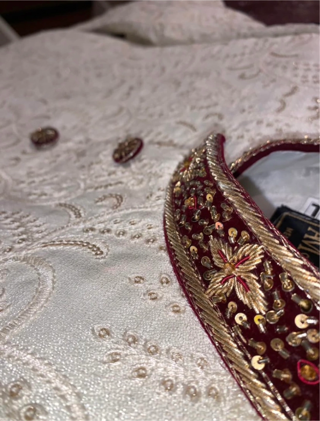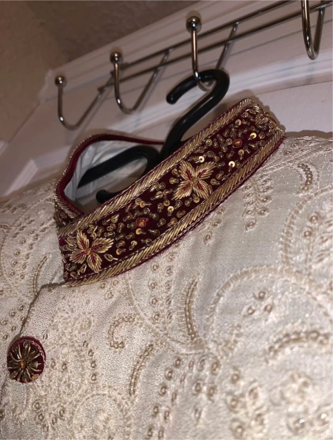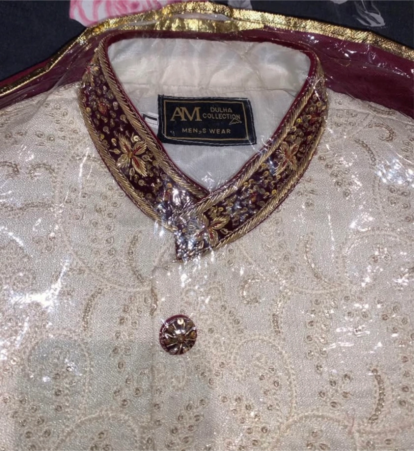 A beautiful, brand new Sherwani with intricate gold embroidery. This Sherwani features a sophisticated off-white color, accented by detailed gold work and complementary brown buttons. The mandarin collar and cuffs are beautifully embellished. Perfect for weddings, Eid, or any special occasion where you want to make a statement. Size [Large]. Never worn, in A1 condition. Asking [450$]. A steal for the quality and design! PRICE IS NEGOTIABLE