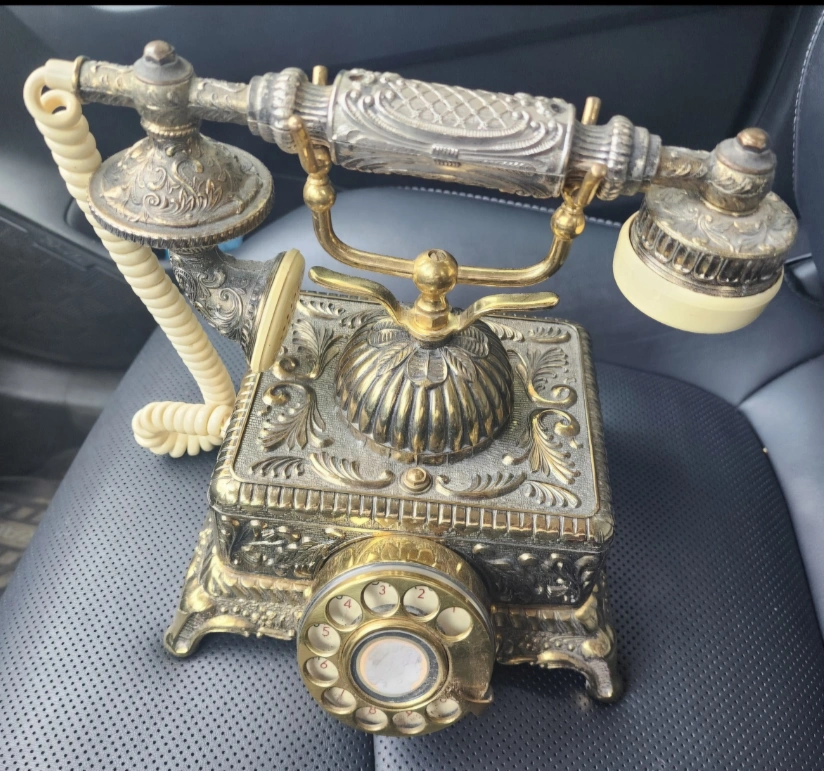 Elegant antique telephone. Features a rotary dial. The phone's body is highly ornamented, crafted from metal, and designed with intricate details. It has a handset connected with a coiled cord. Consider placing this vintage beauty on your desk to feel a sense of calm.